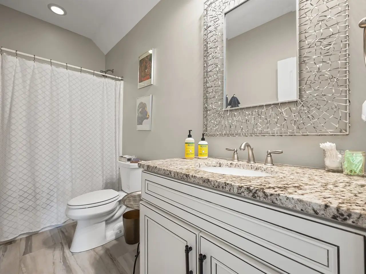 Welcome to this stunning home in Trinity Ridge. Perfectly situated on 1 acre in a quiet cul-de-sac, this 1.5-story home offers luxurious main-level living with thoughtful upgrades throughout. You'll find 4 spacious bedrooms on the main level, including a beautifully updated primary suite with a lighted tray ceiling, tiled shower, freestanding soaking tub, dual vanities and a private screened porch. The open-concept kitchen features a gas cooktop with pot filler, breakfast bar, large dining area and pantry. Elegant details shine throughout the home, from the coffered ceilings and built-ins to the cozy fireplace and formal dining room. Upstairs, enjoy a private guest suite with full bath and flex space. Exceptional outdoor living with a spacious screened porch with fireplace and dedicated half bath, a deck, brick patio and separate stone patio with pergola and wood-burning fireplace. Additional highlights include a huge laundry room with sink and a tankless water heater.