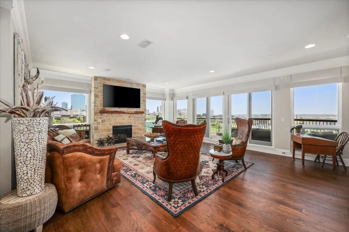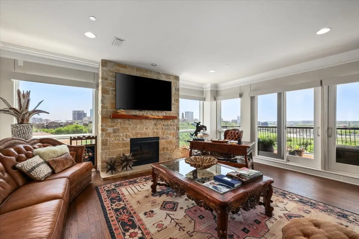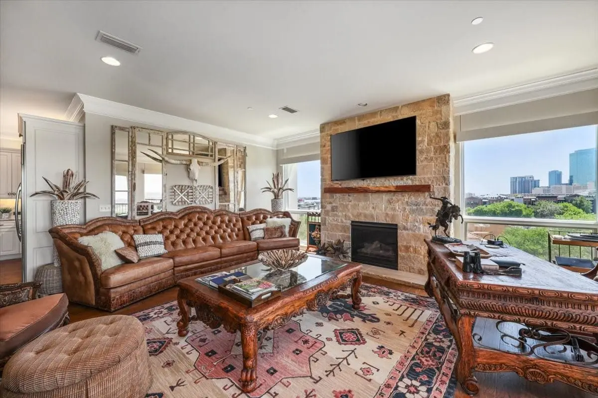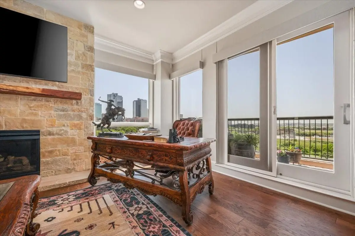 Rare 4-Bedroom Luxury Home in Villa de Leon, Fort Worth’s Riverfront Gem! Welcome to one of Fort Worth’s most exclusive residences - a rare 4-bedroom, 4.5-bath luxury condo in the iconic Villa de Leon, a premier boutique community with only 23 residences nestled along the scenic Trinity River. With just a handful of four-bedroom homes in the building, this is a truly an exceptional community. Step into a spacious, light-filled interior where floor-to-ceiling windows frame panoramic views of the river and downtown skyline. The open-concept living space features an elegant gas fireplace and opens to a private balcony - perfect for morning coffee or enjoying Fort Worth's fireworks and holiday lights. At the heart of the home is a chef's dream kitchen, showcasing an oversized island, custom-painted cabinetry, farmhouse sink, wine bar, and premium stainless-steel appliances - designed for entertaining in style. Each of the four bedrooms includes its own ensuite bath, ensuring ultimate privacy and comfort. The primary suite serves as a peaceful retreat, adorned with luxury finishes and spa-like amenities and beautiful views of downtown Fort Worth. Community Amenities Include: Resort-style pool and spa, Outdoor grilling & dining area, State-of-the-art fitness center, Elegant social lounge for private events, Secure underground parking & gated access, Located just minutes from Downtown Fort Worth's best dining, shopping, and cultural attractions, this home offers the perfect blend of urban sophistication and riverside serenity. Schedule your private showing today.