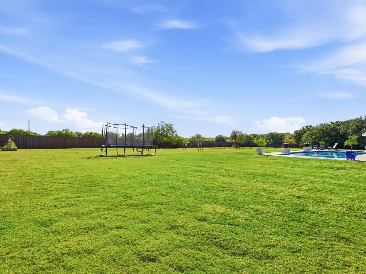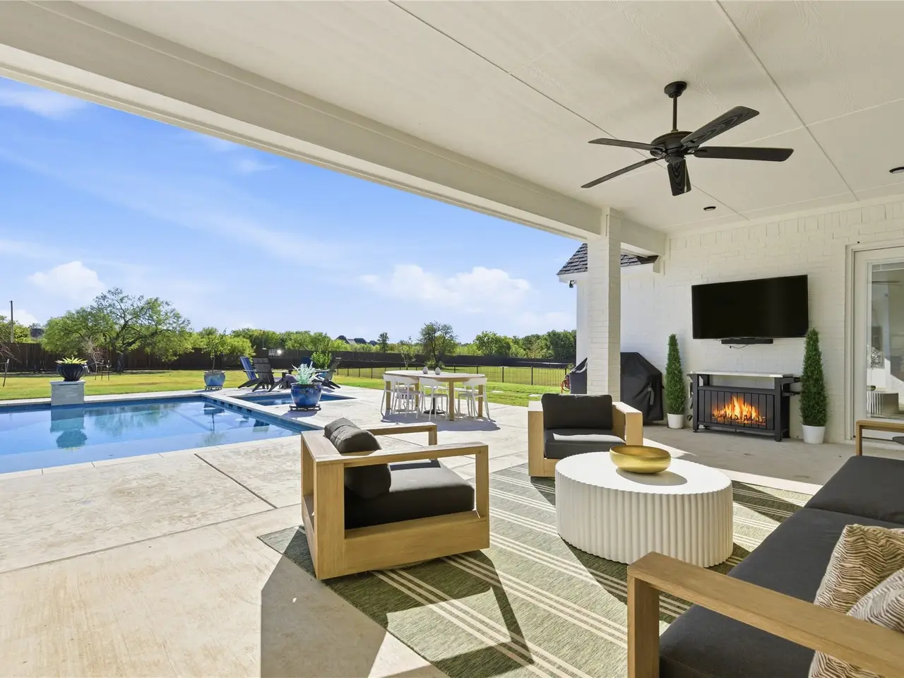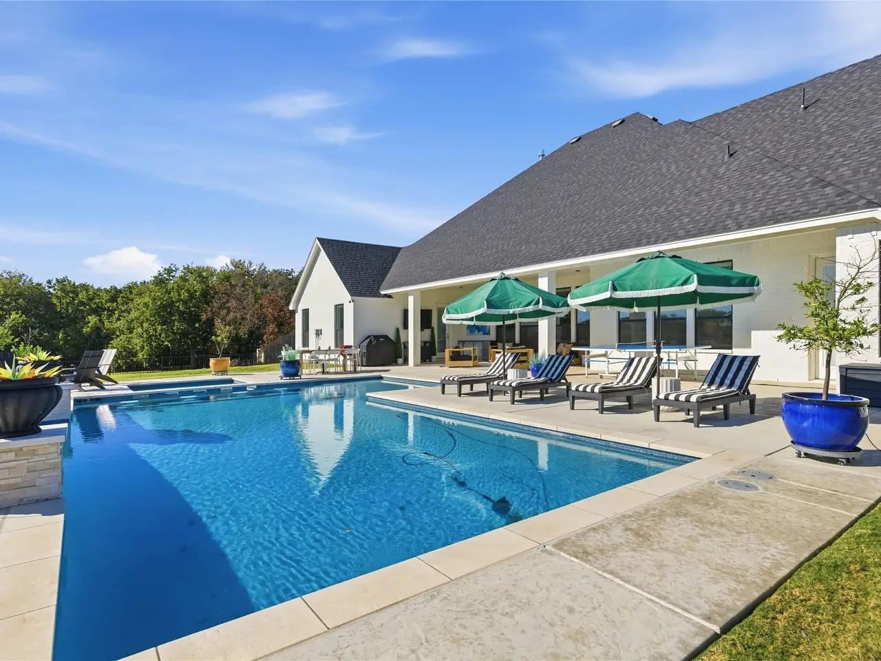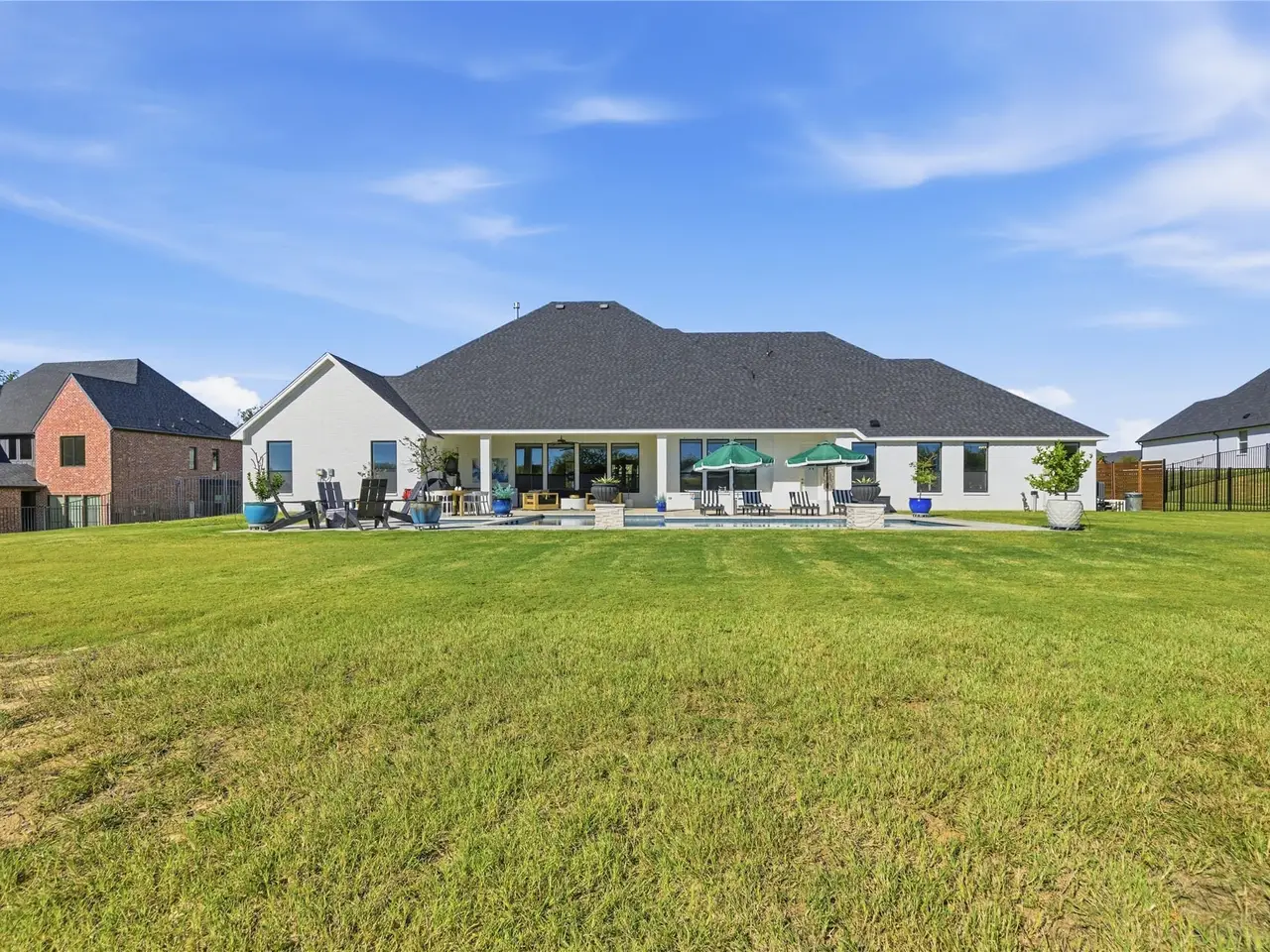 Experience luxury living on over an acre in Aledo ISD with this beautifully appointed home designed for comfort, style, and spacious indoor-outdoor living. A sweeping covered patio overlooks the resort-style pool and lush fenced yard, offering an ideal backdrop for entertaining or unwinding. The light-filled interior embraces an open layout anchored by a grand living room with a fireplace framed by custom built-ins. The elegant dining room showcases coffered ceilings, while the chef-inspired kitchen features quartz countertops, stainless appliances, gas cooktop, double ovens, butlers pantry, and a walk-in pantry. The breakfast room, with its charming built-in buffet and expansive backyard views, is the perfect everyday gathering space. A refined home office with French doors and full wall of built-ins provides the ideal work-from-home setting. The serene primary suite includes vaulted ceilings, a generous sitting area, and a spa-style bath with double vanities, soaking tub, separate shower, and a walk-in closet that conveniently connects to the oversized laundry room. Additional highlights include a second living room with a custom wet bar, a large storage closet, and a flexible bonus room that functions beautifully as a second office, nursery, or home gym.