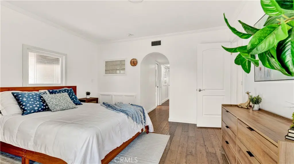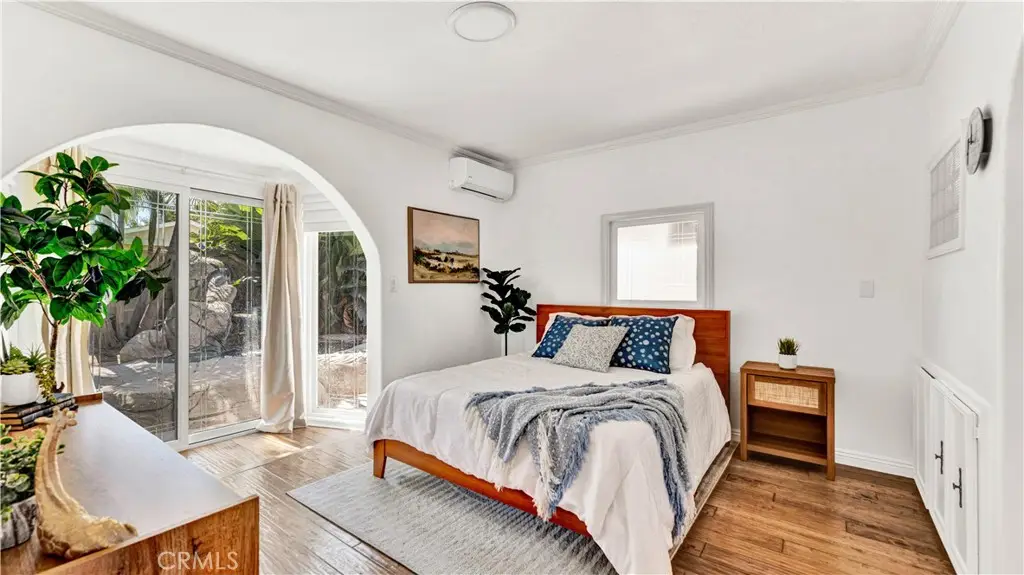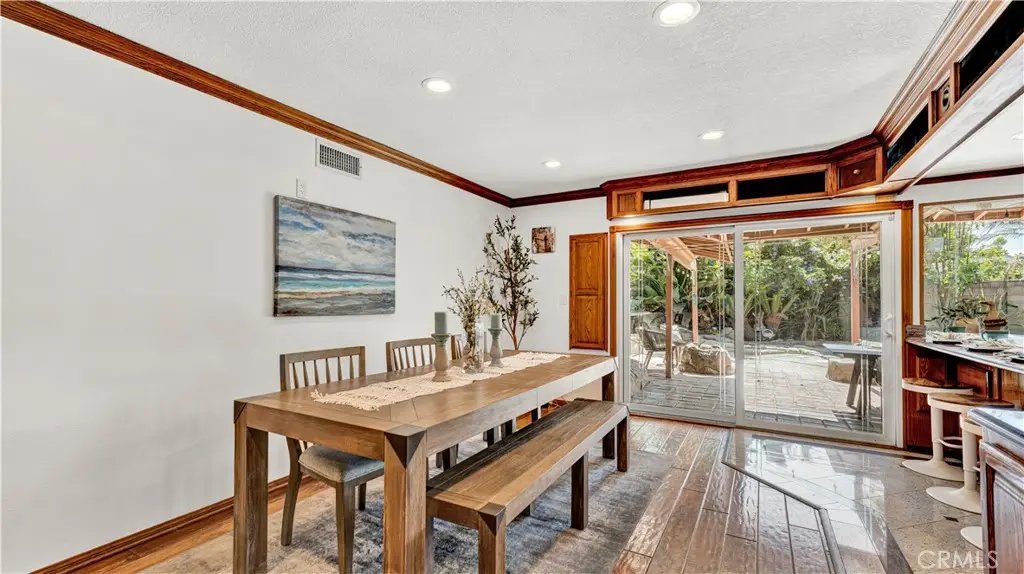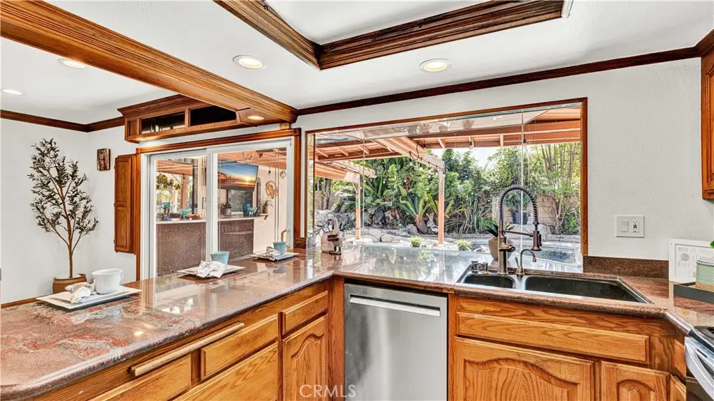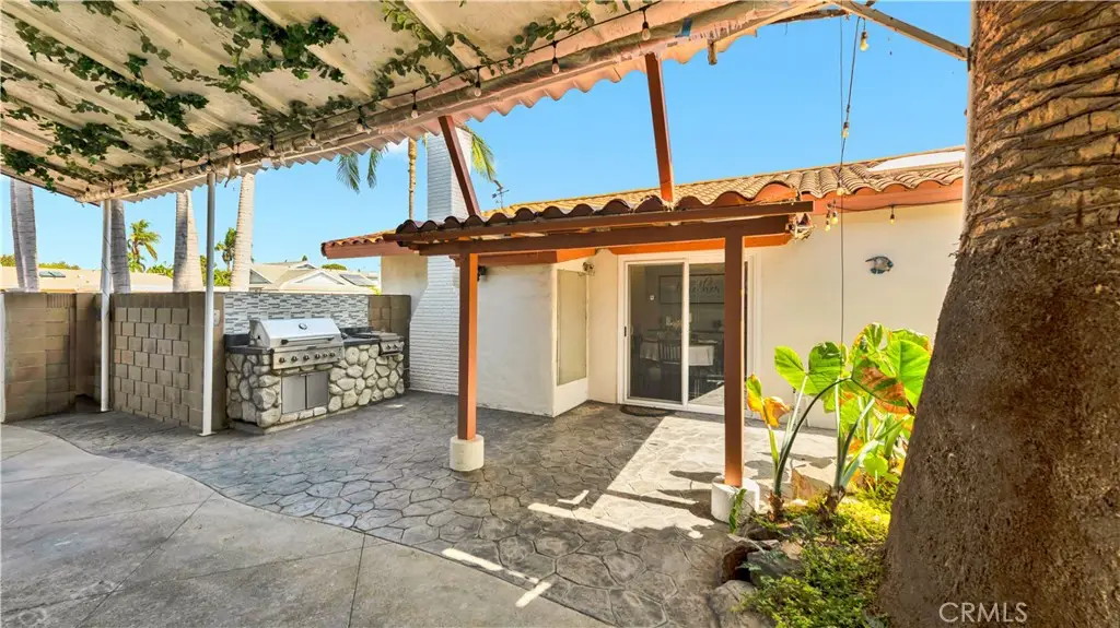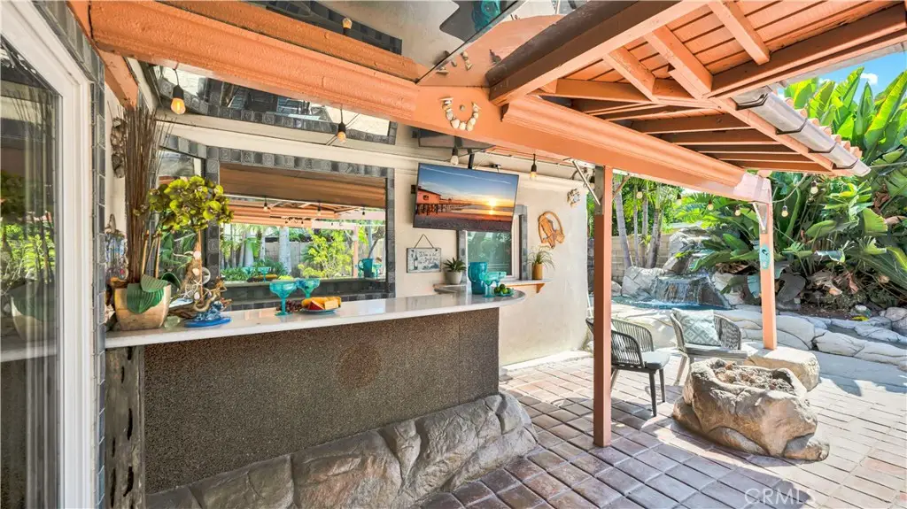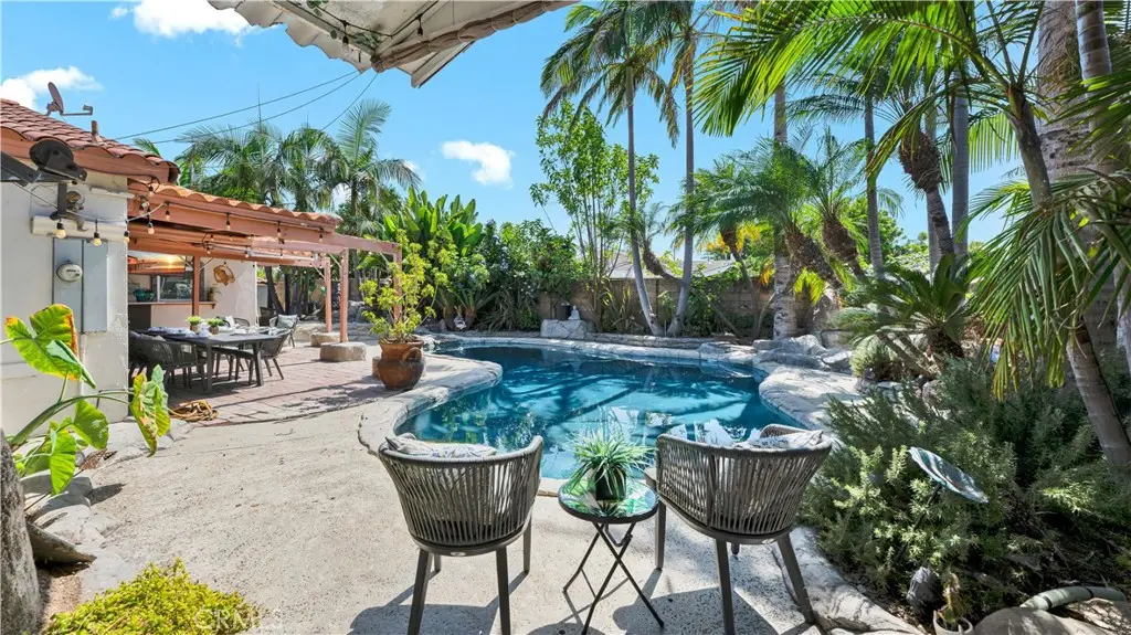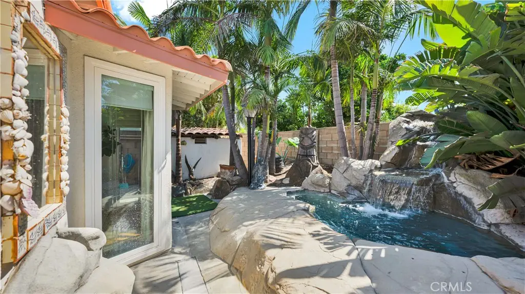 Absolutely unique and highly upgraded Spanish-style single story home on an interior cul-de-sac street just 4 miles from the beach and walking distance to neighborhood park with tennis, featuring 3 bedrooms, 2 baths, 1,509 square feet, finished garage, and an incredible 40-foot covered RV parking area with gated access--ideal for RV, boat, OR build an ADU - Home Comes with CITY APPROVED BLUEPRINTS for ADU. This home is an entertainer's dream, inside and out, showcasing a stunning tropical oasis backyard with sparkling pool and spa set into natural boulders, waterfalls, river feature connecting spa to pool, lava fire pit, extensive outdoor lighting, two covered patios, a wrap-around wet bar, built-in Lynx BBQ center with river rock surround, stamped concrete and paver decking, and lush mature landscaping with palm trees and block wall fencing. Step inside this remarkable home through a solid wood & beveled glass entry door that opens to a tiled foyer and an elegant formal living room with cathedral open-beam ceiling, custom fireplace, decor niches, and French doors leading to the backyard. The spacious family room boasts hardwood plank flooring and custom oak built-ins with glass display cabinets, wine storage, wine cooler, and buffet counter, flowing seamlessly to the remodeled kitchen with granite countertops, stainless steel appliances, tile backsplash, breakfast bar, pantry, and a frameless bay window overlooking the resort-style yard. The luxurious primary suite offers French doors to the spa, a large walk-in closet with custom organizers, and a spa-like bath with skylight, huge steam shower with seating, vanity area, and heated toilet. The guest bath features glass block accents and an oversized jetted soaking tub, and skylight. Additional amenities include dual pane windows, plantation shutters, arched passages, recessed lighting, central A/C, and a finished garage with epoxy flooring, built-in storage cabinets, pull-down ladder to attic storage, and washer/dryer hookups. A one-of-a-kind property blending comfort, function, and resort living in one of the area's most desirable neighborhoods with award-winning schools.