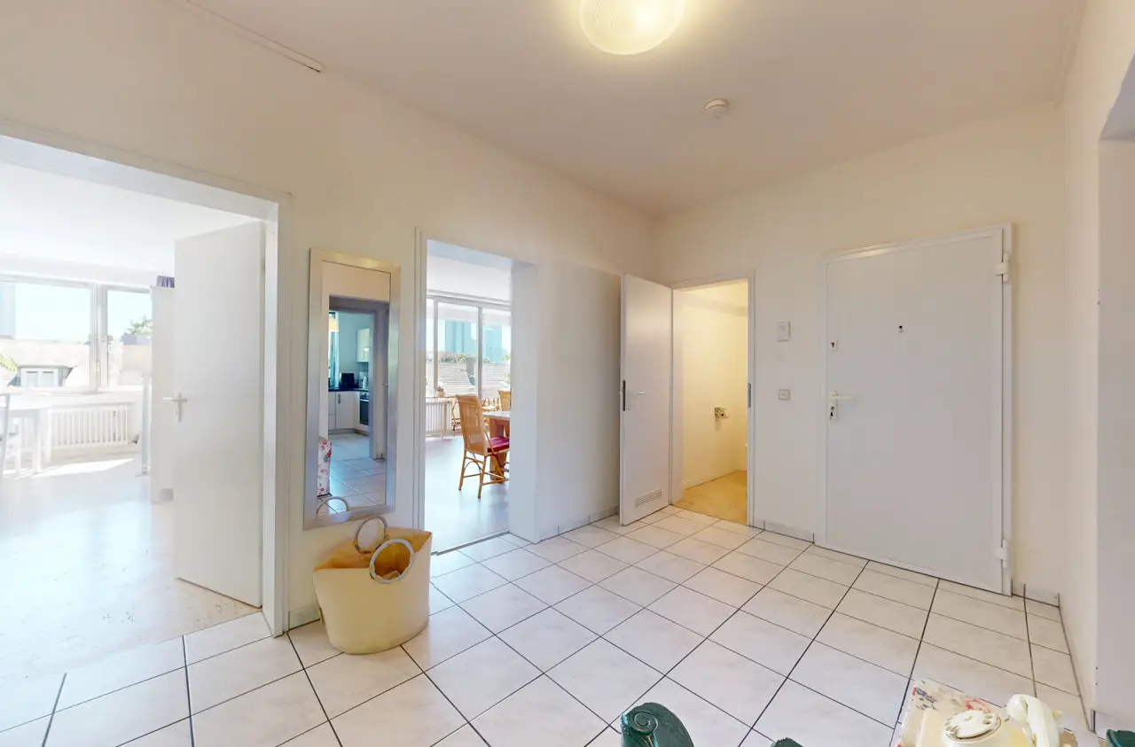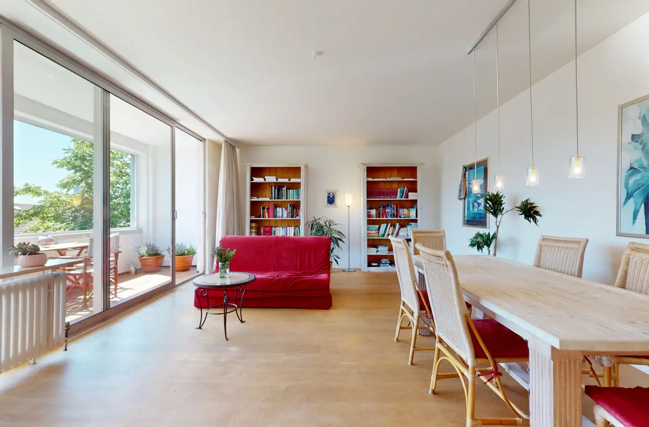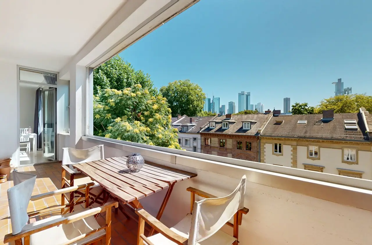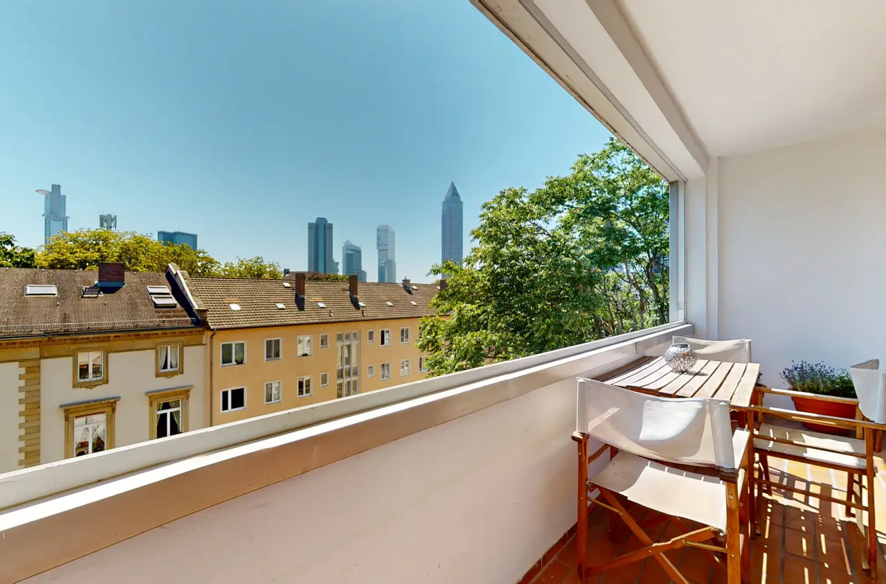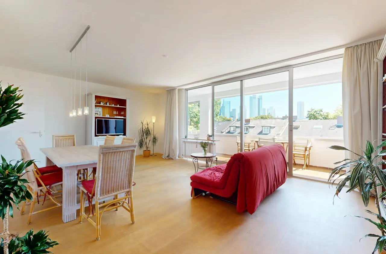 This light-flooded three-room apartment is located on the 5th floor of a well-kept apartment building and is easily accessible by elevator. The picturesque Palmengarten, Grüneburgpark and Frankfurt's lively city center are just a few minutes' walk away. The sought-after location in Westend boasts an excellent infrastructure with numerous shopping facilities, cozy restaurants, excellent public transport connections and green retreats in the immediate vicinity. The apartment has two well-designed bedrooms and a spacious living/dining area with an open-plan layout that invites you to linger. From here, you have direct access to the sunny loggia, which offers a magnificent view of the Frankfurt skyline. Large window fronts in all rooms create a bright, friendly living atmosphere and underline the pleasant feeling of space. Another highlight is the lovingly landscaped communal garden, which is available to all residents and invites them to relax in the greenery. Six parking spaces are jointly owned by the apartment owners. This apartment has the right to use one parking space.