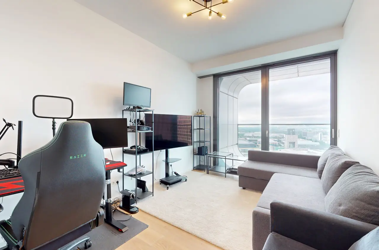 This absolute premium apartment is located on the fortieth floor of the Grand Tower, currently Germany's tallest residential tower at 180 meters - the most sought-after landmark building in Frankfurt. The transparent architecture, reminiscent of honeycombs, and the floor-to-ceiling windows offer airy living and magnificent views. The living/dining area is flooded with light and features curved glass fronts. From here, you have access to the balcony with all-round glass balustrade and views of Frankfurt and its skyline, as well as the Taunus and the entire surrounding area. The three bedrooms, one of which has its own balcony, offer great and practical living space. The communal Grand Garden on the seventh floor with lounge areas and herb garden and the Sunset Terrace on the 43rd floor invite you to relax and provide a communicative, urban atmosphere and magnificent views of the sunsets. The 24-hour concierge service and the Club Kitchen on the seventh floor are further highlights of this exceptional apartment. An underground parking space is included in the purchase price. The apartment is ideal for singles, couples or small families with up to one child who appreciate urban living in the Grandtower, combined with a high level of living comfort and communal areas for relaxing.