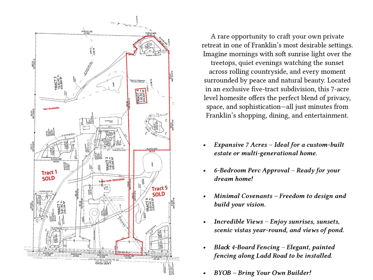 Once-in-a-Lifetime Opportunity - Build Your Dream Home on 7 Stunning Level Acres in Franklin, TN! Imagine waking up to the gentle glow of the sunrise, sipping coffee as mist rises off the tree line, and ending your day with a breathtaking sunset over rolling countryside. This is more than just land--it's a rare chance to create your own peaceful retreat in an exclusive 5-tract subdivision featuring expansive lots, upscale living, and the charm of country serenity--all just minutes from shopping, dining, and entertainment in Franklin. Endless Possibilities Await! Sprawling 7 Acres - Plenty of space for your custom-built estate, 6-Bedroom Perc Approval - Build the home of your dreams with room for everyone, Minimal Covenants - Enjoy the freedom to create your vision without excessive restrictions, Incredible Views - Wake up to sunrises and sunsets that belong to you. The Perfect Blend of Privacy & Convenience. Feel miles away from the world while being just moments from Franklin's vibrant amenities, top-rated schools, and easy access to I-65. This is more than land--it's the foundation for your future. Don't miss your chance to own something truly special! Future residence structures shall be no less than 4,300 sq ft above grade construction. Black 4 board, painted black fencing along Ladd Road already installed. Bring Your Own Builder and Build Your Dream Home!