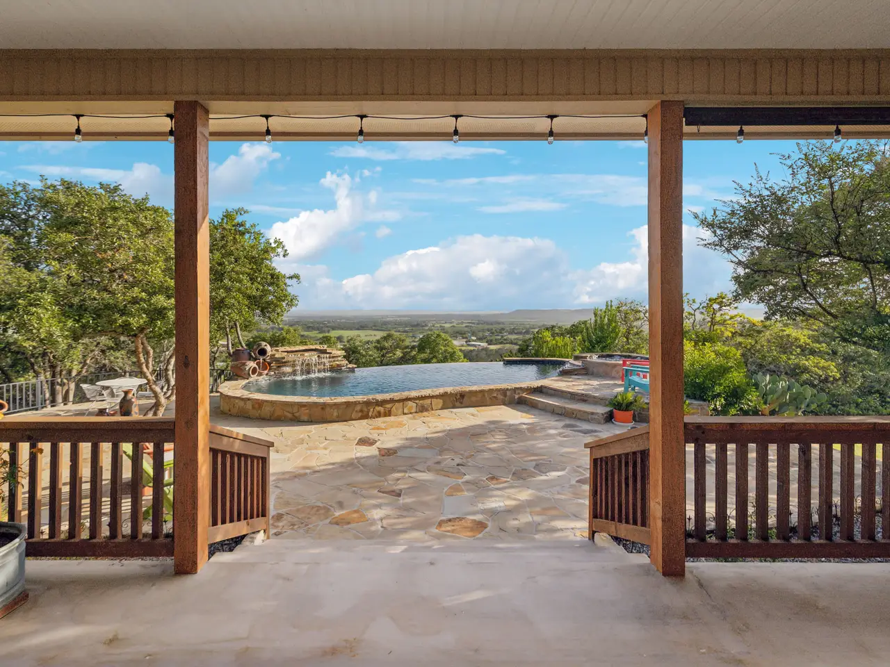 Discover the pinnacle of Hill Country elegance with this exquisite Tuscan-style estate, custom-designed by J. Long Sr. Nestled atop 4.935 acres of pristine, private land, this serene retreat is just five minutes from Fredericksburg's charming Main Street. Upon arrival, you're greeted by a breathtaking barrel-ceiling foyer, meticulously crafted with hand-selected materials, setting the tone for the home's unique architectural beauty. Gleaming wood floors lead you through the warm and sophisticated interiors. Boasting 3 bedrooms, 2 full baths, and 1 half bath, the thoughtful layout offers abundant space for relaxation. Cedar beams grace the doorways and kitchen ceiling, adding rustic charm, while custom alder wood cabinetry enhances the kitchen, office, and bathrooms with timeless craftsmanship. The chef's kitchen features 12-foot cedar beam ceilings, granite countertops with hand-chiseled edges, a chef's island with a built-in Whirlpool oven, and an Italian Hallman gas range with dual electric ovens and warming drawer. Top-tier appliances include a Bosch dishwasher, a custom GE Monogram stainless steel fridge and freezer, and a reverse osmosis water filtration system. The sunlit breakfast nook, adorned with UV-rated plantation shutters, combines style with energy efficiency. In the living room, floor-to-ceiling windows frame sweeping views of the infinity-edge pool and Hill Country beyond. A soaring 20-foot ceiling and a custom rock wall with a wood-burning fireplace crowned by a mesquite wood mantle create a grand yet inviting atmosphere. The primary suite offers a sanctuary of comfort with crown-molded ceilings, private patio access, a whirlpool tub, separate shower, dual vanities, and a large walk-in closet with an additional bonus room for storage or retreat. Two spacious secondary bedrooms provide privacy, with one featuring a charming loft for a whimsical touch. The bright office, located near the entry, doubles as a potential fourth bedroom with its elegant French doors. Outside, the estate's gated entrance ensures privacy while lush landscaping and mature trees blend seamlessly into the natural surroundings. The heated infinity-edge pool and hot tub create an idyllic outdoor haven, perfectly complementing the panoramic vistas. The oversized 2-car garage with ornate wooden doors offers ample space, while a 25x50-foot insulated metal RV shed accommodates larger vehicles or hobbies. Additional storage comes from a 12x16-foot wooden outbuilding. A second well-equipped building site, complete with its own well and electricity, offers potential for a guest casita or bed and breakfast. Experience the ultimate blend of luxury, seclusion, and convenience in this remarkable home that truly defines Hill Country living.