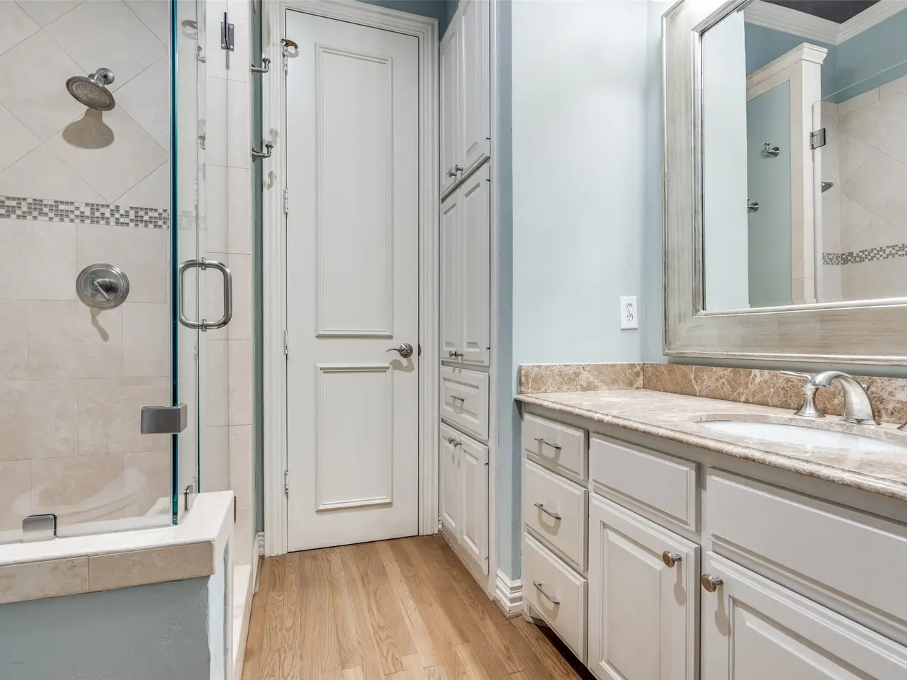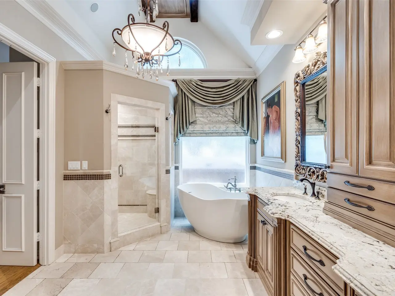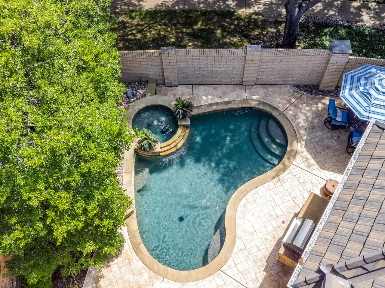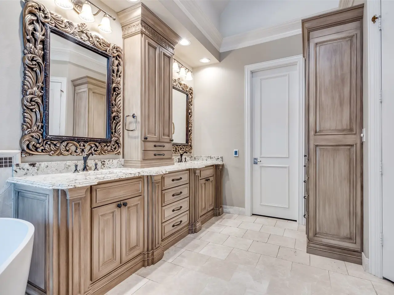 Fantastic zero lot line in the lovely Stonebriar Village, a gated and guarded community with TWO PRIMARY suites & TWO STUDIES. Second floor was completely remodeled in 2023. The second-story primary bath features quartz countertops, lighted mirrors, ceramic tile flooring, a large walk in shower, garden tub, and a linen closet. This primary suite also includes a huge closet (measures 12 x 10). Additionally the suite has hardwood flooring, a separate office with a wall of built-ins and shelves above, and a 155 sq feet of a sunroom that makes a great TV or sitting room with incredible views of tons of trees and creek area. Don't miss upstairs guest room. It has a ensuite bath with lighted mirror and quartz! First floor primary has been remolded in 2019 with granite countertops, a tower, dual sinks, free-standing elegant tub, a custom closet, and a large walk in shower! Heated flooring in both primary baths! Chef's kitchen with extended island, granite countertops, Viking Appliances, double ovens, a built-in subzero refrigerator, a large walk-in pantry and a reverse osmosis water filtration system. The wrap-around breakfast bar seats up to 5 people. Large breakfast room that views the resort style outdoor living area is open to the family room! Formal study (or could be 4th bedroom) with adjacent full bath, French doors, closet, a wall of built-ins. No carpet in this great home, hardwood floors and ceramic tile throughout. Great wine storage with wine cooler. Two attics with walk in storage. Security and Sprinkler systems! Double garage has epoxy flooring, and custom cedar door. Extensive landscaping with stone borders. A whole house Generac generator, a Culligan water softener system, and a Moen water safety system stay with the home. Seller prides in taking care of the home.