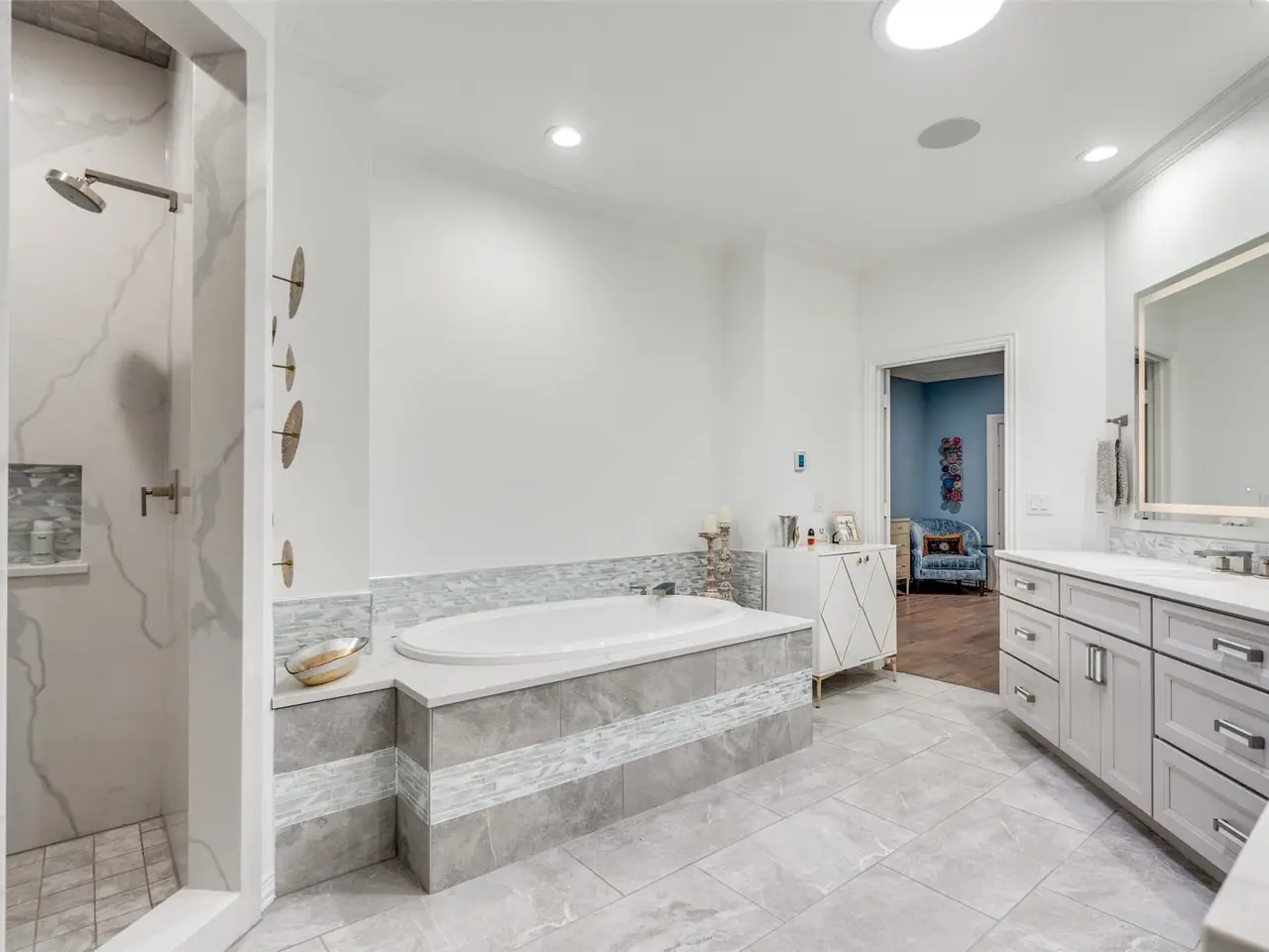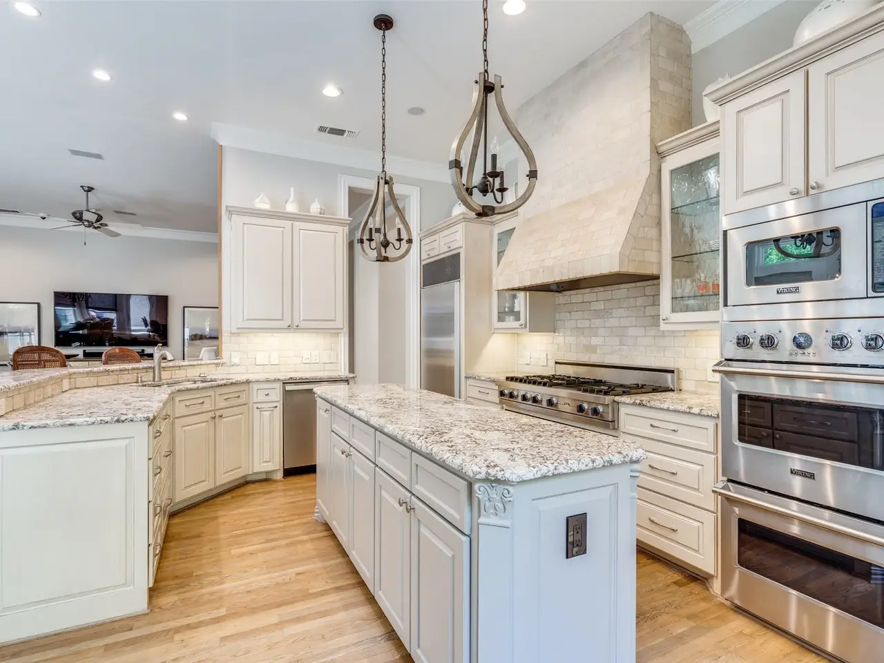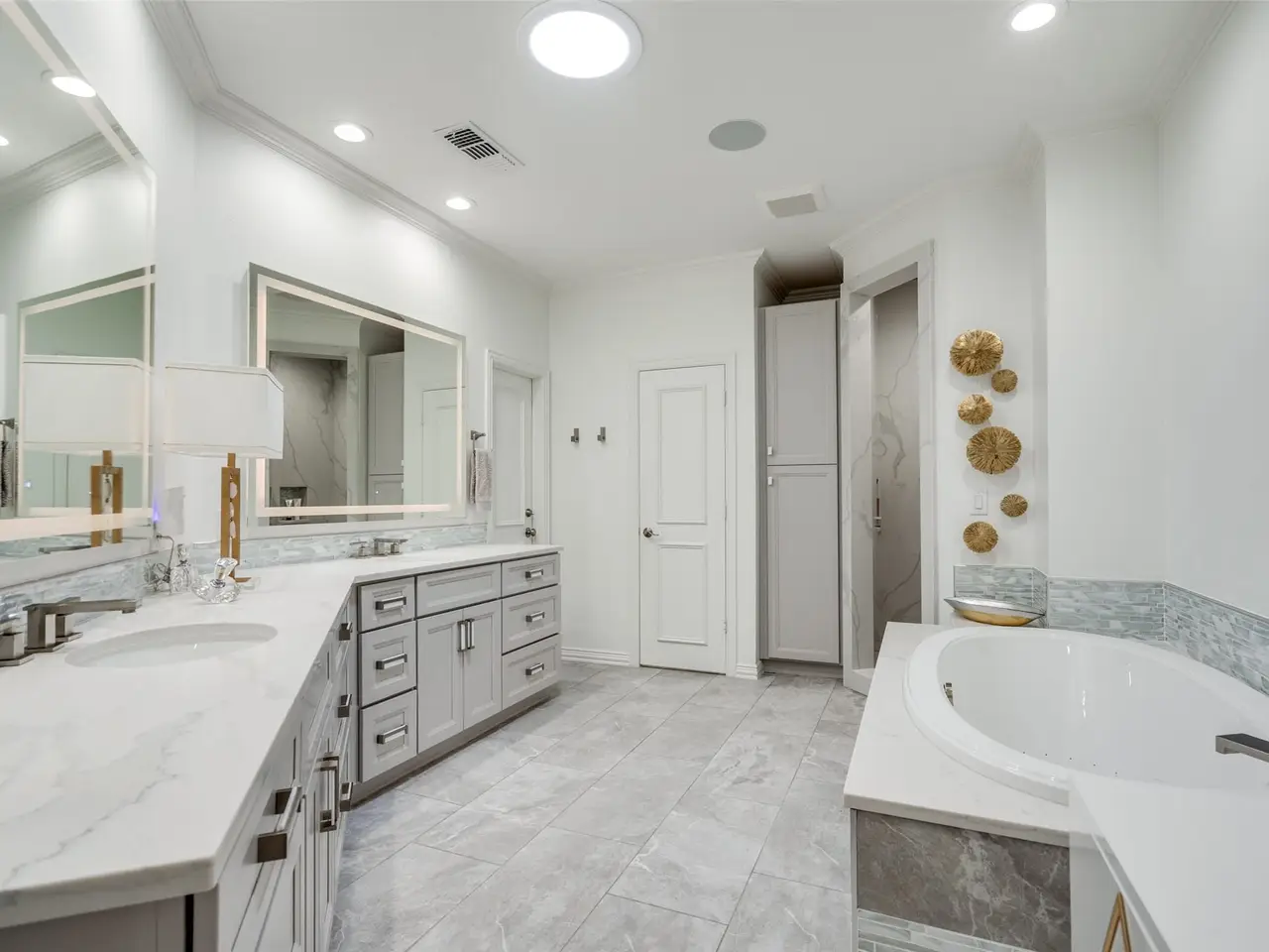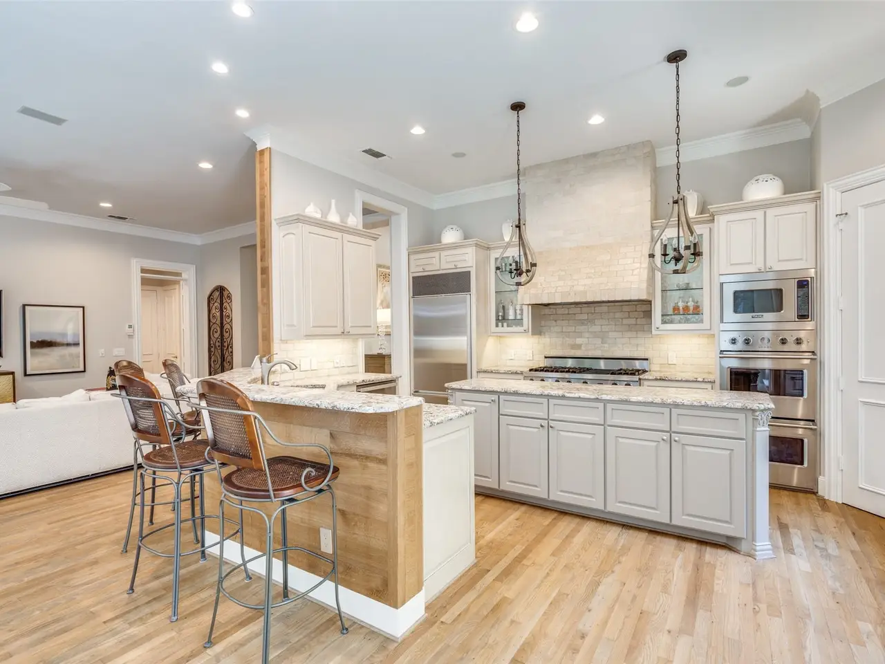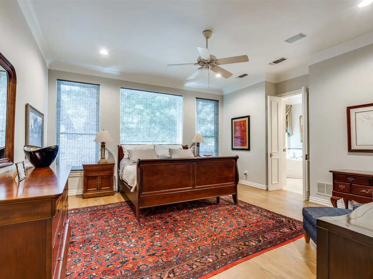 Fantastic zero lot line in the lovely Stonebriar Village, a gated and guarded community with TWO PRIMARY suites & TWO STUDIES. Second floor was completely remodeled in 2023. The second-story primary bath features quartz countertops, lighted mirrors, ceramic tile flooring, a large walk in shower, garden tub, and a linen closet. This primary suite also includes a huge closet (measures 12 x 10). Additionally the suite has hardwood flooring, a separate office with a wall of built-ins and shelves above, and a 155 sq feet of a sunroom that makes a great TV or sitting room with incredible views of tons of trees and creek area. Don't miss upstairs guest room. It has a ensuite bath with lighted mirror and quartz! First floor primary has been remolded in 2019 with granite countertops, a tower, dual sinks, free-standing elegant tub, a custom closet, and a large walk in shower! Heated flooring in both primary baths! Chef's kitchen with extended island, granite countertops, Viking Appliances, double ovens, a built-in subzero refrigerator, a large walk-in pantry and a reverse osmosis water filtration system. The wrap-around breakfast bar seats up to 5 people. Large breakfast room that views the resort style outdoor living area is open to the family room! Formal study (or could be 4th bedroom) with adjacent full bath, French doors, closet, a wall of built-ins. No carpet in this great home, hardwood floors and ceramic tile throughout. Great wine storage with wine cooler. Two attics with walk in storage. Security and Sprinkler systems! Double garage has epoxy flooring, and custom cedar door. Extensive landscaping with stone borders. A whole house Generac generator, a Culligan water softener system, and a Moen water safety system stay with the home. Seller prides in taking care of the home.