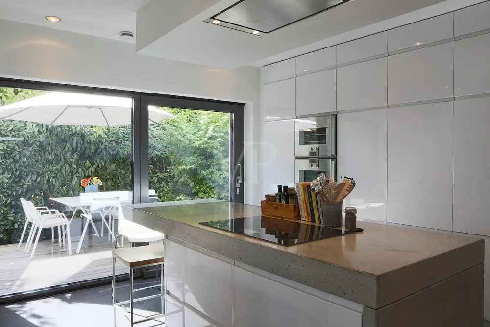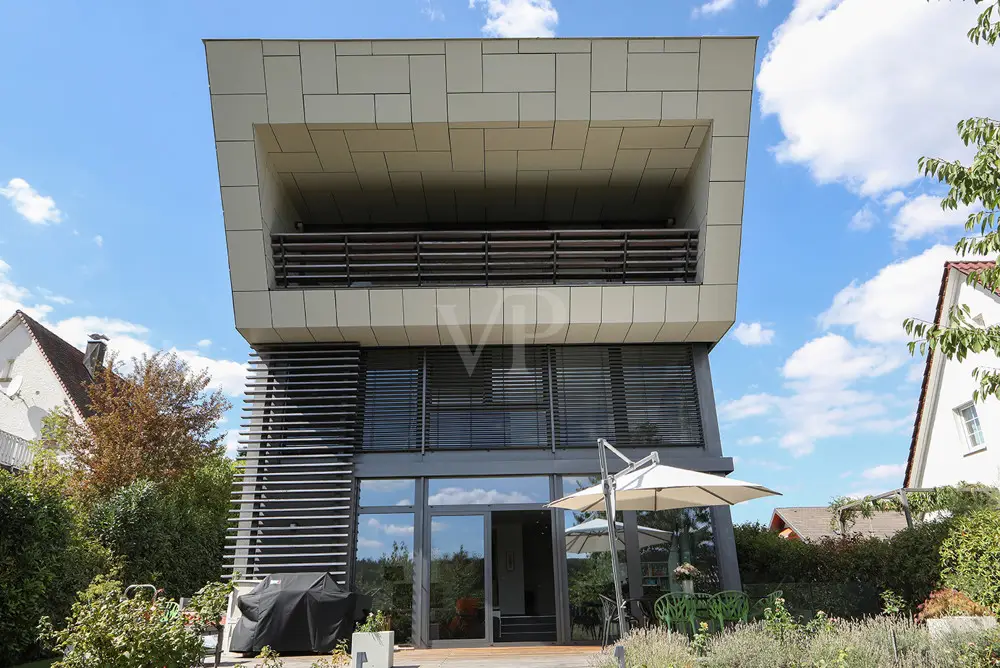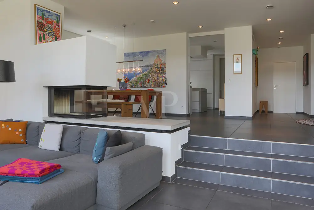 Unique architect's house in a top location in Gaggenau. Dreamlike jewel, with approx. 320 m² of living space and fantastic views, offering you and your family luxurious and peaceful living. But also the opportunity to work in the office in a quiet location. The luxurious standard is reflected in the attention to detail. There are numerous exclusive special features and high-quality detailed solutions that make this property unique. Starting with the room-high glass fronts with triple glazing as windows and as doors to the terrace, high-quality exterior blinds, hardwood flooring on the terraces, large-format stoneware on the ground floor, controllable lighting system with downlights embedded in the ceiling throughout the house. Open fireplace as one of the highlights in the living/dining area. A high-quality kitchen with Gaggenau appliances and outdoor terrace directly in front of the kitchen. Extravagant wooden floorboards on the upper floor. Studio with adjoining spacious and sunny roof terrace. Large fitness room with saunas and associated wet/sanitary area. The house has a total of 3 floors and a basement. In the basement you will find the technical and storage rooms as well as a utility room. There is also a bright and spacious fitness area, which could easily be designed as a private gym with saunas and the corresponding wet rooms. You can access the first floor via the sheltered and covered entrance area or through the large double garage into a separate hallway area which leads you through the hallway to the kitchen or down the stairs to the basement. On the first floor, you enter the spacious and very bright living and dining area through the vestibule, with two levels, the open fireplace as a room divider and direct access to the south-facing terrace. The open kitchen to the dining area leaves nothing to be desired and is equipped with Gaggenau appliances. In front of the kitchen you have a spacious terrace which you can also access from the kitchen. The staircase takes you to the 1st floor with the enclosed area of the master bedroom, the dressing room and the associated bathroom en suite. There are also two further large rooms on this level with their own balcony, a bathroom, a further utility room and a large open space. The large studio with loggia and fantastic views can be reached via the hallway and staircase. This studio is currently used as a private office space. Directly adjacent to the studio is the very large roof terrace with storage rooms, water connections etc. This terrace invites you to treat yourself to an undisturbed sunbath or to enjoy the sunset. The entire property is fenced, in the area facing the quiet residential street with a large wall and the electrically operated access gate and in the remaining area the property boundaries are secured and overgrown with a hedge. The south-facing terrace is covered with wooden planks and extends across the entire width of the house and, like everything else, is generously proportioned. Steps lead up to the lawned part of the garden. This description is only an excerpt. Only a personal viewing will allow you to fully experience the charm and quality of the property and discover many other details.