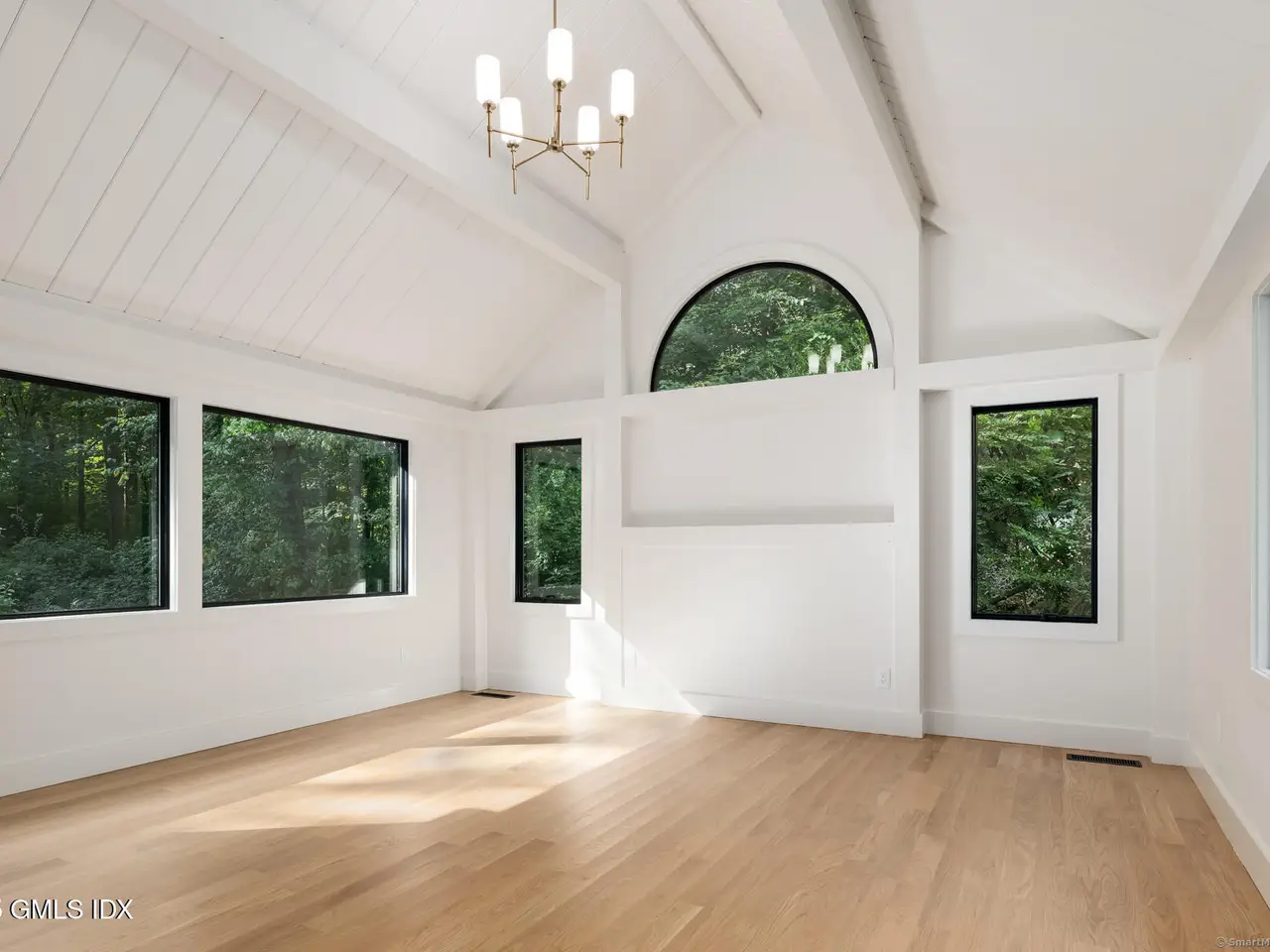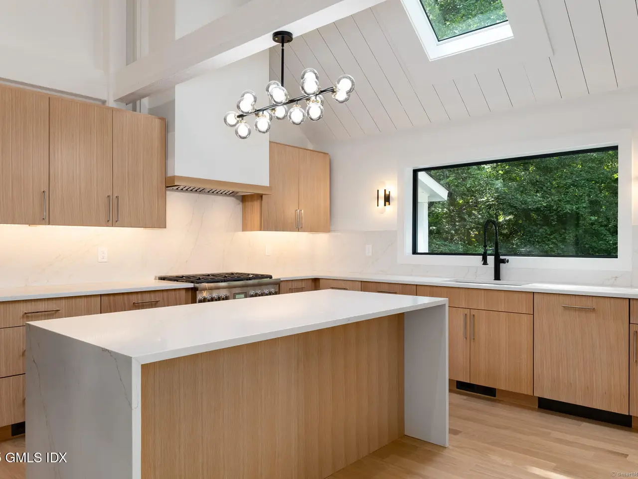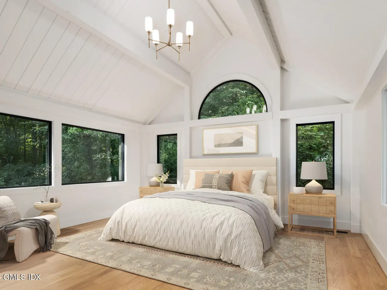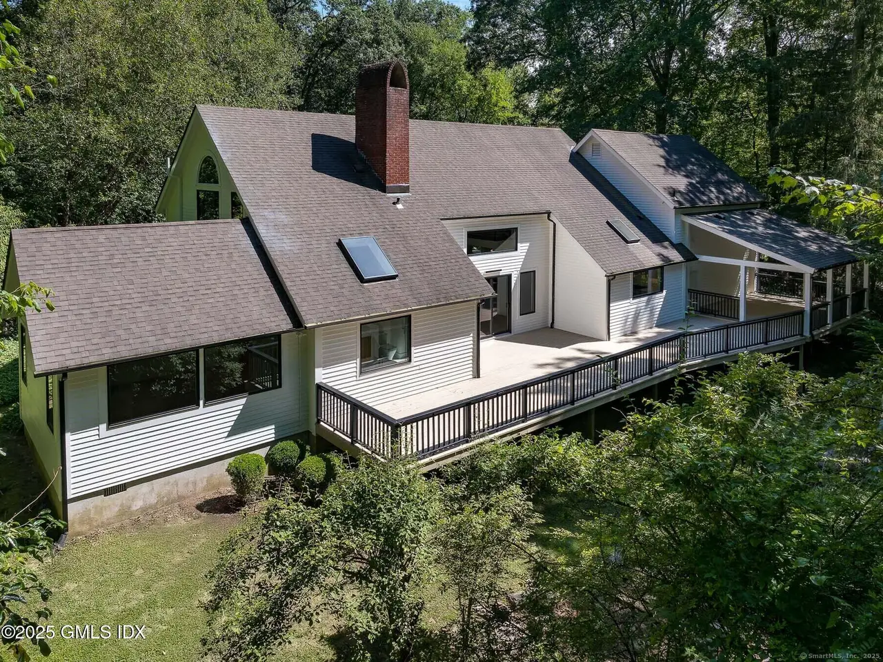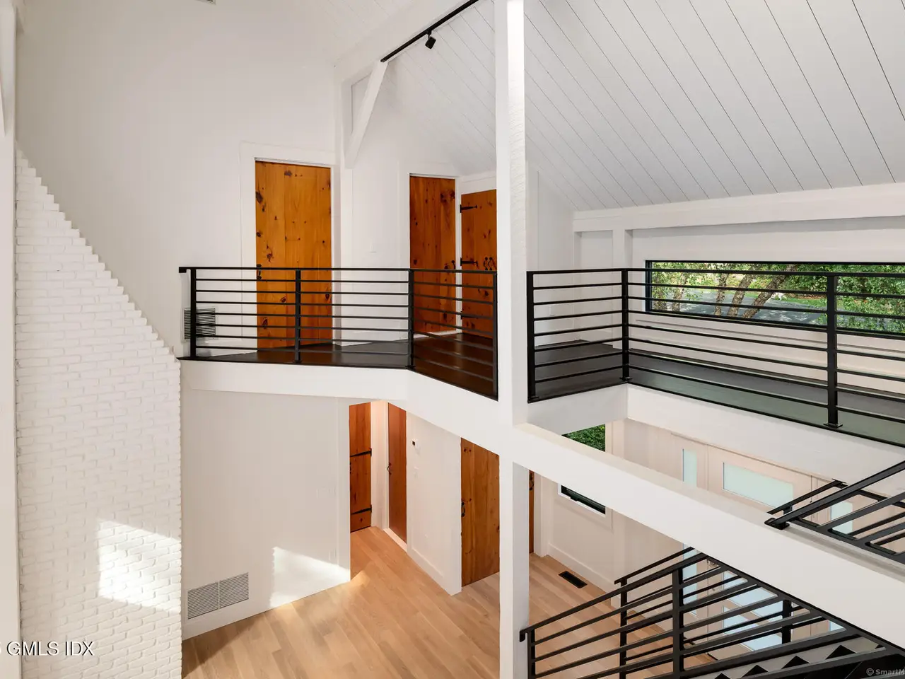 Ideally located near everything, this beautifully updated modern farmhouse-style home offers a perfect blend of comfort and elegance. Situated on a quiet cul-de-sac in Mid Country Greenwich, this private and peaceful residence features a custom design with striking architectural details. The spacious, open-concept living area boasts soaring 24-foot cathedral ceilings, a floor-to-ceiling fireplace, and an abundance of natural light. The gourmet kitchen showcases Quartz countertops with a stunning waterfall island and top-of-the-line appliances, making it ideal for entertaining and daily living. The first floor also includes a formal dining room and an oversized primary bedroom suite complete with a sitting area, fireplace, walk-in closet, and luxurious bath. Upstairs, you'll find two additional bedrooms and bathrooms, all recently updated with modern fixtures and finishes. There's also a large family or playroom, along with a second laundry room. All second-floor rooms are accessed via a spacious wrap-around hall balcony overlooking the main living space. Exposed beams and wrought iron hardware throughout add warmth and character, complementing the natural surroundings of the one-acre wooded property. Enjoy outdoor living on the expansive back deck that spans the length of the house perfect for relaxing or entertaining. Move-in ready and conveniently located close to town and schools, this home is waiting for new owners to enjoy immediately.