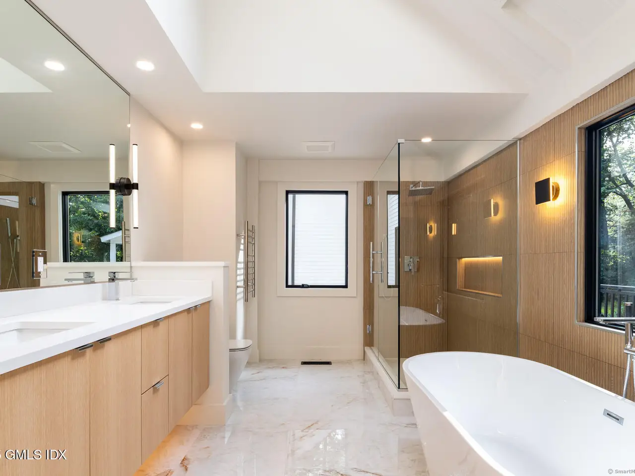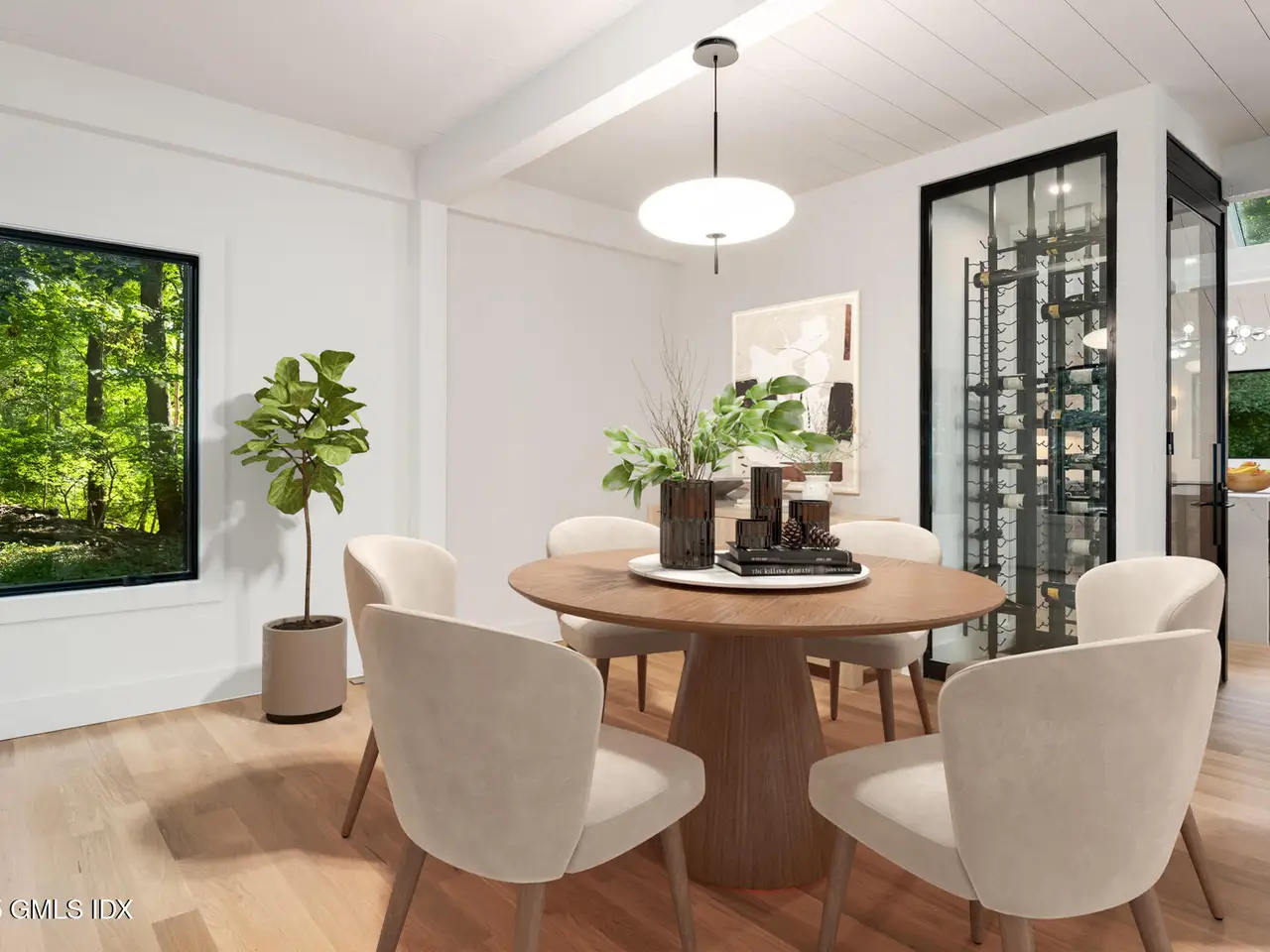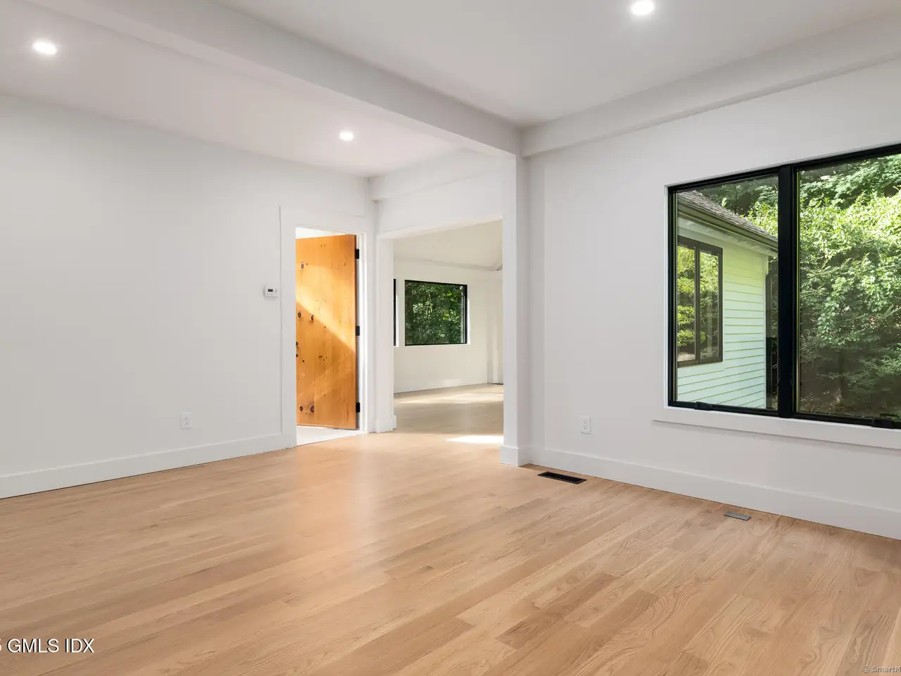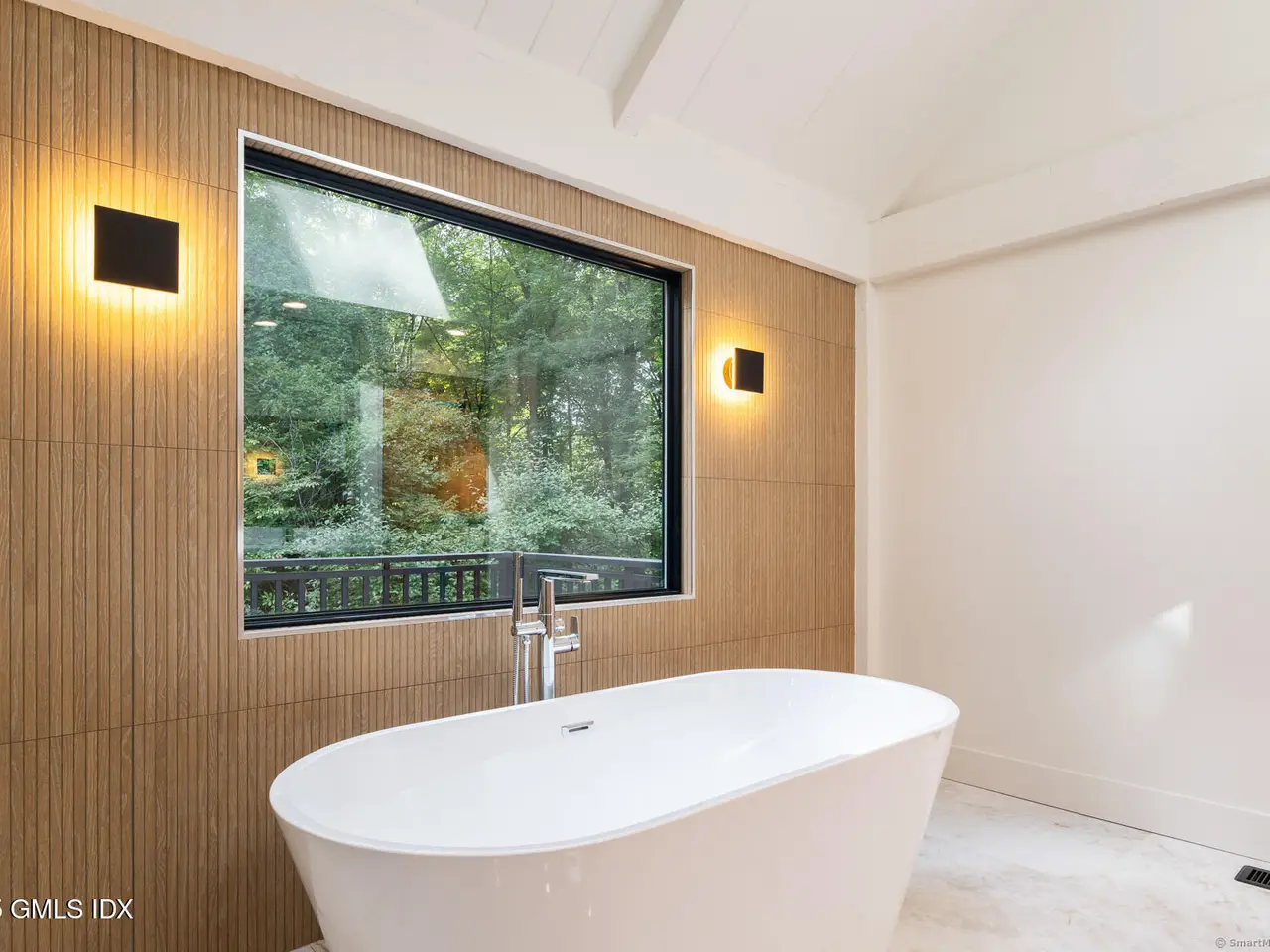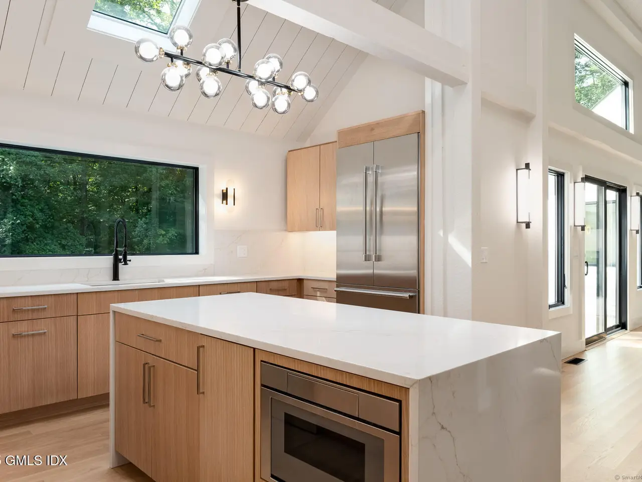 Ideally located near everything, this beautifully updated modern farmhouse-style home offers a perfect blend of comfort and elegance. Situated on a quiet cul-de-sac in Mid Country Greenwich, this private and peaceful residence features a custom design with striking architectural details. The spacious, open-concept living area boasts soaring 24-foot cathedral ceilings, a floor-to-ceiling fireplace, and an abundance of natural light. The gourmet kitchen showcases Quartz countertops with a stunning waterfall island and top-of-the-line appliances, making it ideal for entertaining and daily living. The first floor also includes a formal dining room and an oversized primary bedroom suite complete with a sitting area, fireplace, walk-in closet, and luxurious bath. Upstairs, you'll find two additional bedrooms and bathrooms, all recently updated with modern fixtures and finishes. There's also a large family or playroom, along with a second laundry room. All second-floor rooms are accessed via a spacious wrap-around hall balcony overlooking the main living space. Exposed beams and wrought iron hardware throughout add warmth and character, complementing the natural surroundings of the one-acre wooded property. Enjoy outdoor living on the expansive back deck that spans the length of the house perfect for relaxing or entertaining. Move-in ready and conveniently located close to town and schools, this home is waiting for new owners to enjoy immediately.