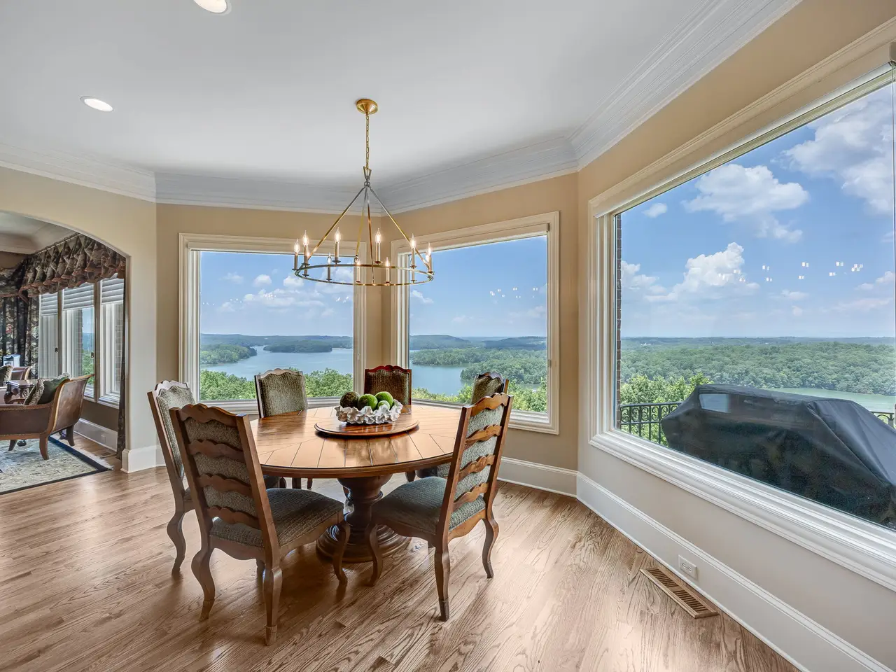 Harbour Point Yacht Club and Marina! A rare opportunity to own a truly exceptional Lake Lanier estate, offered fully furnished with elegant, high-end pieces and ideally positioned on one of the most desirable lots on the lake. Located within the prestigious, gated Harbour Point Yacht Club and Marina community, this custom-built home showcases sweeping sunset views over Lake Lanier and the Blue Ridge Mountains from three expansive verandas. Designed with both luxury and lifestyle in mind, this four-level estate features an elevator, two home offices, and a heated pool and spa. A deeded boat slip is included, offering seamless access to lakefront living. The main level welcomes you with a grand two-story foyer and living room, formal study, and refined dining room. A brand-new custom chef's kitchen is outfitted with a 60" Wolf range with double ovens, Sub-Zero refrigerator, Miele coffee station, and an oversized walk-in pantry. The cozy keeping room features a stone fireplace, and the spacious primary suite includes a spa-like bath and newly designed California Closets. The terrace level is an entertainer's dream, complete with a wine cellar and tasting room, full kitchen and bar, gathering room with fireplace, 10-seat home theater, steam shower, sauna, and private guest suite. The lower poolside level adds even more space for entertaining with a second full kitchen, additional ensuite, gathering room, game room, and fitness room-all opening to the pool and landscaped, fenced backyard. Additional features include a three-car garage plus a dedicated Harley garage, a newly resurfaced pool with cabana, and numerous recent upgrades including a Crestron Smart Home system, updated irrigation, fire sprinkler and security systems, and tankless hot water.