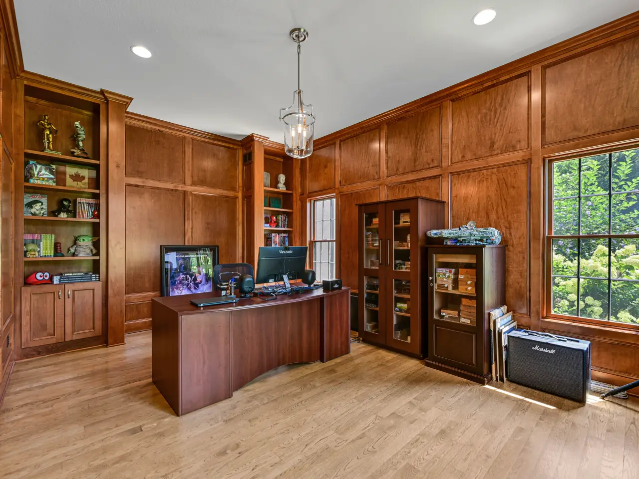 Experience luxury living in this exquisite contemporary home, thoughtfully designed with exceptional details. The main level showcases a chef's dream kitchen with two spacious islands, a large dinette, and a butler's pantry-ideal for everyday living and entertaining alike. Enjoy the natural light flooding into the sunroom and great room, both with expansive windows that invite the outdoors in. The main floor also features a formal dining room and a fantastic home office perfect for today's lifestyle. Upstairs, retreat to the luxurious primary suite featuring a private sitting area with a cozy fireplace, private deck overlooking the serene backyard, and a spa-like en suite with a whirlpool tub, multi-jet shower, double vanities, and two walk-in closets. The second bedroom includes a private bath, while bedrooms three and four share a well-appointed bathroom. All have walk-in closets. The exposed lower level is an entertainer's paradise, complete with a custom bar, theater room, exercise room, and a full bath. A 4-car garage and 3.46 beautifully landscaped acres complete this one-of-a-kind property-a rare combination of modern style, thoughtful amenities, and serene outdoor space.