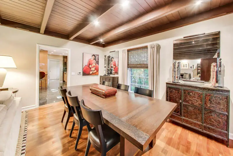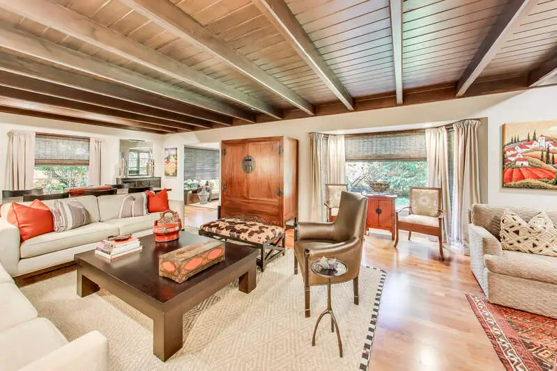 • Wood beamed ceiling and fireplace in living room