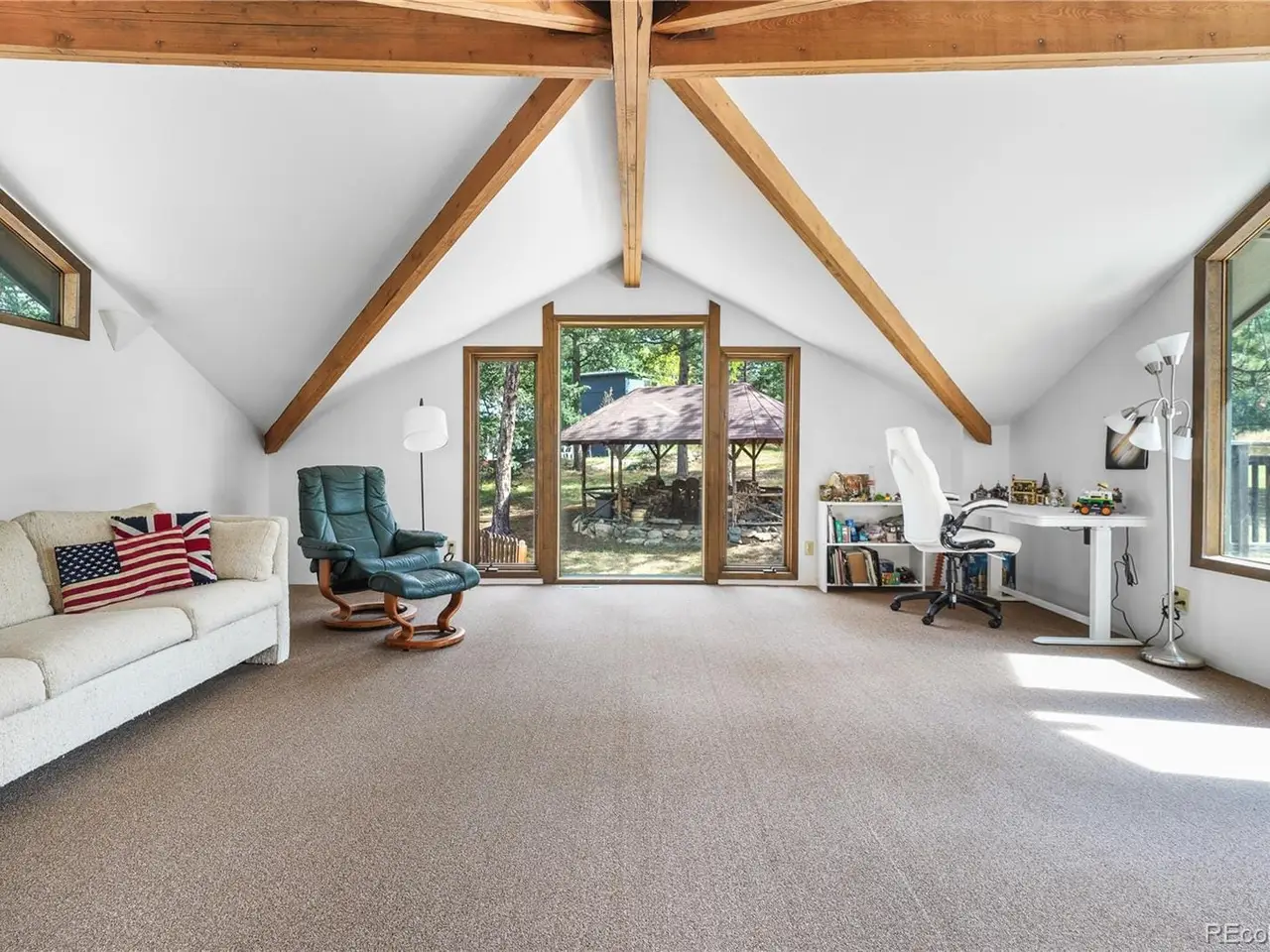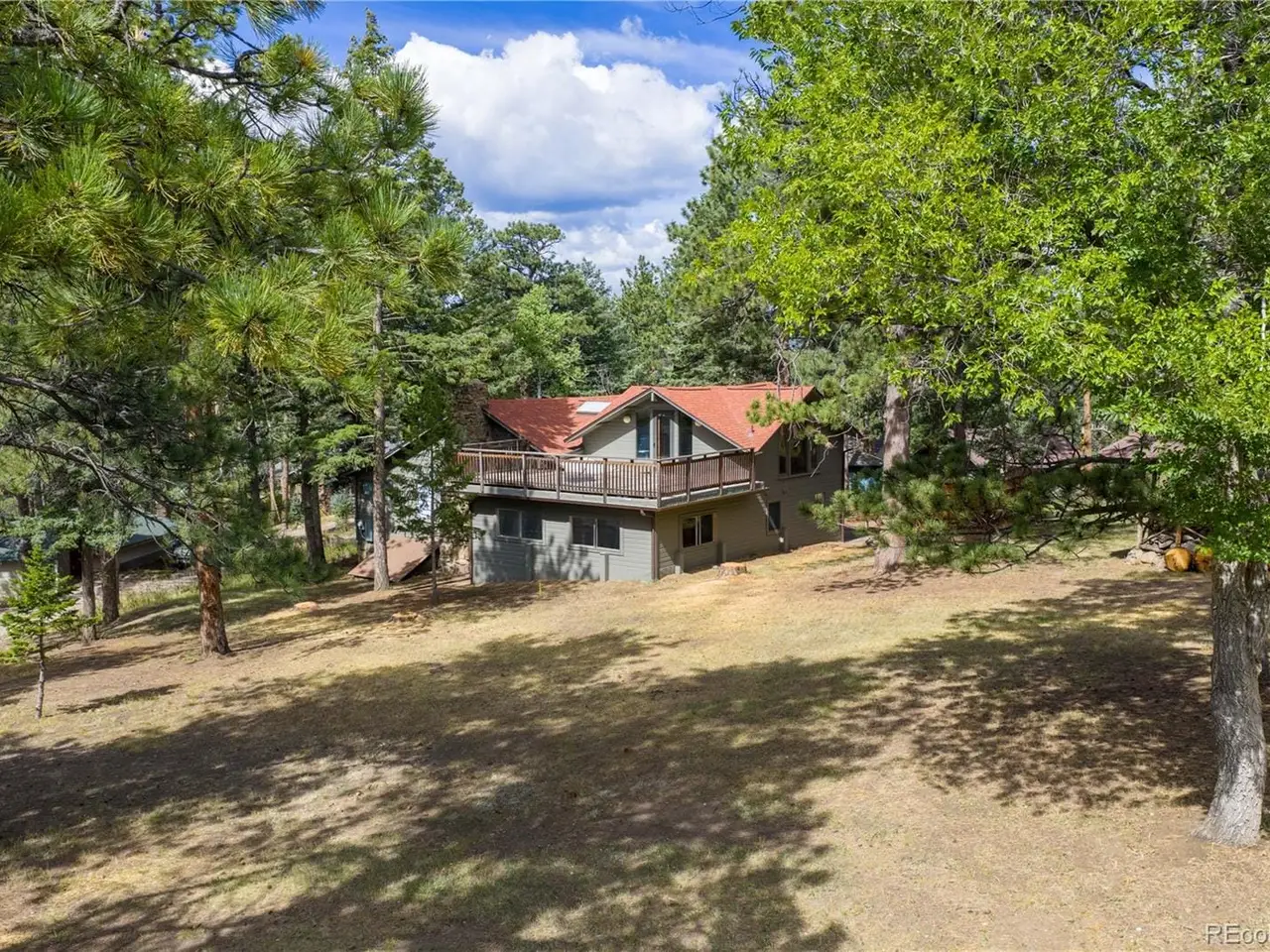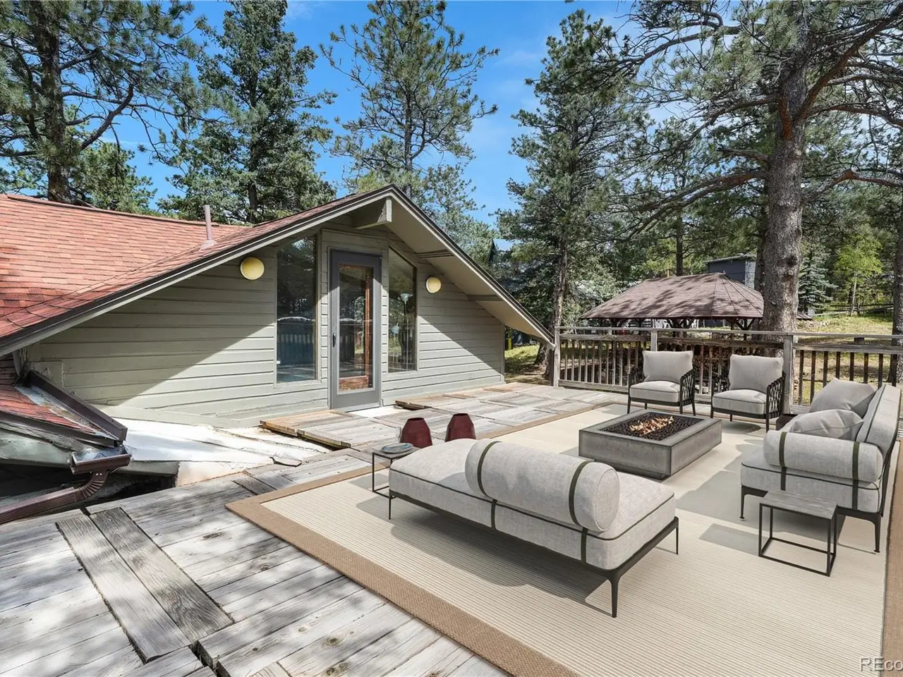 Mount Vernon Home with Mid-Century Flair! This distinctive Mount Vernon home blends mid-century modern architecture with timeless charm. The dramatic great room showcases soaring ceilings, massive wood beams with metal brackets, pegged hardwood floors, a striking stone wood-burning fireplace, and expansive windows and skylights that fill the space with natural light. The open dining area flows seamlessly into the kitchen, featuring vintage parquet flooring. The main-floor primary suite offers his-and-her closets and an en-suite bath, plus two additional main-floor bedrooms featuring large windows framing the treed setting. A vaulted flex/family room upstairs with an incredible vaulted beamed ceiling opens to a private rooftop deckideal for entertaining, working from home, or stargazing. Outdoor living is enhanced with a 1920s gazebo, a spacious front porch, patio and park like .7 acre lot. The lower level provides versatile space for hobbies, a workshop, or extra storage. A detached garage with sliding barn-style doors adds to the charm. Mount Vernon is more than just a place to liveits a way of life thats truly one-of-a-kind with vast open spaces, hiking trails, and abundant wildlife. What also sets Mount Vernon apart is its deep sense of community. As a homeowner, youre not just a resident you become part of the Metro District, a tight-knit group that works together to preserve this special place. The Mount Vernon Canyon Club is at the heart of it, where residents enjoy fine dining, a clubhouse, a pool, tennis courts, and horse facilities. Ralston Elementary is also conveniently located at the edge of the neighborhood. The HOA Fee of $496 includes a Social Membership. Additional membership packages, including aquatic, racquet, sports and community horse facilities, are available for an extra fee.