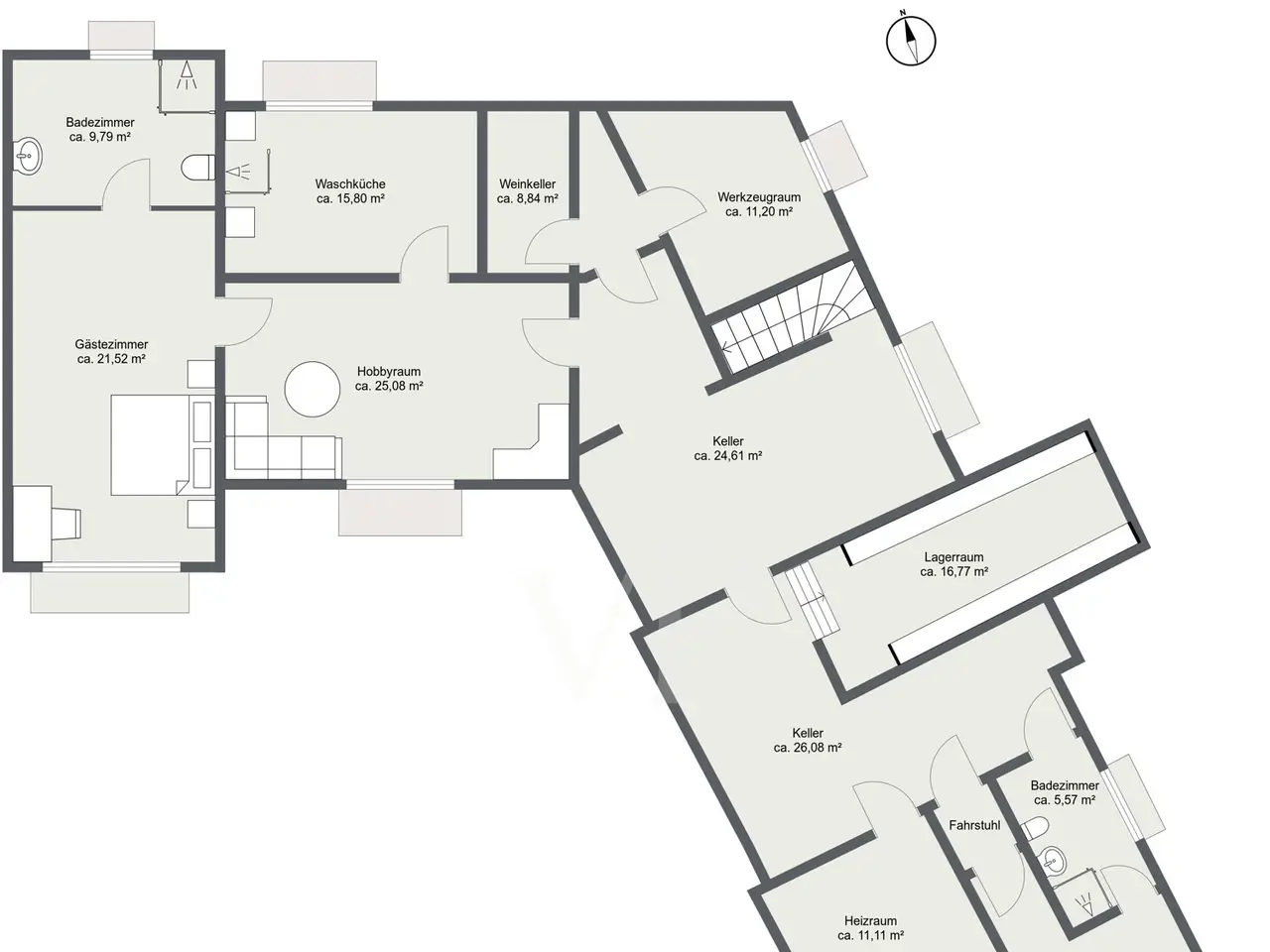 Living spaces with character: As soon as you enter, you are greeted by a spacious entrance area that makes the open and well thought-out architecture of the house tangible. The private retreats with bedrooms open up to the right, while the kitchen and the spacious living and dining area are to the left. High-quality Doussie parquet flooring, atmospheric Occhio lighting systems and pleasant underfloor heating lend the entire area a warm and inviting atmosphere. The heart of the house is the light-flooded living and dining area with floor-to-ceiling windows, a large sliding door and a stylish fireplace - a room that becomes the focal point of family life. The sunny south and west orientation ensures a bright, friendly ambience throughout the day. The adjoining kitchen, equipped with appliances from Gaggenau and Miele, combines design and functionality and becomes a meeting place for cooking and enjoying meals together. Garden idyll & outdoor areas: A large south-west-facing terrace, the lovingly landscaped garden and a covered outdoor seating area connecting the garage and house make the outdoor area a private retreat. Here you can enjoy summer evenings, relax and spend sociable hours with family and friends. Barrier-free living without compromise: This bungalow is designed to be fully wheelchair accessible - from access via a ramp to each floor. Electric sliding doors, lowered light switches, generous movement areas and wheelchair-accessible fixtures ensure a comfortable, barrier-free living experience without losing the charm of a classic home. The master bathroom impresses with a wheelchair-accessible designer washbasin, a floor-level shower with integrated bench and towel radiators that also serve as sturdy grab rails. The kitchen was also designed to be wheelchair-accessible so that all work areas are easily accessible. A platform lift connects the ground floor and basement and is designed for large electric wheelchairs - meaning that the home cinema, guest room and bathroom in the basement are also completely barrier-free. Wheelchair-accessible ramps at the entrance to the house and practice, an electric door opener, electrically controlled screens in the bathrooms and an electric garage door control system round off this comfort concept. Pioneering energy efficiency: This house is also technically impressive: a gas condensing boiler from Paradigma together with a 1,000 l solar storage tank and three solar thermal modules provide hot water and backup heating. Two photovoltaic systems - one with 4.8 kWp for full feed-in and a single-phase self-consumption system (4.9 kWp) with a total of 6 kWh of energy storage, including 3 kWh as emergency power storage - ensure maximum energy efficiency and self-sufficiency. Underfloor heating and radiators ensure a pleasant indoor climate. Water pipes and all installations were renewed in 2002, the practice toilet and two other bathrooms were modernized in 2015/2016. The electrics were completely replaced in 2002 and optimized in 2015. The windows, walls and roof have modern full thermal insulation and guarantee low operating costs. Separate living and working area: This separate area is perfect as an office, practice or studio - or as an exclusive guest area. A separate, prestigious entrance with large windows lets in plenty of light and gives this area an open, inviting atmosphere. An elegant guest WC and the elevator, which connects both floors of the house barrier-free, are located here. The adjoining study opens up to the living area with electric sliding doors, creating a seamless transition between working and living.