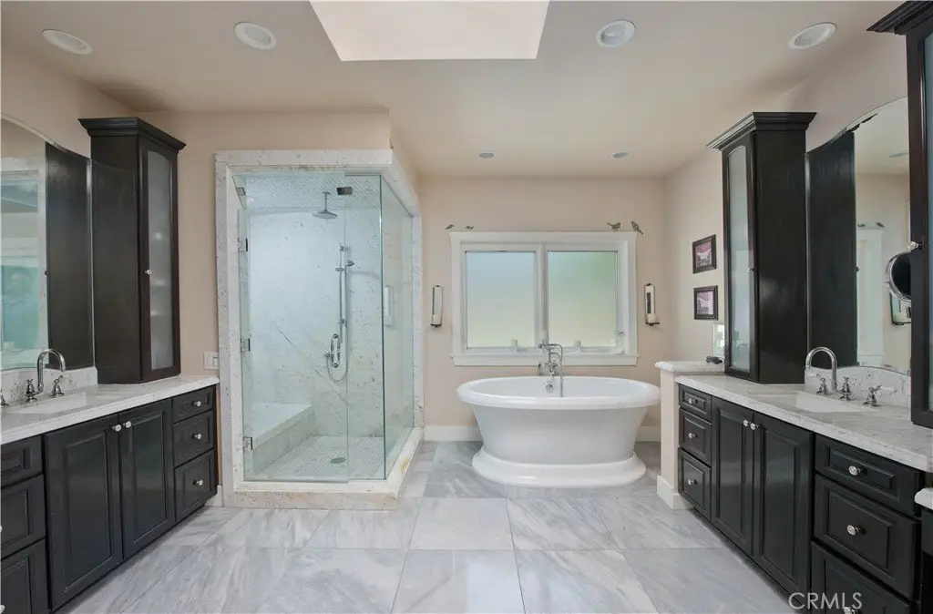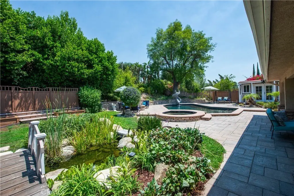 Call 818-581-1839 for your private showing. Welcome to one of the most spectacular single-story, ranch style custom estates in Knollwood! The moment you arrive, the striking curb appeal sets the tone—beautiful rock hardscaping leads to a private, gated courtyard with serene fountain and tranquil seating areas that greet you. Step through custom wood double doors w/beveled glass and discover nearly 4,300 sq. ft. of luxurious living space. Upon entry you immediately notice the views of the resort-like backyard through the oversized sliding glass doors of the spacious and bright living room that has custom built-ins and fireplace. At the heart of the home is a gourmet chef’s kitchen, designed to impress w/Argentinean marble floors, oversized center island, DCS 6-burner stove, double ovens, warming drawer, dual sinks, Sub-Zero refrigerator, wine fridge, fireplace & exceptional storage. The kitchen flows seamlessly into the dining room and onward to a step-down, expansive family room w/custom built-ins and cozy fireplace. Surrounding the family room is a bonus upper open area, ideal for bar or pool table- the perfect entertaining spot w/oversized glass sliders that frame serene views of the entertainer’s backyard—creating a seamless indoor-outdoor flow. Thoughtful floor plan features two private wings, creating an ideal layout for the five bedrooms and four baths. The primary retreat is a sanctuary of luxury, boasting a fireplace, custom up lighting, built-in wardrobes and fully finished walk-in closet. The spa-like primary bath features Carrera marble, heated floors, dual vanities, whirlpool soaking tub, oversized steam shower, and skylight that bathes the space in natural light. Two of the additional bedrooms are spacious en-suites, perfect for guests or family. A rare and impressive feature is the extra-large laundry room, designed to accommodate two washers and two dryers, with abundant cabinetry, a utility sink & direct access to yard. The resort-style backyard is an entertainer’s dream: an extended covered patio w/fireplace, Pebble Tec salt water pool w/slide, stylish spa-inspired outdoor shower, koi pond, putting green, low-maintenance turf, detached pool room & large gated/enclosed carport area. Additional highlights include mud room, finished three-car garage w/epoxy floors and built-in cabinets, solar, 3 A/C zones, CAT/cable wiring throughout. Homes like this are a rare find—offering custom design, privacy and luxury all in one.
