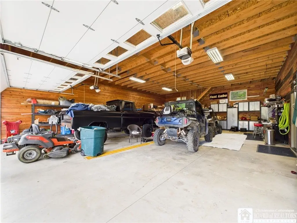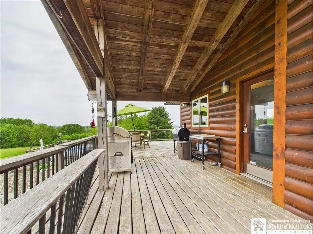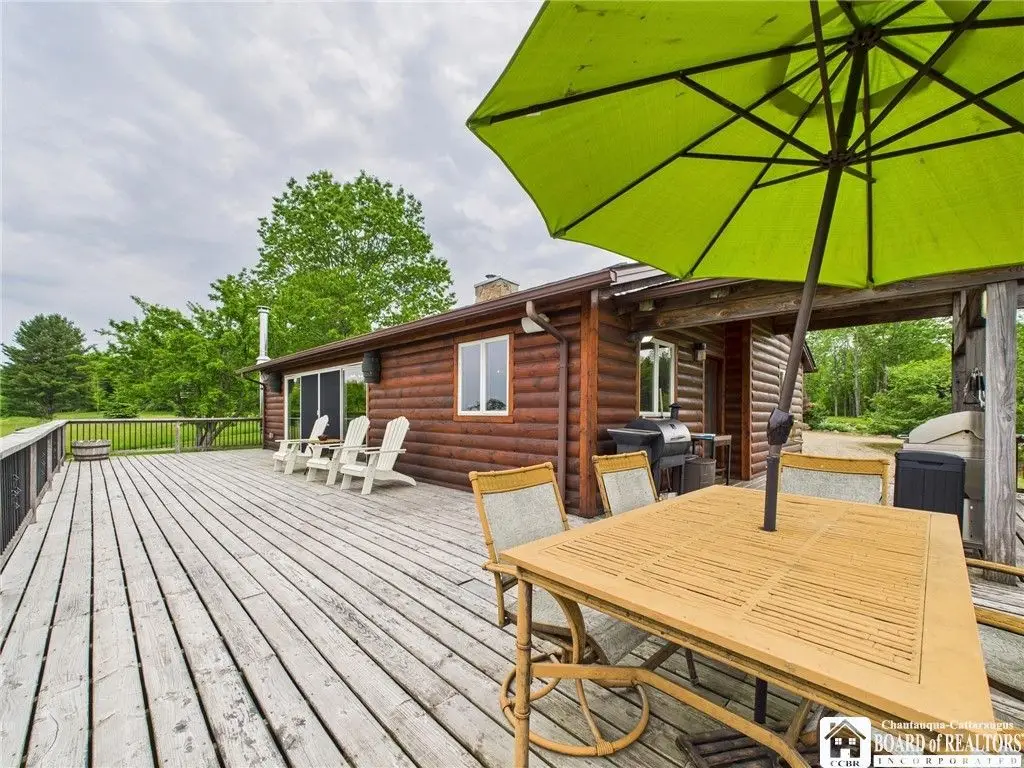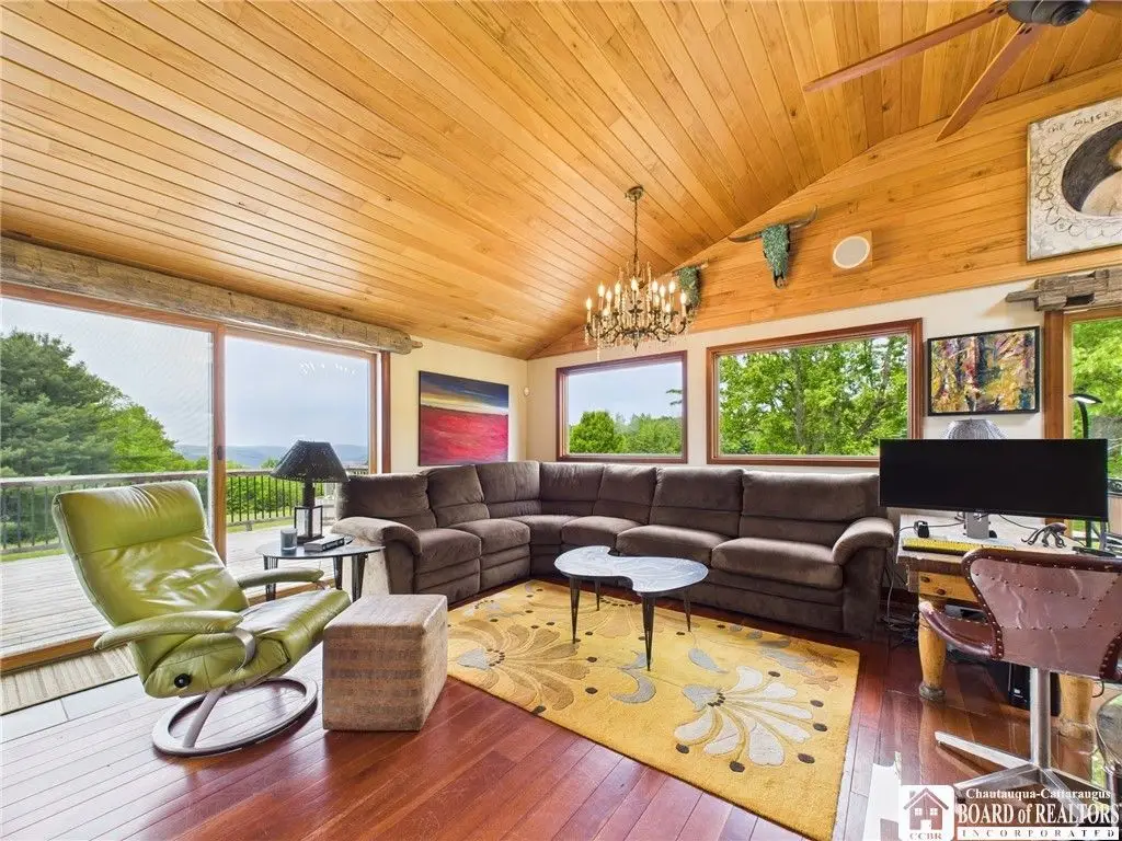 Discover a rare gem just minutes from Ellicottville - 77 acres of private, picturesque country living with unbeatable outdoor access. This one-of-a-kind ranch-style property shares its border with the 832-acre Raecher Hill State Forest, offering limitless possibilities for hiking, wildlife watching, and exploring right from your backyard. The main home features two spacious bedrooms and two full bathrooms, with grand cathedral ceilings, hardwood and natural stone floors, a beautifully updated bathroom, and breathtaking views of Holiday Valley that stretch for miles. The basement features heated electric floors, a wood stove, another full bath and even a sauna. With approximately 2,200 square feet of living space - not including the barn or guest apartment - there's room to relax, entertain, and enjoy life in every season. It is about ten minutes from Holiday Valley and bustling downtown Ellicottville. Two private pond enhances the serene setting, creating the perfect spot to unwind. The barn-style garage is a standout feature, offering an upstairs private bar room for entertaining, and a fully appointed garage apartment with heated floors, a private bathroom, and its own cozy living space - ideal for guests or short-term rentals. A second outbuilding provides ample space for storing a tractor, outdoor equipment, or anything else you can dream up. As a bonus, the property also includes a well-maintained camper, perfect for temporary stays, visiting guests, or even your secluded weekend hideaway. The camper has solar panels and water to make it even more convenient. Whether you're seeking a private retreat, a base for adventure, or a flexible property with room to grow, this ranch delivers it all.