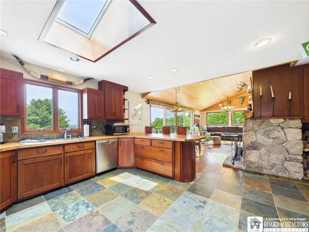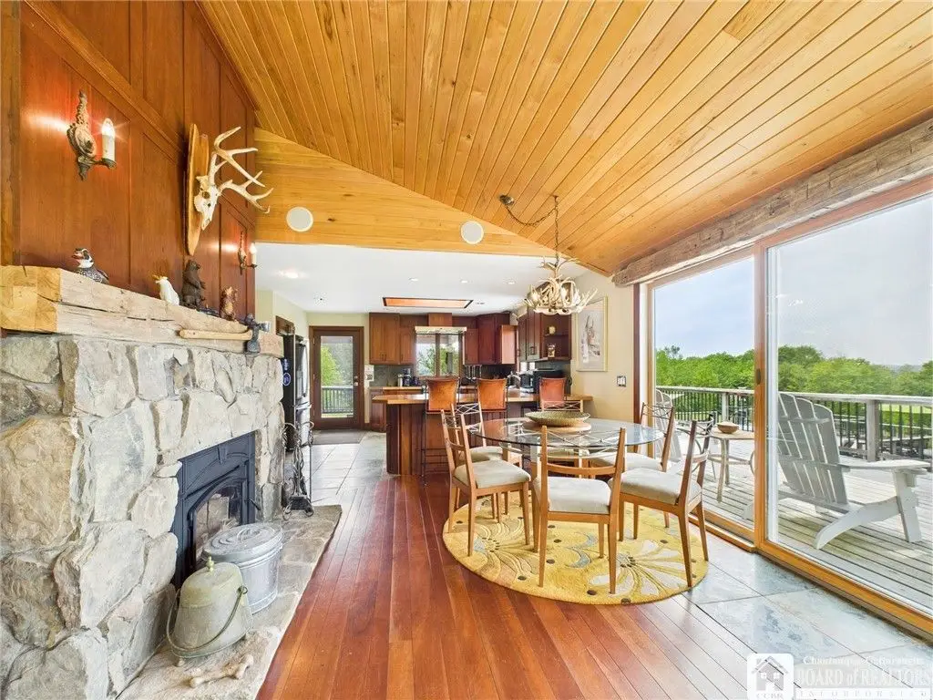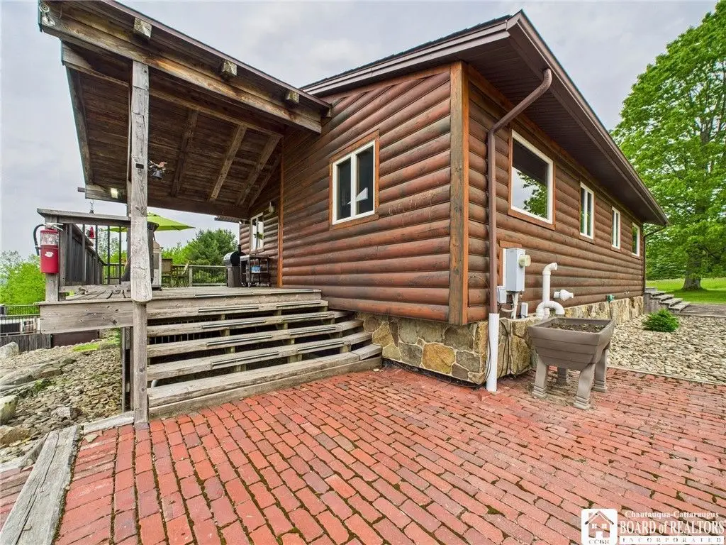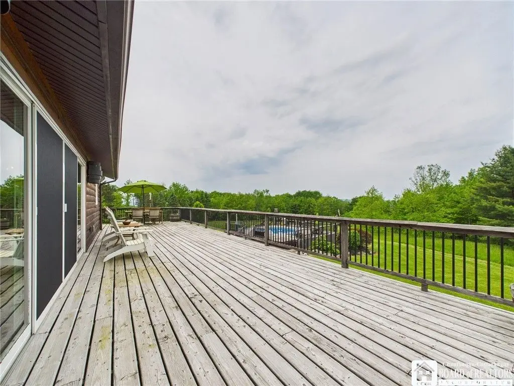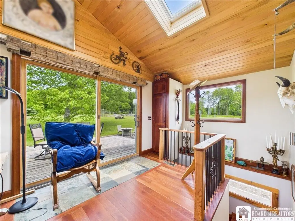 Discover a rare gem just minutes from Ellicottville - 77 acres of private, picturesque country living with unbeatable outdoor access. This one-of-a-kind ranch-style property shares its border with the 832-acre Raecher Hill State Forest, offering limitless possibilities for hiking, wildlife watching, and exploring right from your backyard. The main home features two spacious bedrooms and two full bathrooms, with grand cathedral ceilings, hardwood and natural stone floors, a beautifully updated bathroom, and breathtaking views of Holiday Valley that stretch for miles. The basement features heated electric floors, a wood stove, another full bath and even a sauna. With approximately 2,200 square feet of living space - not including the barn or guest apartment - there's room to relax, entertain, and enjoy life in every season. It is about ten minutes from Holiday Valley and bustling downtown Ellicottville. Two private pond enhances the serene setting, creating the perfect spot to unwind. The barn-style garage is a standout feature, offering an upstairs private bar room for entertaining, and a fully appointed garage apartment with heated floors, a private bathroom, and its own cozy living space - ideal for guests or short-term rentals. A second outbuilding provides ample space for storing a tractor, outdoor equipment, or anything else you can dream up. As a bonus, the property also includes a well-maintained camper, perfect for temporary stays, visiting guests, or even your secluded weekend hideaway. The camper has solar panels and water to make it even more convenient. Whether you're seeking a private retreat, a base for adventure, or a flexible property with room to grow, this ranch delivers it all.