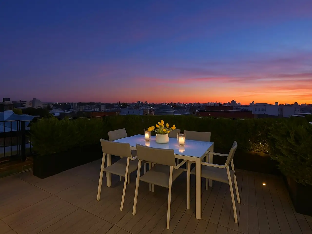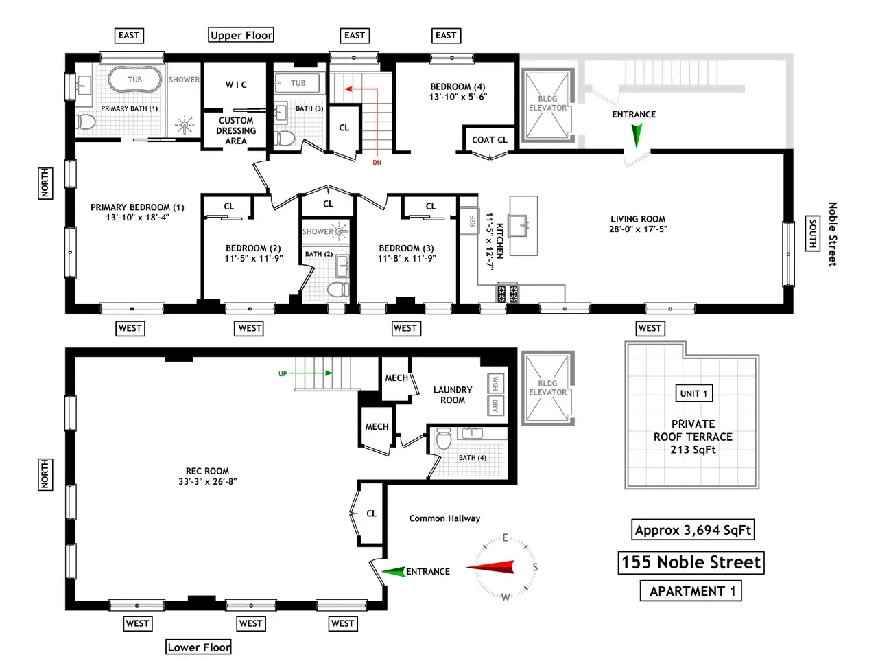A Landmark Neo-Gothic Condominium Reimagined for Modern Living Welcome to 155 Noble Street, Residence 1. A sprawling 3,689 SF duplex which offers the scale and presence of a townhouse on two loft-like levels with a private roof top cabana terrace to enjoy 24/7. This grand 4-bedroom, 3.5-bath home features soaring 11 foot ceilings, a dramatic great room anchoredby a magnificent arched window, and an expansive open layout ideal for entertaining. The 1,000 SF lower level enjoys the light of 6 windows, an additional separate entrance accessed via the condo building's elevator hallway, a half bath, and oversized laundry room. To round out this extraordinary offering the apt enjoys a private gated rooftop cabana with 24/7 access to enjoy. KITCHEN: The large open chef's kitchen is a showpiece-outfitted with a large center island, custom black-and-brass LaCanche Volnay vented range and hood, grey fumed-oak cabinetry, Calacatta Paonazza bookmatched marble countertops, a 42" Sub-Zero refrigerator, Bosch microwave and dishwasher, and Kohler farmhouse enameled cast iron kitchen sink. PRIMARY BEDROOM SUITE: This oversized and serene retreat features a generous dressing room with walk-in-closet and a breathtaking, windowed en-suite marble bath clad in Stellar White and Tundra Grey stone, complete with a Signature freestanding soaking tub and separate, spacious walk-in shower. FAMILY and QUARTERS: The three additional bedrooms include one with an en-suite bath and another with tranquil, protected views. The secondary baths are equally refined, showcasing hand-made Moroccan concrete tiles, London Grey Quartz vanities, and Kohler fixtures. ADDITIONAL BEDROOMS and BATHROOMS The windowed lower level, also with soaring ceilings, offers endless flexibility-perfect for a gym, media lounge, rec room, den-or perhaps reimagine this space into two additional, windowed rooms. Here you will find a laundry room with vented LG washer and dryer, and a separate powder room. MODERN COMFORTS Contemporary conveniences abound, including Nest multi-zoned central heating and cooling, integrated Lutron lighting and shades system, herringbone inlaid oak floors, oversized triple-paned Pella windows, Virtual Doorman, and keyed elevator access. Enjoy your locked and private rooftop cabana, directly accessed by the keyed elevator and with iconic sweeping and iconic views of Brooklyn, the East River, and the Manhattan skyline. A small private exit off the primary bedroom is perfect for an intimate outdoor escape. THE BUILDING and NEIGHBORHOOD Crafted by award-winning, local designer Cece Stelljes, 155 Noble Street is a distinctive, freestanding, landmarked Neo-Gothic condominium that sits on an extra deep, 30-foot-wide lot and consists of only five residences. Nestled on a favorite tree-lined block in landmarked Greenpoint, here you will find a rare combination of architectural pedigree and everyday practicality. Enjoy proximity to the neighborhood's best dining, parks, and boutiques, with the conveniences of Manhattan and Franklin Avenues nearby, the G train just one block away, easy access to the East River ferry and the North Brooklyn waterfront , and convenient parking options. Perfectly positioned between McCarren Park and Long Island City, and in close proximity to Manhattan, this quiet, charismatic enclave embodies Brooklyn at its most beautiful. This home benefits from a long-term tax abatement that allows for low monthly costs. The monthly real estate taxes shown are representative of primary residence status A current assessment of $949/month ends January 2026 Contact us directly for a private tour of this incredible home.