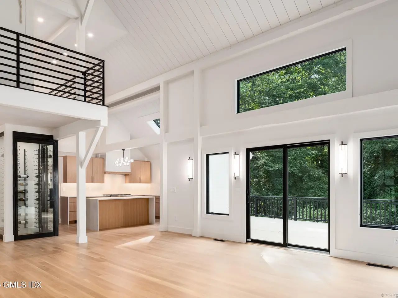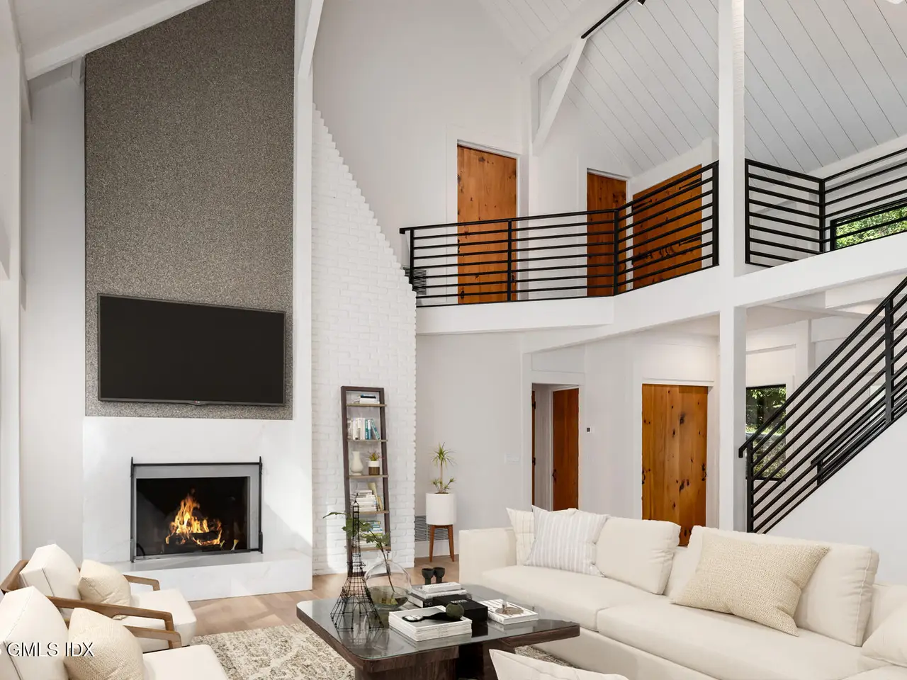 Ideally located near everything, this beautifully updated modern farmhouse-style home offers a perfect blend of comfort and elegance. Situated on a quiet cul-de-sac in Mid Country Greenwich, this private and peaceful residence features a custom design with striking architectural details. The spacious, open-concept living area boasts soaring 24-foot cathedral ceilings, a floor-to-ceiling fireplace, and an abundance of natural light. The gourmet kitchen showcases Quartz countertops with a stunning waterfall island and top-of-the-line appliances, making it ideal for entertaining and daily living. The first floor also includes a formal dining room and an oversized primary bedroom suite complete with a sitting area, fireplace, walk-in closet, and luxurious bath. Upstairs, you'll find two additional bedrooms and bathrooms, all recently updated with modern fixtures and finishes. There's also a large family or playroom, along with a second laundry room. All second-floor rooms are accessed via a spacious wrap-around hall balcony overlooking the main living space. Exposed beams and wrought iron hardware throughout add warmth and character, complementing the natural surroundings of the one-acre wooded property. Enjoy outdoor living on the expansive back deck that spans the length of the house perfect for relaxing or entertaining. Move-in ready and conveniently located close to town and schools, this home is waiting for new owners to enjoy immediately.