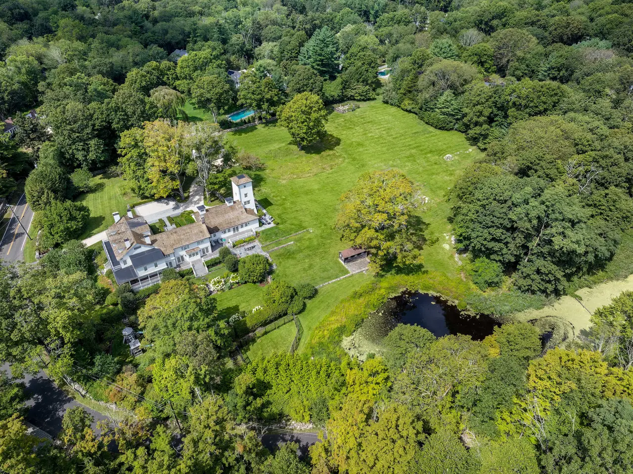 Welcome to Mead Farm - exquisitely renovated and transformed midcountry Greenwich estate that blends historic character with modern luxury. Set on nearly 6 acres in a 2 acre zone, this 9,189 SF residence offers 6 bedrooms, 6 full and 2 half baths. A recent multi-year renovation by renowned designer Thom Filicia, paired with award-winning landscaping by James Doyle, elevates the property to a rare level of refinement, harmonizing timeless design with modern comfort. Originally built in 1846, the home features wide-plank floors, copper gutters, 7 fireplaces, and a wraparound porch. The rebuilt water tower adds a gym, wine room, full bath, and dramatic double-height office. Outdoors, enjoy gardens, terraces, pool with autocover, pond and a barn with loft and garages just minutes from town. MeadFarmGreenwich.com