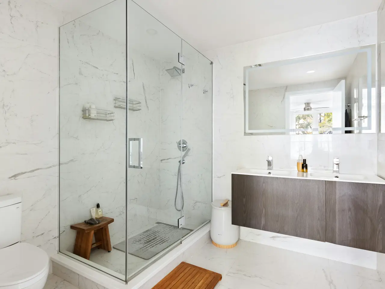 Spa-like en-suite bath with glass-enclosed walk-in shower