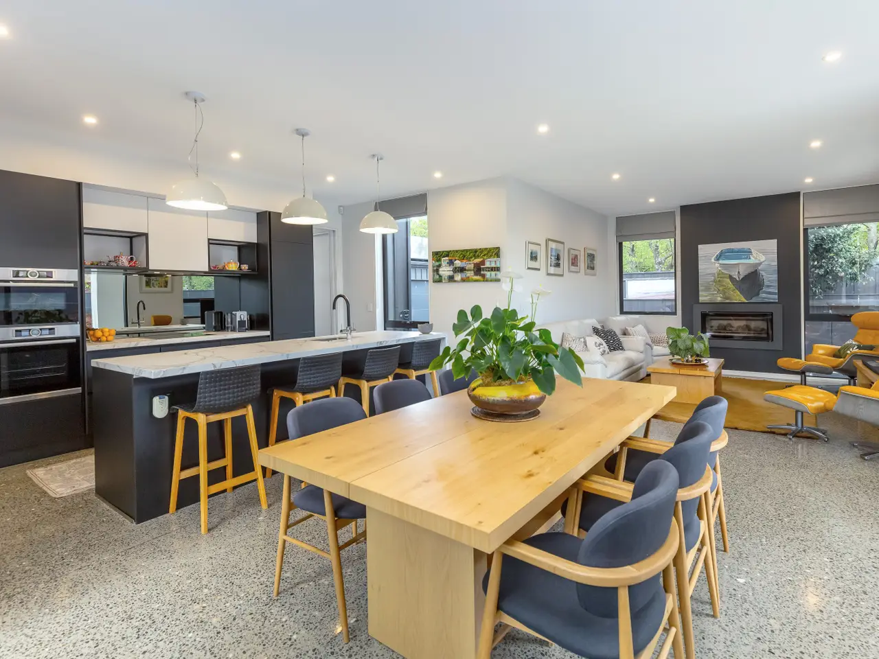 The bespoke copper front door opens to a dramatic entranceway, where soaring ceilings and a handcrafted black ash staircase set the tone for the home's refined design. Beyond, the layout balances elegance with practicality, with the open-plan living extending seamlessly to the landscaped garden and in-ground heated pool. A feature fireplace creates a warm focal point, while underfloor heating ensures year-round comfort.