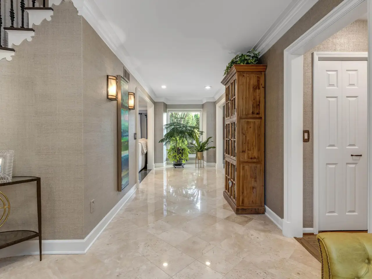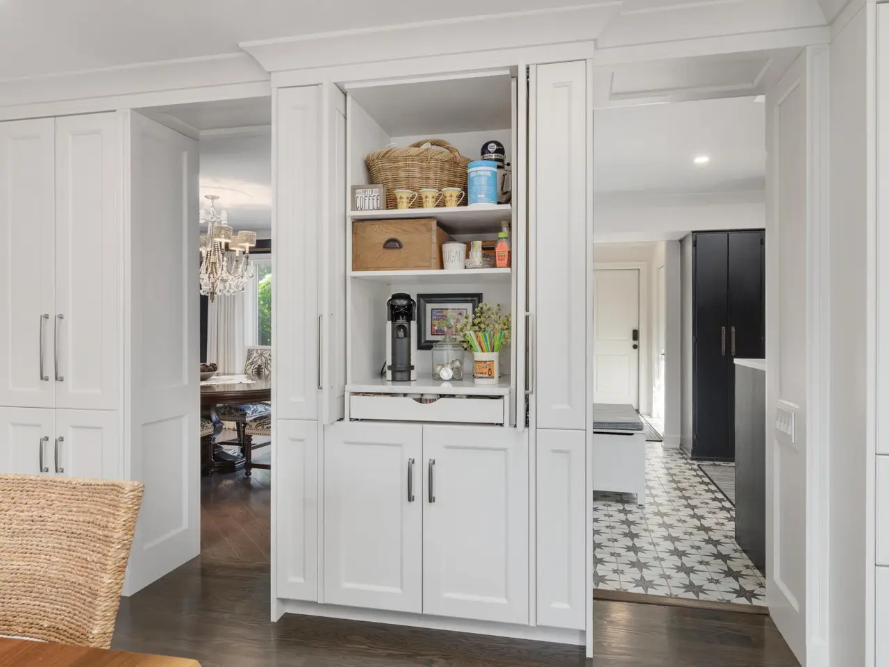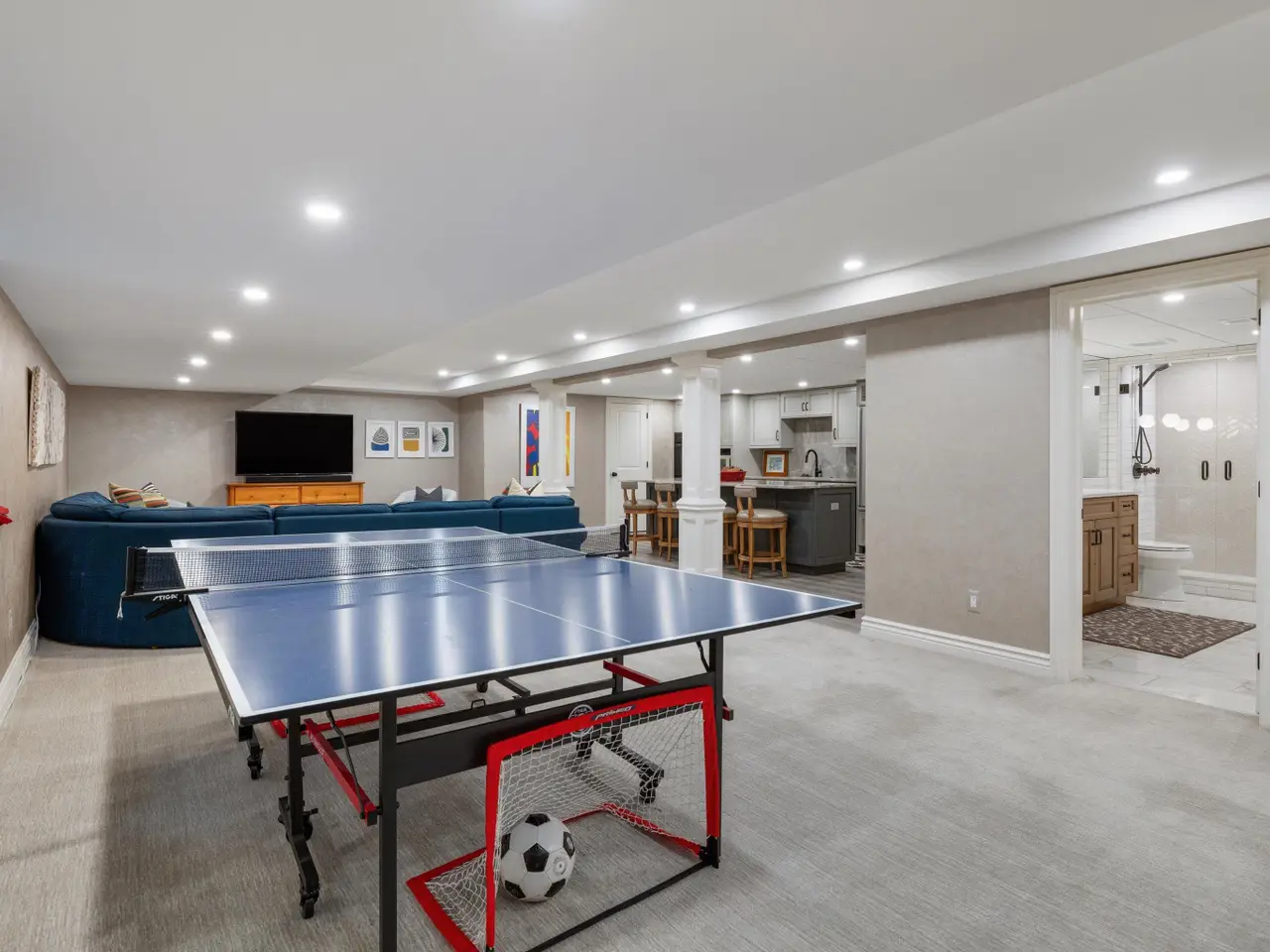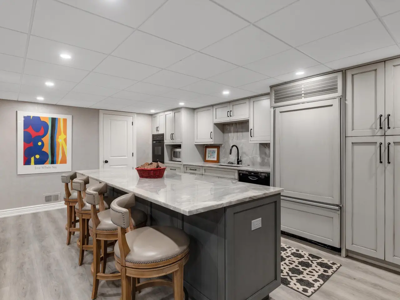 Welcome to 54 Belle Meade, not just a home but a recently renovated sanctuary looking for its new family. With 5 bedrooms, 4 and a half bathrooms, custom Milennium Kitchen and bathrooms, this tastefully designed home is key turn ready and waiting for you. On the top floor you'll find the primary suite with a large bathroom area with built in vanity, and multiple closets. A secondary bedroom also has a built in vanity with light up mirror. A third bedroom has soaring ceiling and beautiful chandelier. Down the staircase to the first floor you will find your office, guest bathroom, piano room with built in bookcases and a new bay window. From there you move across the main entry hall into the tv room that has a large built-in tv all with more bookshelves and a wet bar for entertaining. The tv room leads into the spacious and bright custom Millennium Kitchen. Here you will find high end appliances from Wolf and Subzero. The counters are Cristallo, the cooktop is induction, a double oven, and microwave is integrated into the island, with 4 freezer drawers and a pantry. Look closely and you will see a hidden coffee station with special cabinets that pop-out for storing kitchen and speciality items. There is a hidden cabinet with a tv over the oven as well. Off the kitchen is an oversized laundry room with a service door to the garage and courtyard. The laundry room has multiple closets, a laundry shoot and conveniently located full bathroom. The entrance to the basement is located in the laundry room. Here you will find a second custom kitchen, workout room with floor to ceiling mirrors, another full bathroom, flex room currently used as an art room, second laundry, with ample storage. The basement is a special place for entertaining with the ability to have a mutli-generational family live as well. Nest and C02 detectors have been installed throughout the home, as well as recessed lighting, and a Sonos sound system through the first floor, garage, and patio. In the front courtyard is a basketball net and installed flood light for night time games on the court, in the back an oversized patio for entertaining in you own secluded oasis. Back here you will also find a permanently affixed grill connected to the home's gas line. This stunner is not to be missed.