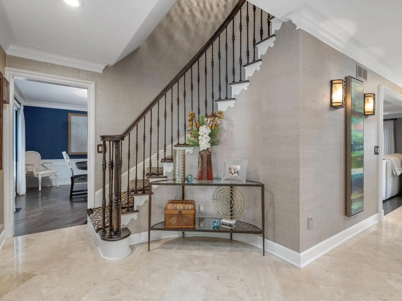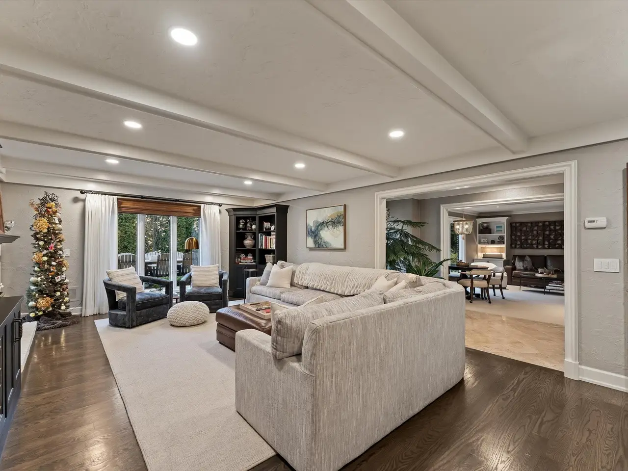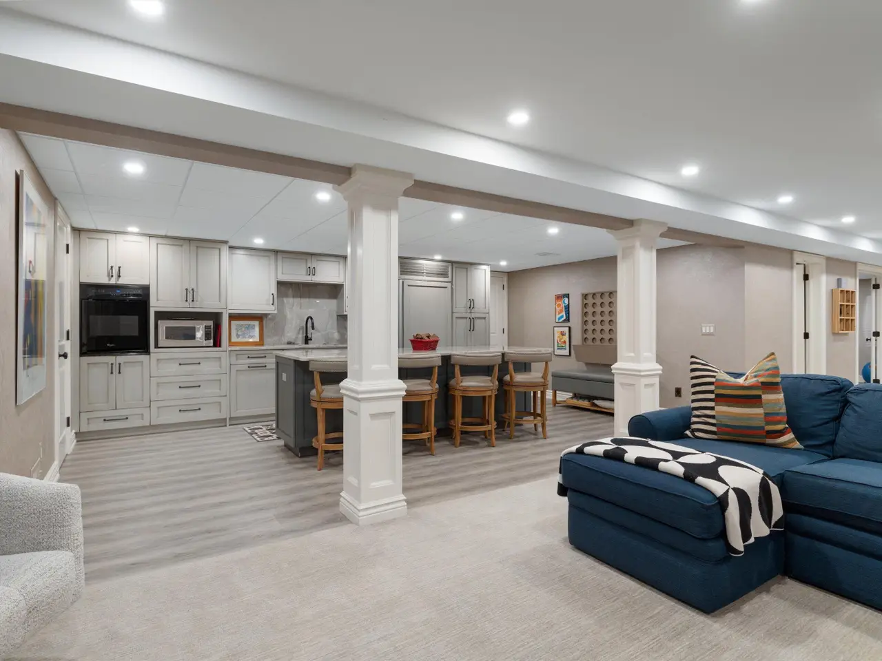 Welcome to 54 Belle Meade, not just a home but a recently renovated sanctuary looking for its new family. With 5 bedrooms, 4 and a half bathrooms, custom Milennium Kitchen and bathrooms, this tastefully designed home is key turn ready and waiting for you. On the top floor you'll find the primary suite with a large bathroom area with built in vanity, and multiple closets. A secondary bedroom also has a built in vanity with light up mirror. A third bedroom has soaring ceiling and beautiful chandelier. Down the staircase to the first floor you will find your office, guest bathroom, piano room with built in bookcases and a new bay window. From there you move across the main entry hall into the tv room that has a large built-in tv all with more bookshelves and a wet bar for entertaining. The tv room leads into the spacious and bright custom Millennium Kitchen. Here you will find high end appliances from Wolf and Subzero. The counters are Cristallo, the cooktop is induction, a double oven, and microwave is integrated into the island, with 4 freezer drawers and a pantry. Look closely and you will see a hidden coffee station with special cabinets that pop-out for storing kitchen and speciality items. There is a hidden cabinet with a tv over the oven as well. Off the kitchen is an oversized laundry room with a service door to the garage and courtyard. The laundry room has multiple closets, a laundry shoot and conveniently located full bathroom. The entrance to the basement is located in the laundry room. Here you will find a second custom kitchen, workout room with floor to ceiling mirrors, another full bathroom, flex room currently used as an art room, second laundry, with ample storage. The basement is a special place for entertaining with the ability to have a mutli-generational family live as well. Nest and C02 detectors have been installed throughout the home, as well as recessed lighting, and a Sonos sound system through the first floor, garage, and patio. In the front courtyard is a basketball net and installed flood light for night time games on the court, in the back an oversized patio for entertaining in you own secluded oasis. Back here you will also find a permanently affixed grill connected to the home's gas line. This stunner is not to be missed.
