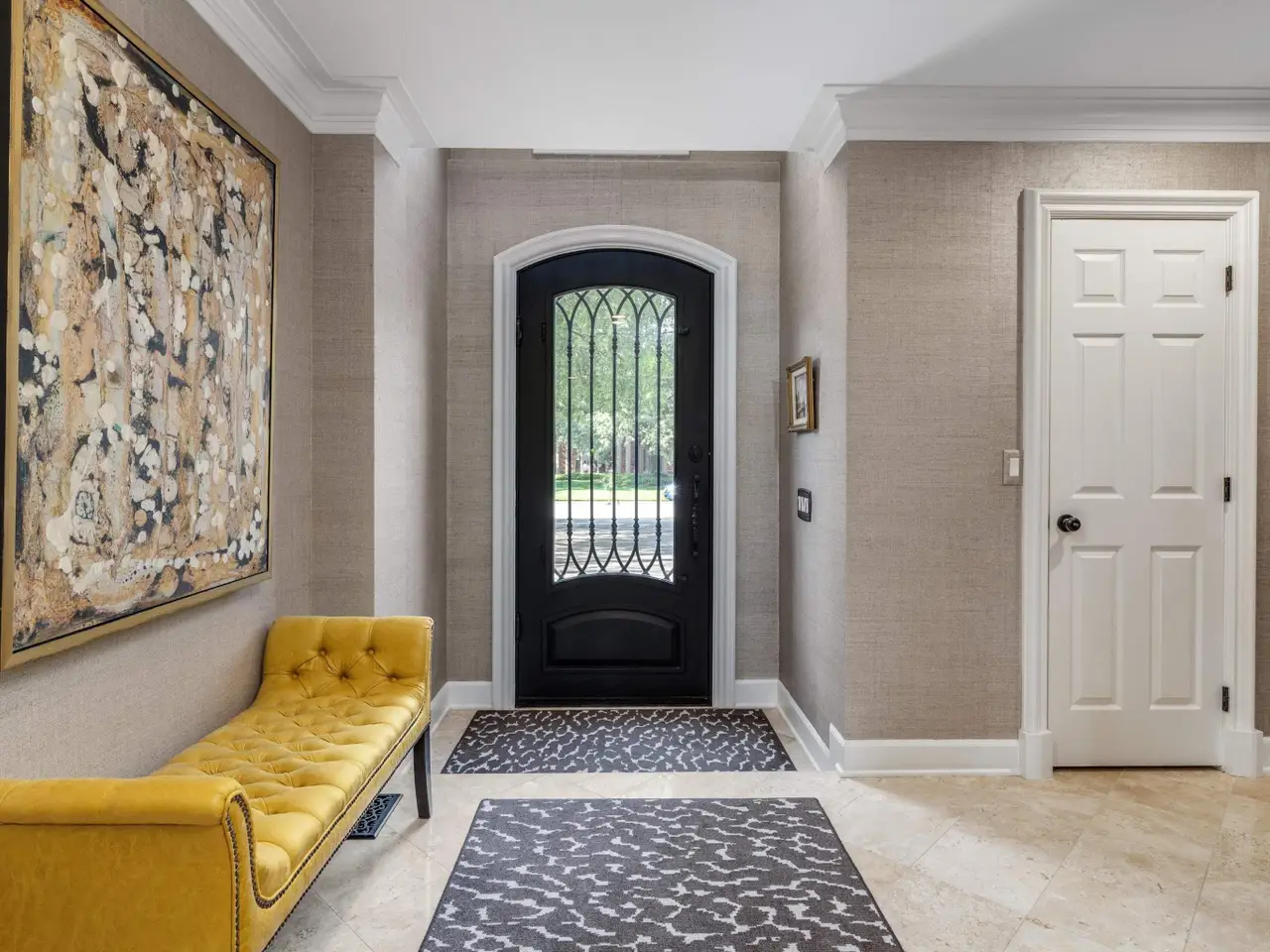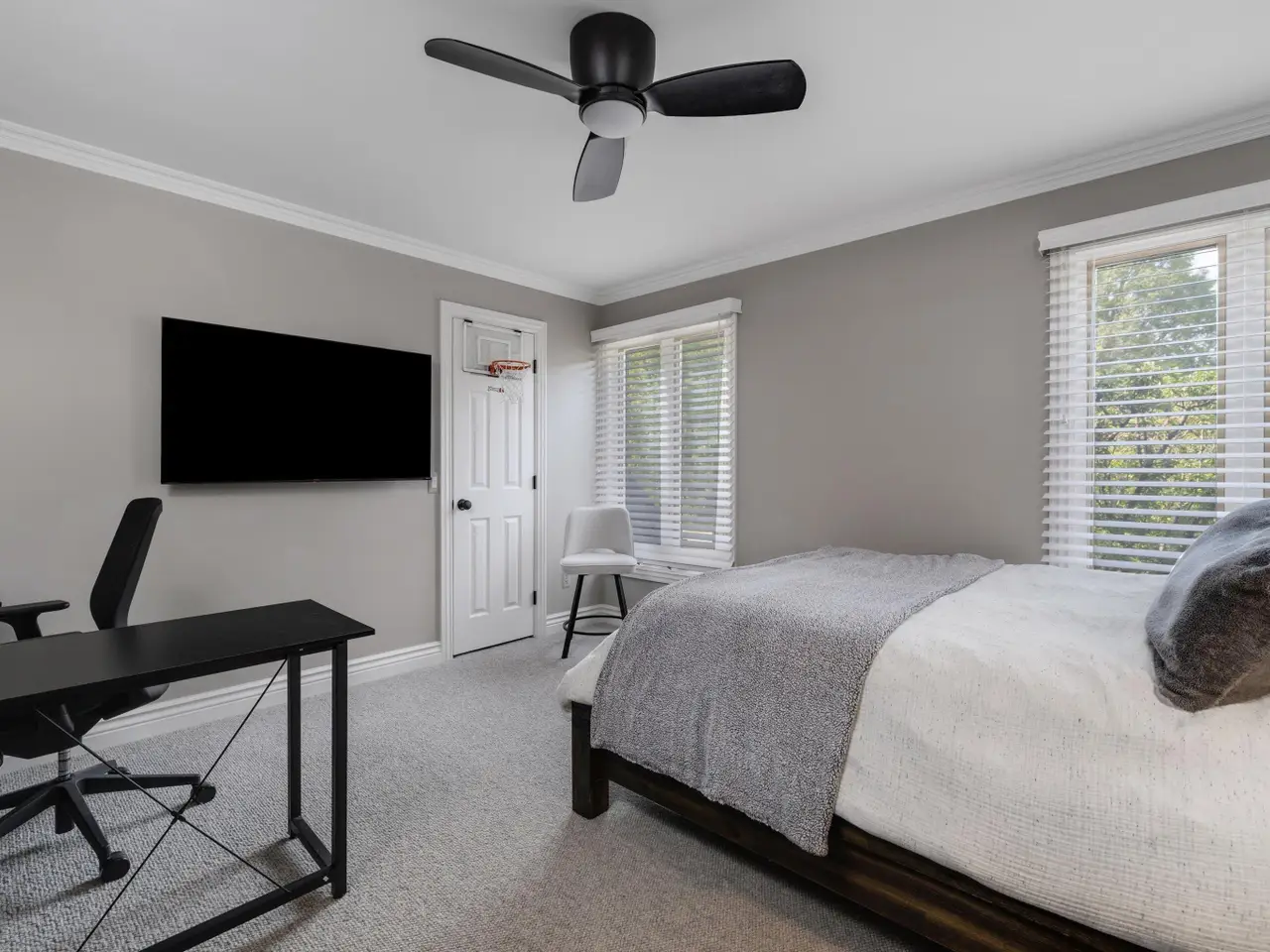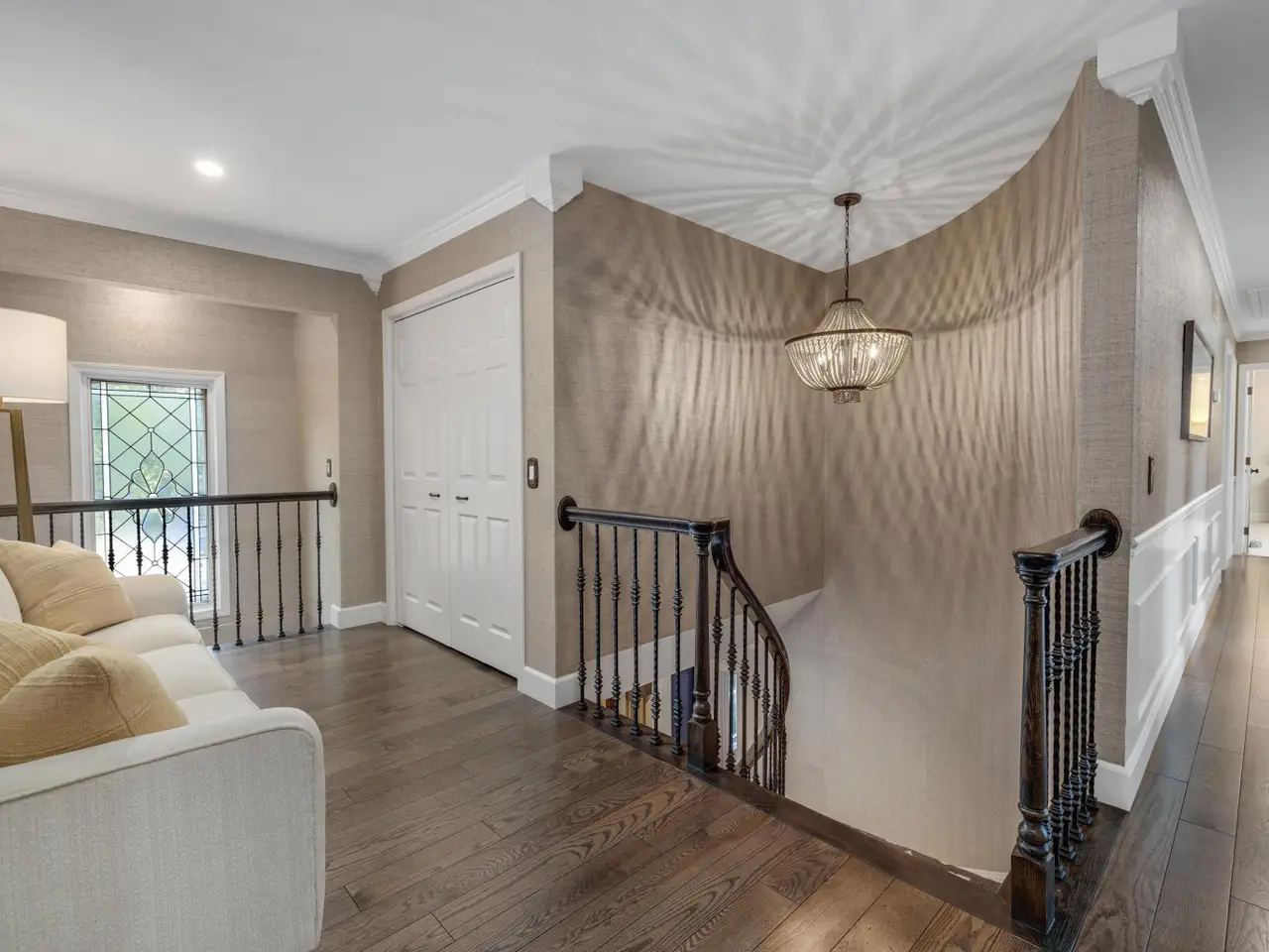 Soaring ceilings with chandelier in third bedroom