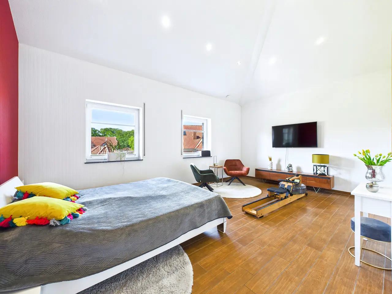 Have you always been looking for a truly exceptional home? If so, you're in for a treat - because this stylish home in the idyllic Bagband district is much more than just a house: it's an architectural statement. Built around 2006 and impressively extended in 2010, the ensemble unites three cleverly connected buildings to create a unique living concept that harmoniously combines modern design, high-quality materials and maximum living comfort. A living concept with a wow effect: As soon as you enter the central main house, you can feel the clear, timeless design language that characterizes this property. Generous window fronts flood the rooms with light and open up fantastic views of the green surroundings. The understated interior architecture allows maximum freedom of design - a real paradise for design lovers with high standards. The high-quality fitted kitchen with brand-name appliances and gas hob leaves nothing to be desired. From here you have a view of your spacious koi pond. The heart of the house is the open-plan living and dining area with fireplace, which invites you to spend sociable evenings and relaxing hours. Two bedrooms, a modern daylight bathroom with bath and shower and a bedroom with en-suite bathroom complete the main building - here too, a fireplace creates a cozy atmosphere. Work, live & enjoy - under one roof. A real highlight: the outbuilding on the right houses an impressive multi-media room with an area of approx. 103 m². The combination of state-of-the-art technology, gallery level and cozy wooden design creates an atmosphere that is second to none - ideal as a home cinema, studio or creative space. The third part of the building houses the modern double garage with additional kitchen connections and generous space for garden tools or a hobby workshop. Two converted rooms and a separate shower room await you on the upper floor - perfect as a guest, office or youth area. Garden, pool & wellness - your private vacation paradise. The park-like garden is a real hideaway: secluded, fully fenced and equipped with an 8.5 x 4.5 m outdoor pool, which can be heated to a comfortable temperature all year round thanks to a separate solar system. A modern glass cover allows bathing pleasure in (almost) any weather. The wellness facilities are complemented by a stylish wooden house with an integrated sauna - ideal for relaxing after a long day. Technology & sustainability The property is also in the top league when it comes to technology: a photovoltaic system with 15 kWh storage, state-of-the-art home technology and an alarm system with 7 outdoor cameras offer a high level of energy efficiency and security. The koi pond's filter system is housed in its own technical room. It is virtually maintenance-free and the water is topped up automatically. The entire system can be controlled via an app. It goes without saying that the entire ensemble is well maintained and ready to move into - all you have to do is move in!