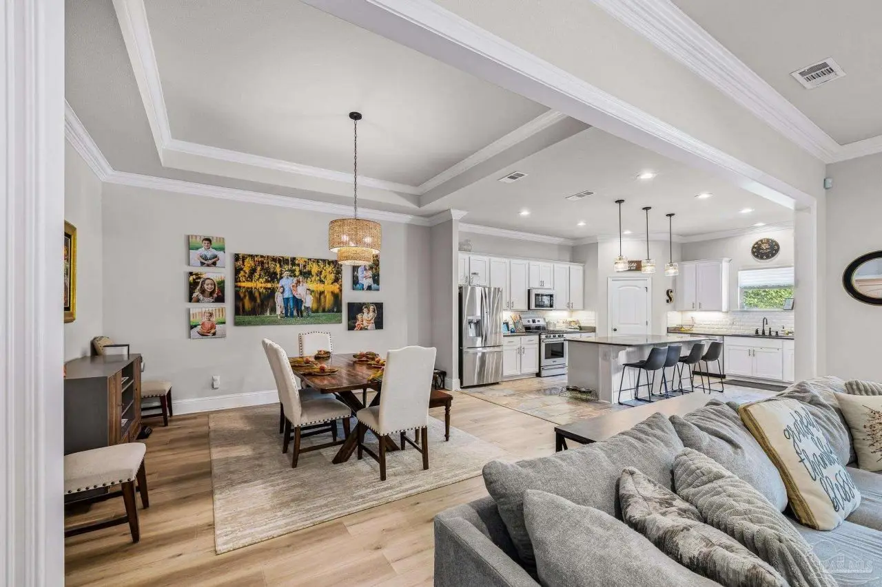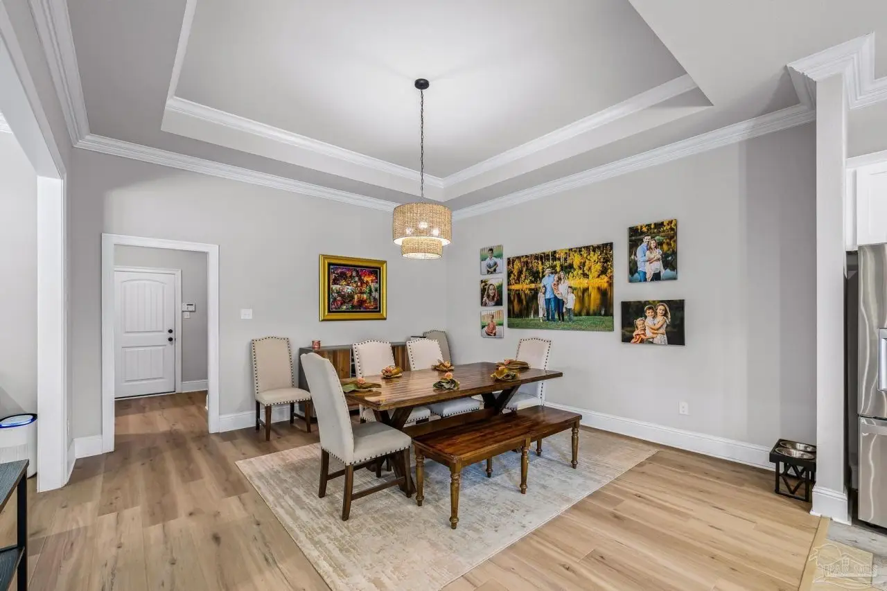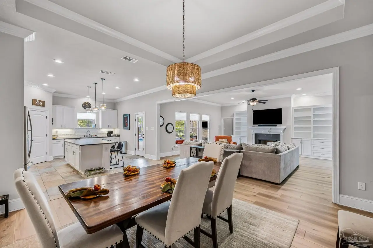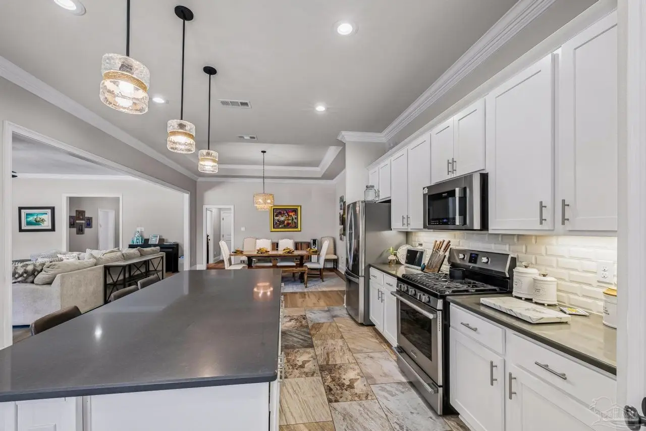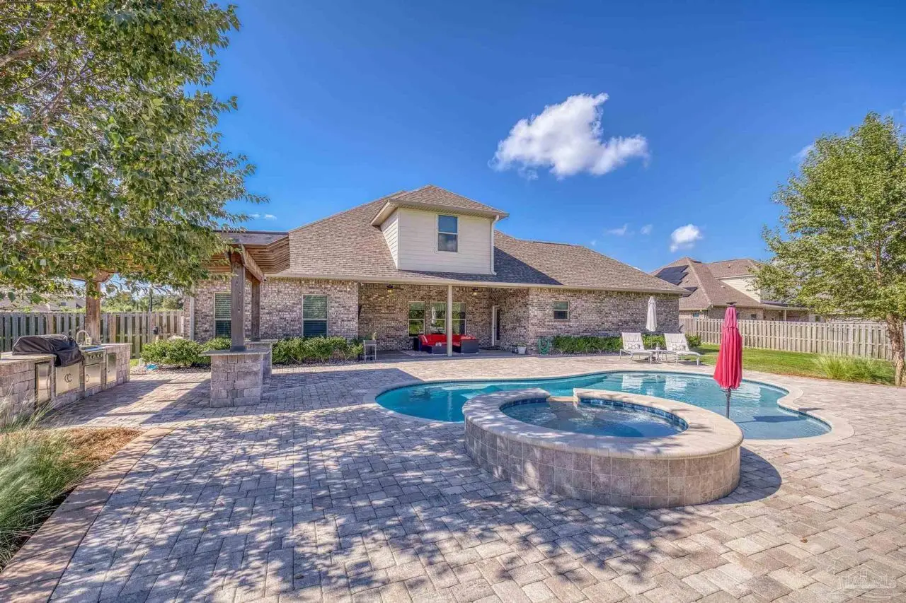 Experience refined living in this exceptional 5 bedroom, 4 bathroom residence, thoughtfully designed with both elegance and comfort in mind. Boasting a three car garage and an impressive list of upgrades, this home is truly one of a kind. Inside, you'll find new luxury vinyl plank flooring, crown molding, and striking tray ceilings that enhance the elegance of the living spaces. The gourmet kitchen is a centerpiece, featuring custom cabinetry, quartz countertops, a generous oversized island, premium stainless steel appliances, and a professional grade gas range, perfect for both casual meals and entertaining in style. The primary suite offers a private retreat, complete with a custom tiled shower, indulgent soaking tub, and dual vanities. A second bathroom with a double vanity provides added convenience, while Pfister bronze fixtures lend a timeless sophistication throughout. Designed for both leisure and wellness, the home includes a dedicated gym and an inviting living area anchored by a gas fireplace. Step outside to your own resort style haven-An expansive backyard with a gunite pool featuring ozone filtration, perfect for luxurious relaxation or gatherings with family and friends, and overlooking a serene pond for added tranquility and scenic beauty Additional premium features include a whole-house generator for peace of mind and a private well for the sprinkler system, ensuring year round curb appeal. Situated just minutes from Pensacola and Navarre Beach, and offering an easy commute to fine shopping, the airport, and leading hospitals, this property delivers the best of luxury living and everyday convenience. Don't miss the opportunity to make this exceptional estate your forever home.