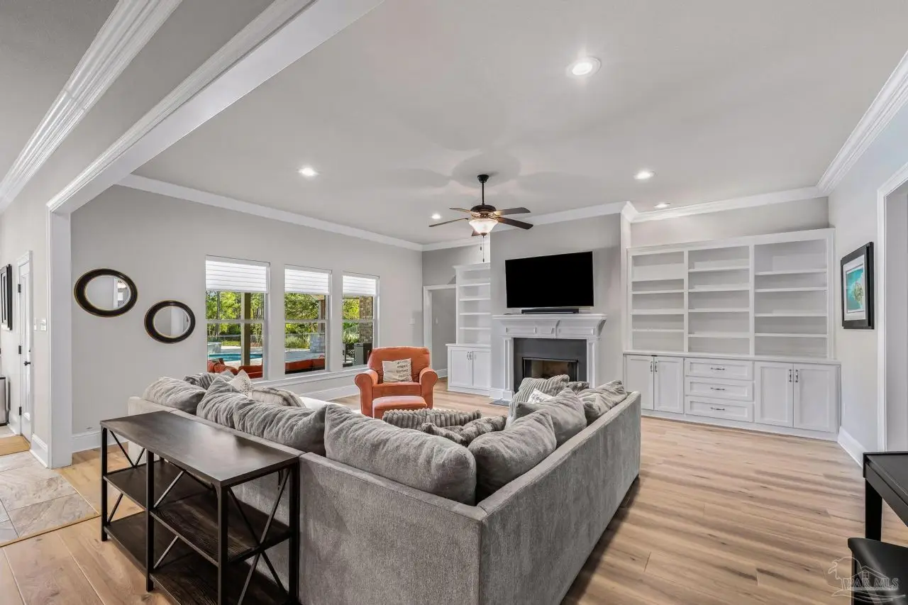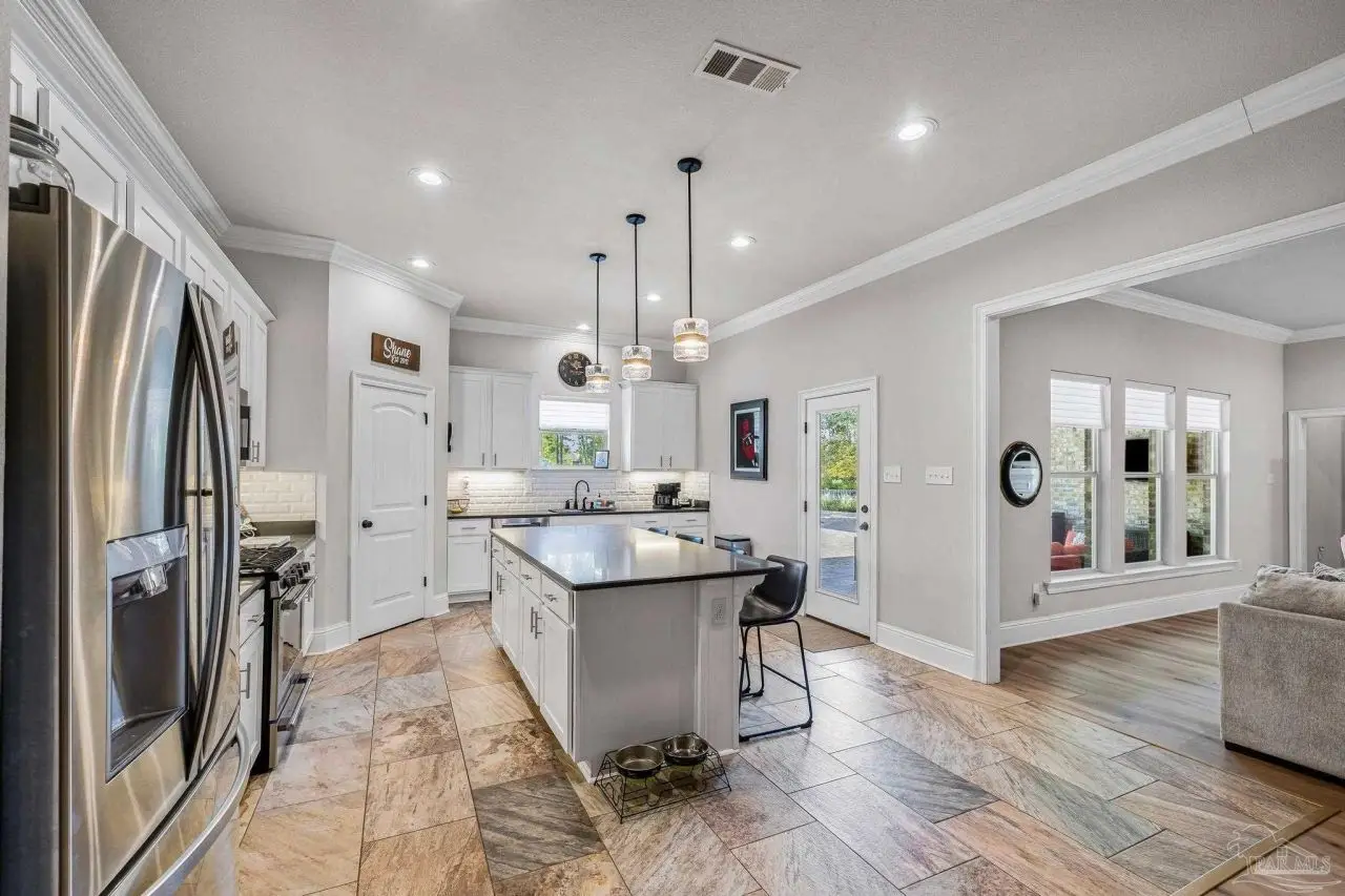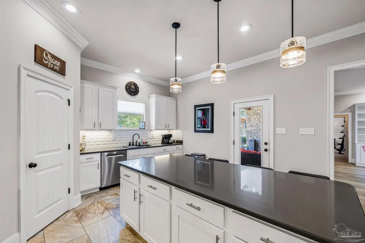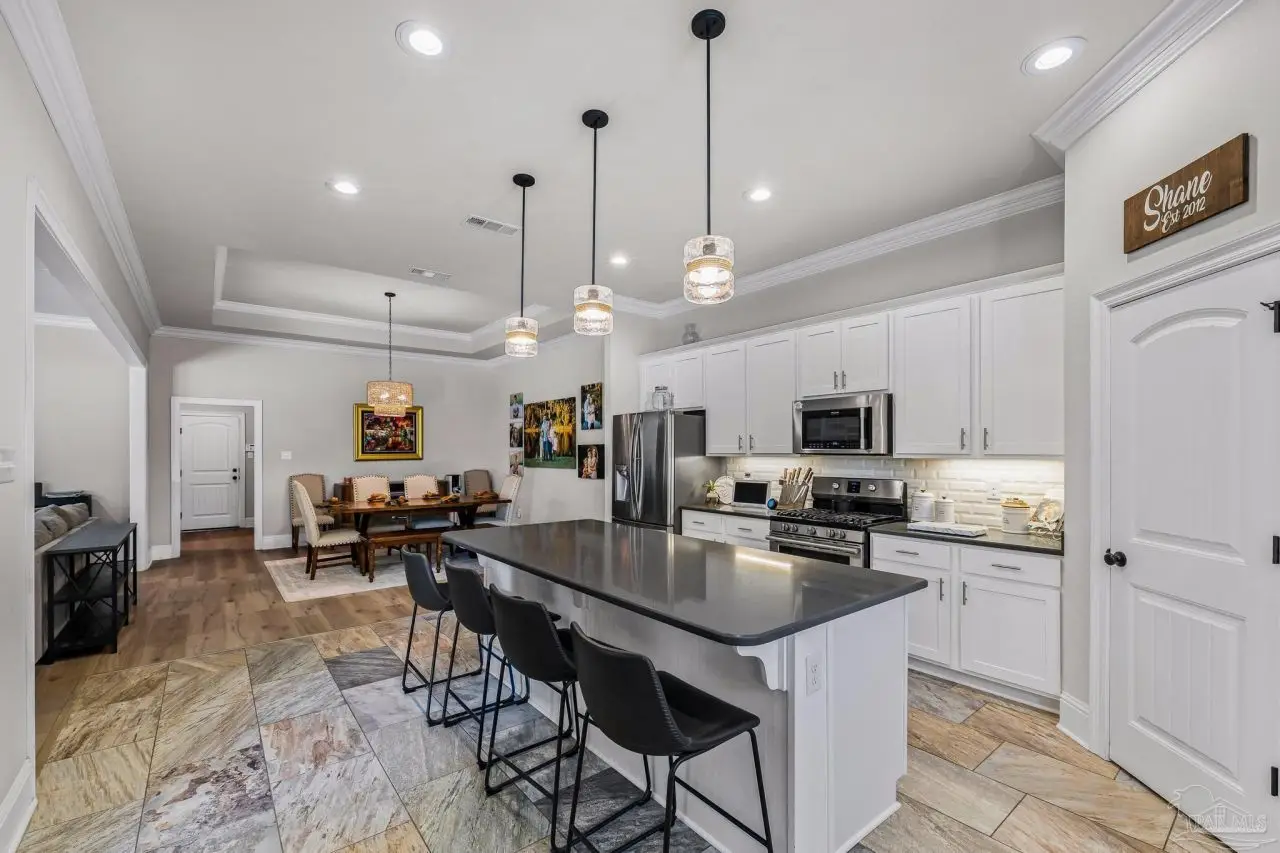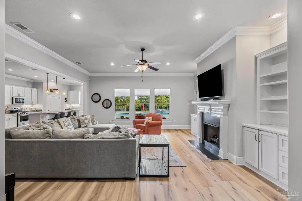Experience refined living in this exceptional 5 bedroom, 4 bathroom residence, thoughtfully designed with both elegance and comfort in mind. Boasting a three car garage and an impressive list of upgrades, this home is truly one of a kind. Inside, you'll find new luxury vinyl plank flooring, crown molding, and striking tray ceilings that enhance the elegance of the living spaces. The gourmet kitchen is a centerpiece, featuring custom cabinetry, quartz countertops, a generous oversized island, premium stainless steel appliances, and a professional grade gas range, perfect for both casual meals and entertaining in style. The primary suite offers a private retreat, complete with a custom tiled shower, indulgent soaking tub, and dual vanities. A second bathroom with a double vanity provides added convenience, while Pfister bronze fixtures lend a timeless sophistication throughout. Designed for both leisure and wellness, the home includes a dedicated gym and an inviting living area anchored by a gas fireplace. Step outside to your own resort style haven-An expansive backyard with a gunite pool featuring ozone filtration, perfect for luxurious relaxation or gatherings with family and friends, and overlooking a serene pond for added tranquility and scenic beauty Additional premium features include a whole-house generator for peace of mind and a private well for the sprinkler system, ensuring year round curb appeal. Situated just minutes from Pensacola and Navarre Beach, and offering an easy commute to fine shopping, the airport, and leading hospitals, this property delivers the best of luxury living and everyday convenience. Don't miss the opportunity to make this exceptional estate your forever home.