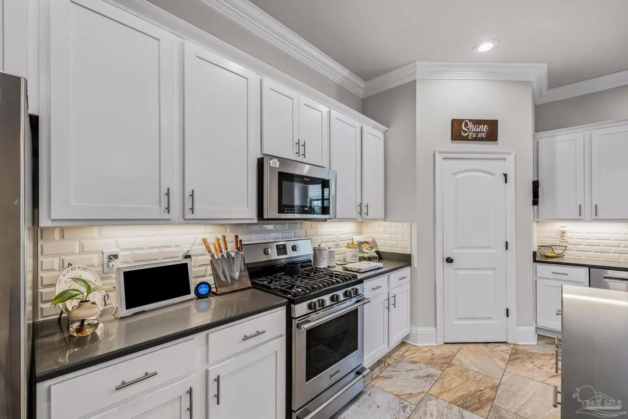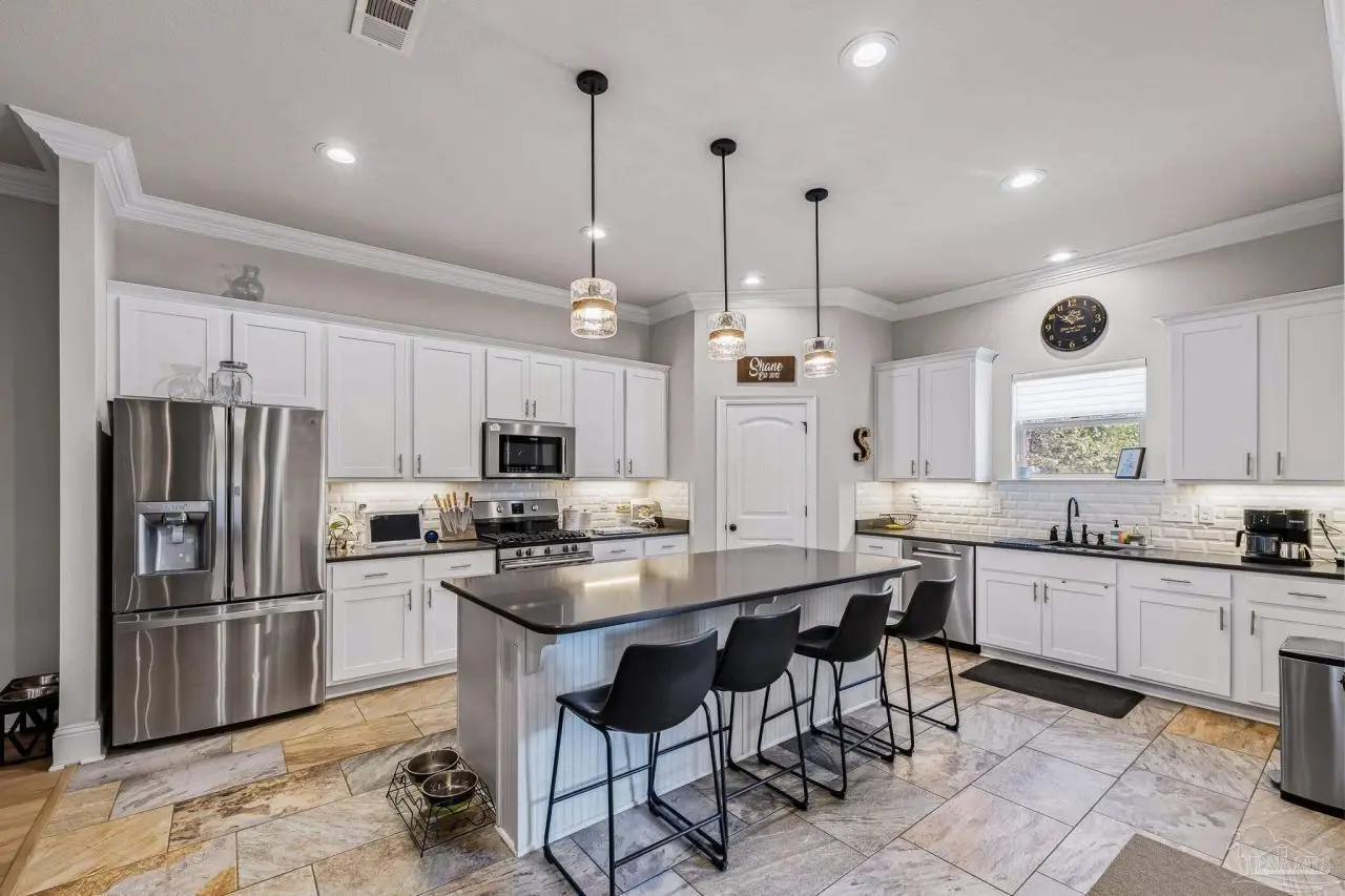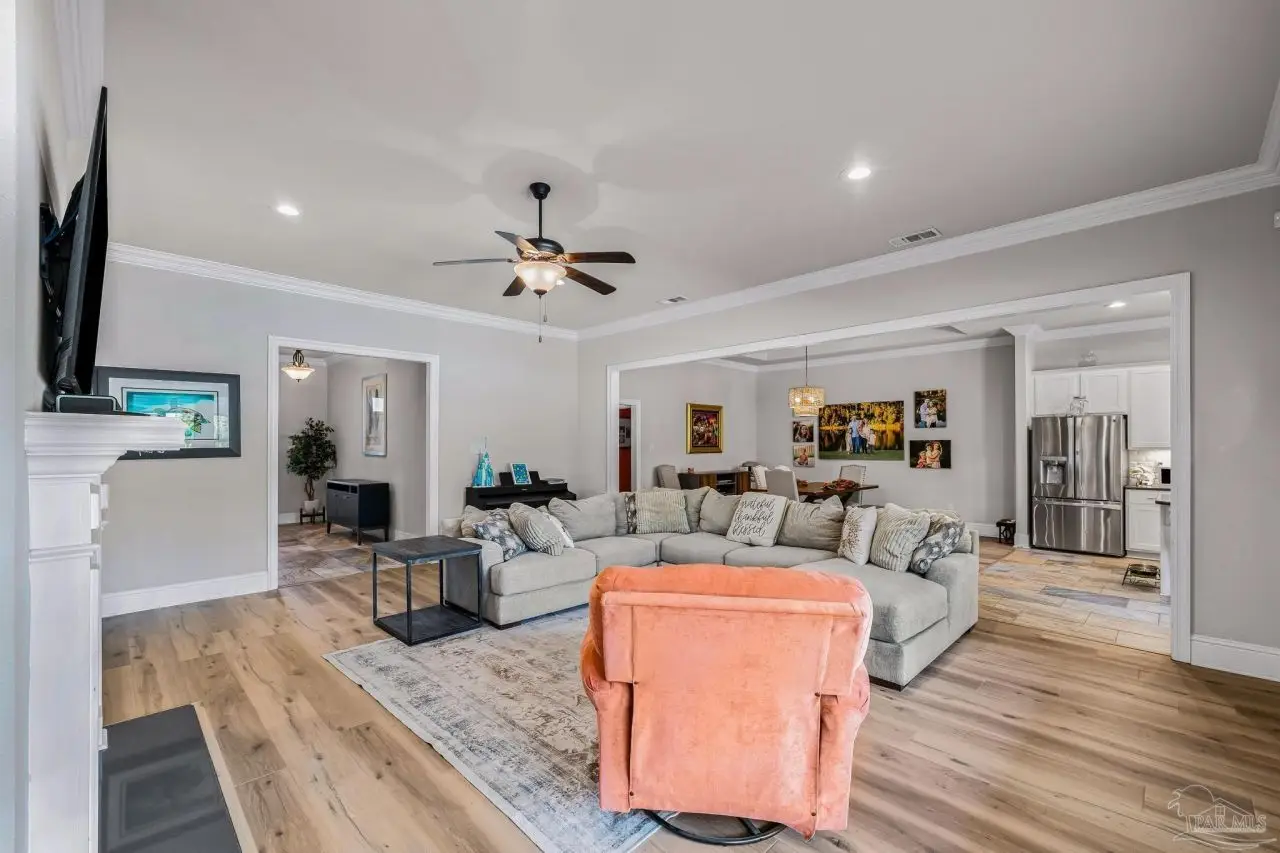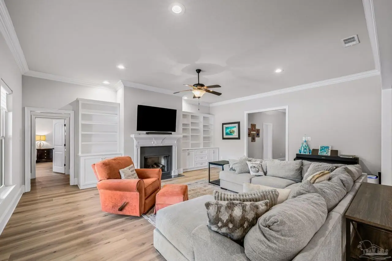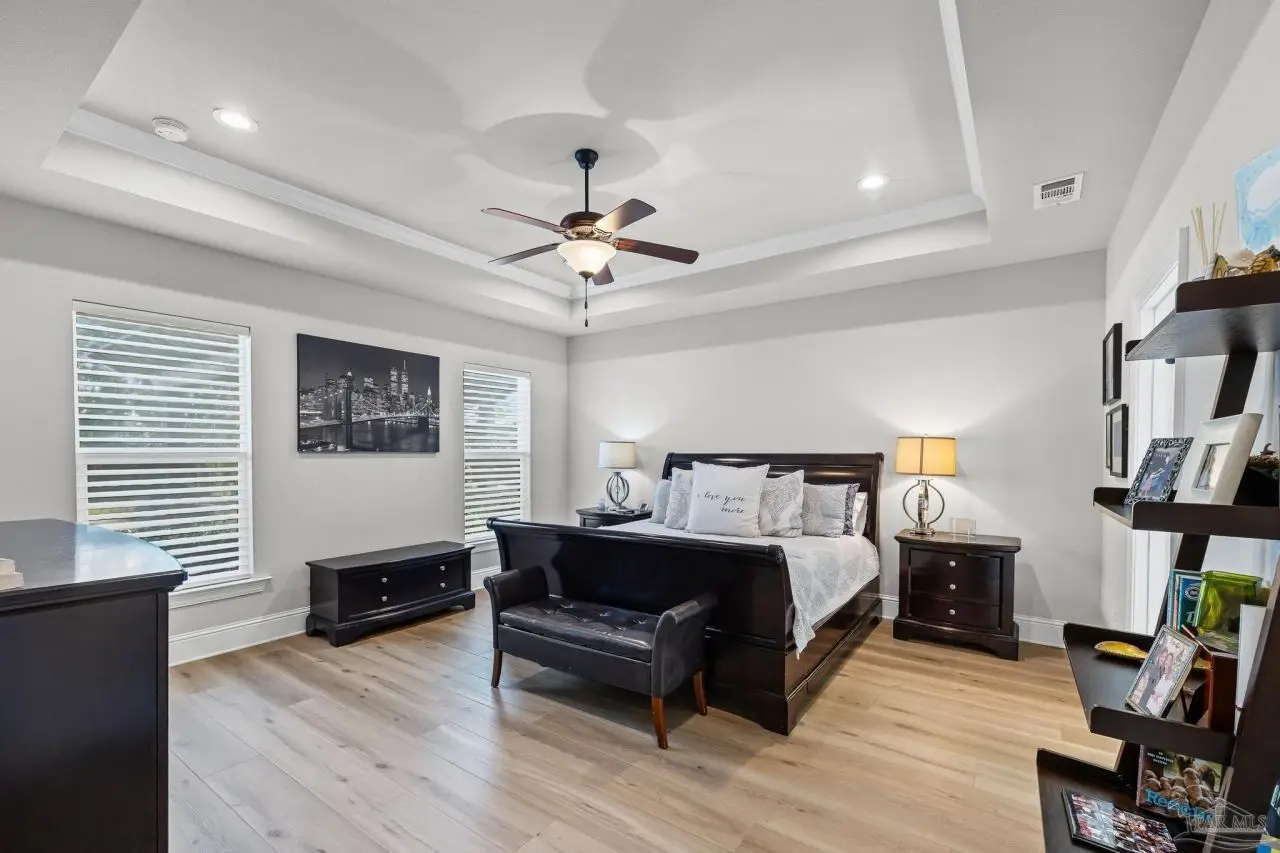 Experience refined living in this exceptional 5 bedroom, 4 bathroom residence, thoughtfully designed with both elegance and comfort in mind. Boasting a three car garage and an impressive list of upgrades, this home is truly one of a kind. Inside, you'll find new luxury vinyl plank flooring, crown molding, and striking tray ceilings that enhance the elegance of the living spaces. The gourmet kitchen is a centerpiece, featuring custom cabinetry, quartz countertops, a generous oversized island, premium stainless steel appliances, and a professional grade gas range, perfect for both casual meals and entertaining in style. The primary suite offers a private retreat, complete with a custom tiled shower, indulgent soaking tub, and dual vanities. A second bathroom with a double vanity provides added convenience, while Pfister bronze fixtures lend a timeless sophistication throughout. Designed for both leisure and wellness, the home includes a dedicated gym and an inviting living area anchored by a gas fireplace. Step outside to your own resort style haven-An expansive backyard with a gunite pool featuring ozone filtration, perfect for luxurious relaxation or gatherings with family and friends, and overlooking a serene pond for added tranquility and scenic beauty Additional premium features include a whole-house generator for peace of mind and a private well for the sprinkler system, ensuring year round curb appeal. Situated just minutes from Pensacola and Navarre Beach, and offering an easy commute to fine shopping, the airport, and leading hospitals, this property delivers the best of luxury living and everyday convenience. Don't miss the opportunity to make this exceptional estate your forever home.