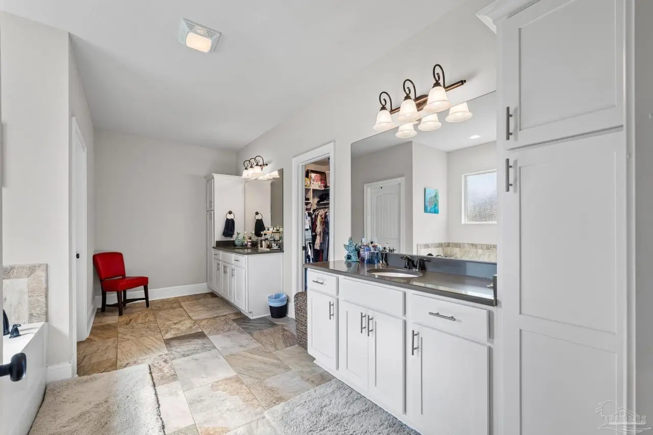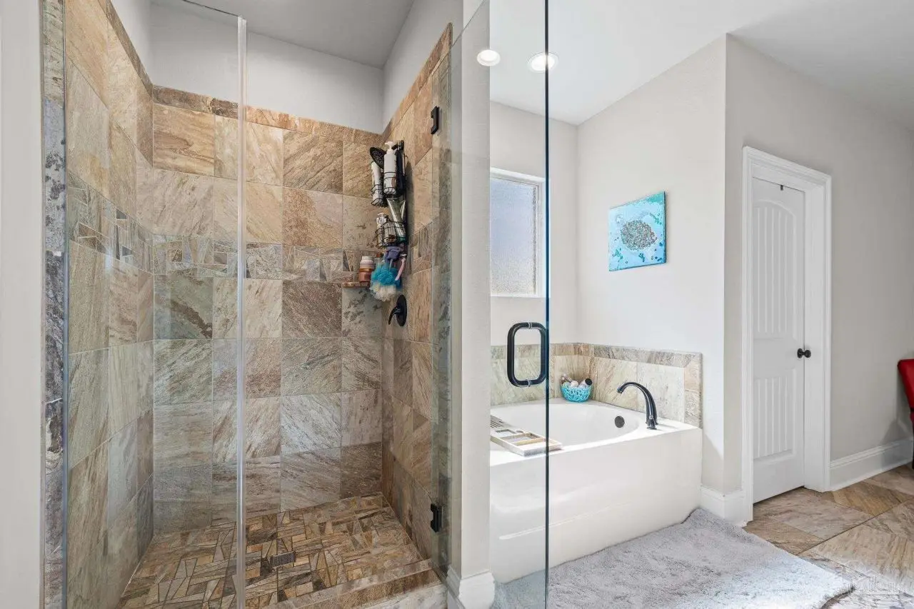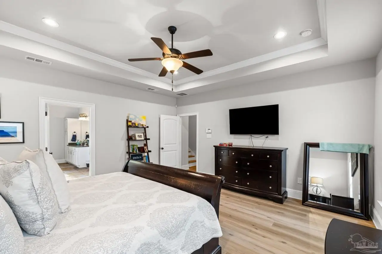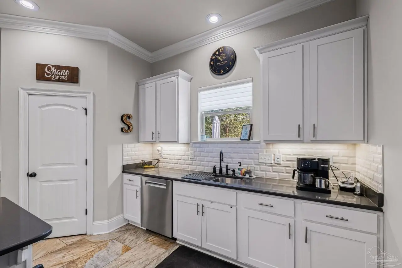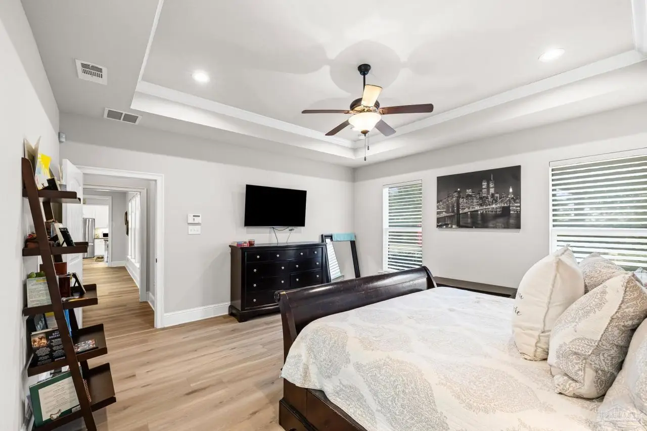 Experience refined living in this exceptional 5 bedroom, 4 bathroom residence, thoughtfully designed with both elegance and comfort in mind. Boasting a three car garage and an impressive list of upgrades, this home is truly one of a kind. Inside, you'll find new luxury vinyl plank flooring, crown molding, and striking tray ceilings that enhance the elegance of the living spaces. The gourmet kitchen is a centerpiece, featuring custom cabinetry, quartz countertops, a generous oversized island, premium stainless steel appliances, and a professional grade gas range, perfect for both casual meals and entertaining in style. The primary suite offers a private retreat, complete with a custom tiled shower, indulgent soaking tub, and dual vanities. A second bathroom with a double vanity provides added convenience, while Pfister bronze fixtures lend a timeless sophistication throughout. Designed for both leisure and wellness, the home includes a dedicated gym and an inviting living area anchored by a gas fireplace. Step outside to your own resort style haven-An expansive backyard with a gunite pool featuring ozone filtration, perfect for luxurious relaxation or gatherings with family and friends, and overlooking a serene pond for added tranquility and scenic beauty Additional premium features include a whole-house generator for peace of mind and a private well for the sprinkler system, ensuring year round curb appeal. Situated just minutes from Pensacola and Navarre Beach, and offering an easy commute to fine shopping, the airport, and leading hospitals, this property delivers the best of luxury living and everyday convenience. Don't miss the opportunity to make this exceptional estate your forever home.