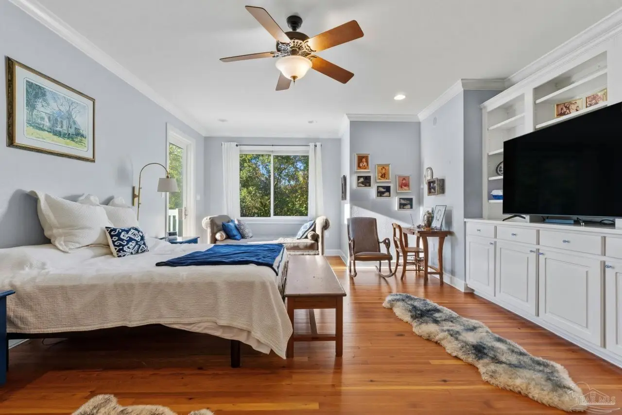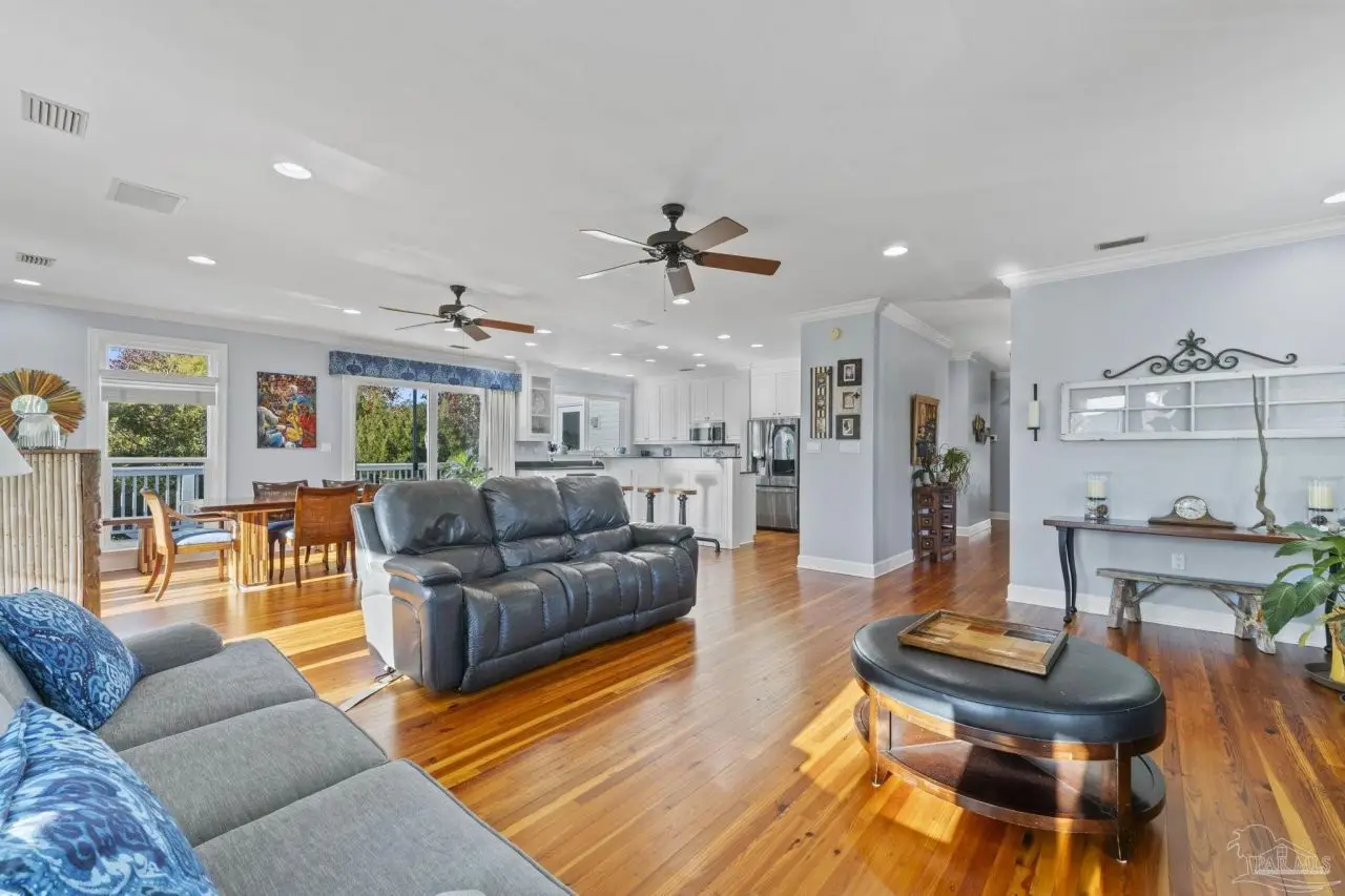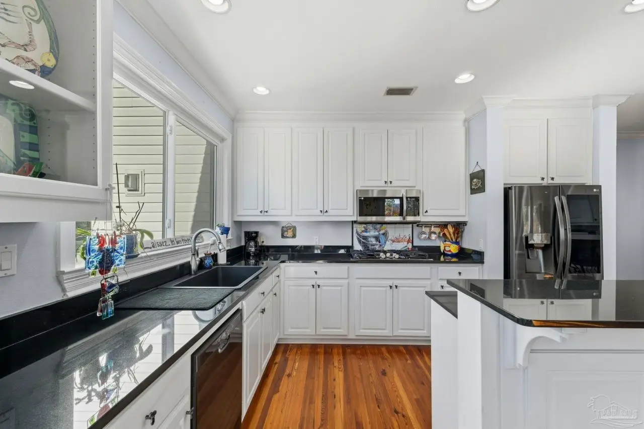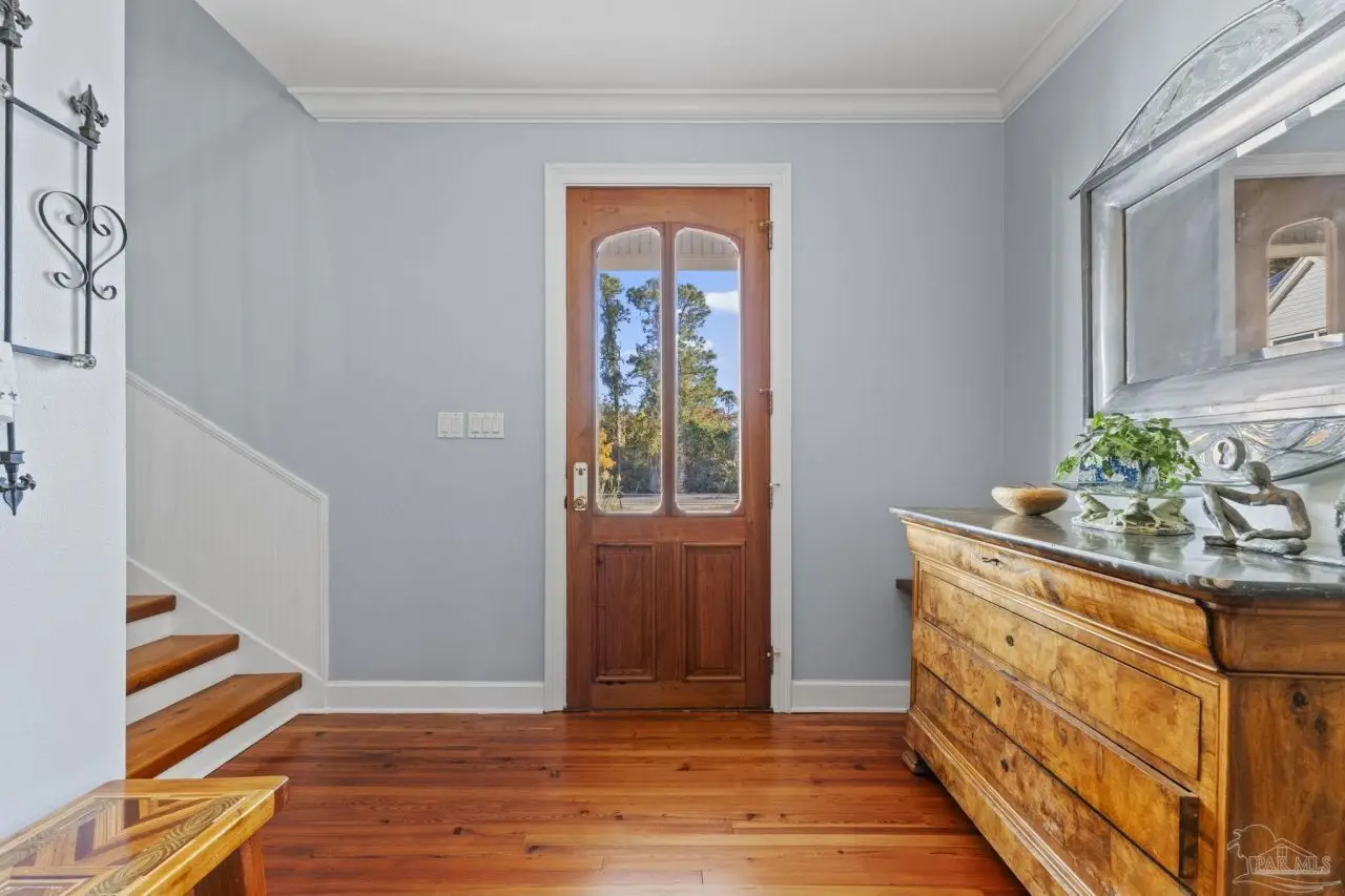 Tucked away on a private lot in the heart of Gulf Breeze Proper, this beautifully maintained home offers over 4,300 square feet of refined living space. The location feels secluded yet remains close to community amenities including the recreation center, parks, boat ramp, and top-rated Gulf Breeze schools. The home includes a long-lasting metal roof designed for durability and fully paid solar panels for efficient, low-maintenance living. Inside, restored 1898 heart pine floors, abundant natural light, and high ceilings create a warm and inviting atmosphere throughout. The kitchen features quartz countertops, dual wall ovens, a gas range, and a large island with custom bar stool seating. Just off the main living area, a spacious screened-in patio provides a comfortable place to unwind outdoors, while a large balcony offers elevated views and additional space for entertaining. Functional features such as a mudroom, laundry chute, and a three-car garage with a workshop and half bath add everyday convenience. The primary suite includes a relaxing steam shower and serene views, while additional bedrooms provide generous space and storage. Connected to the main home by a covered breezeway, an apartment offers its own full kitchen and living area, ideal for guests, extended family, or flexible use. Homes like this are rarely offered, making this a special opportunity in a highly desirable location.