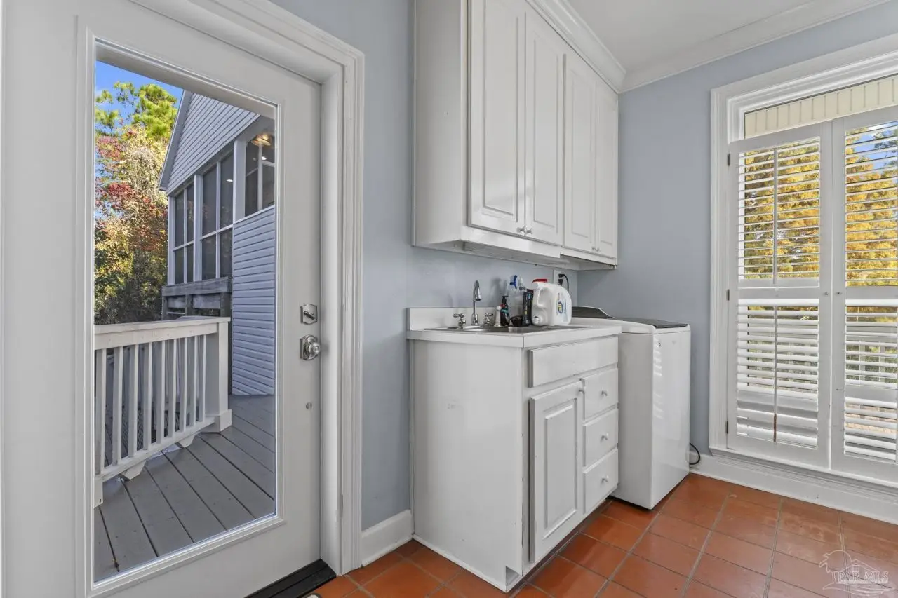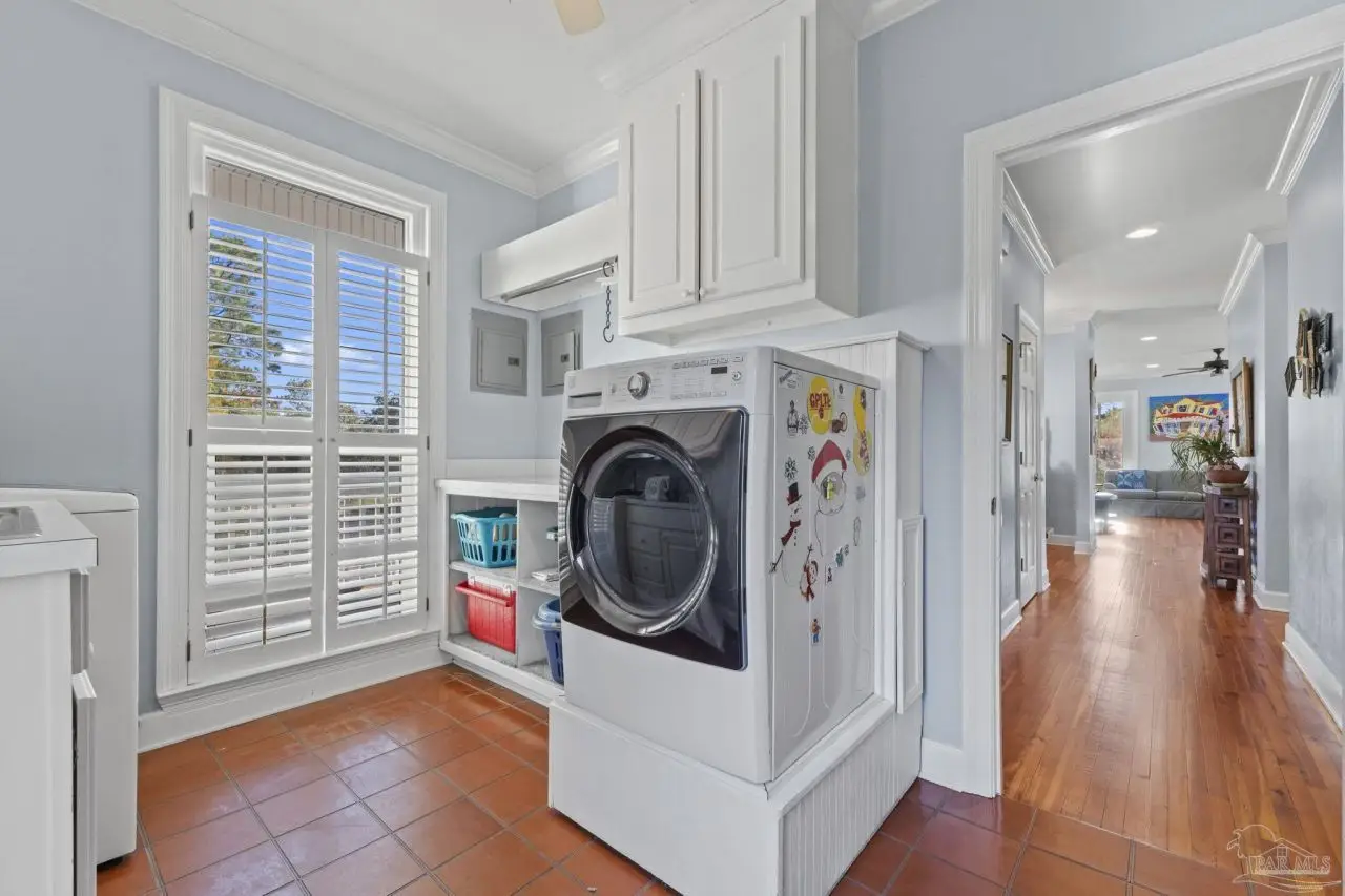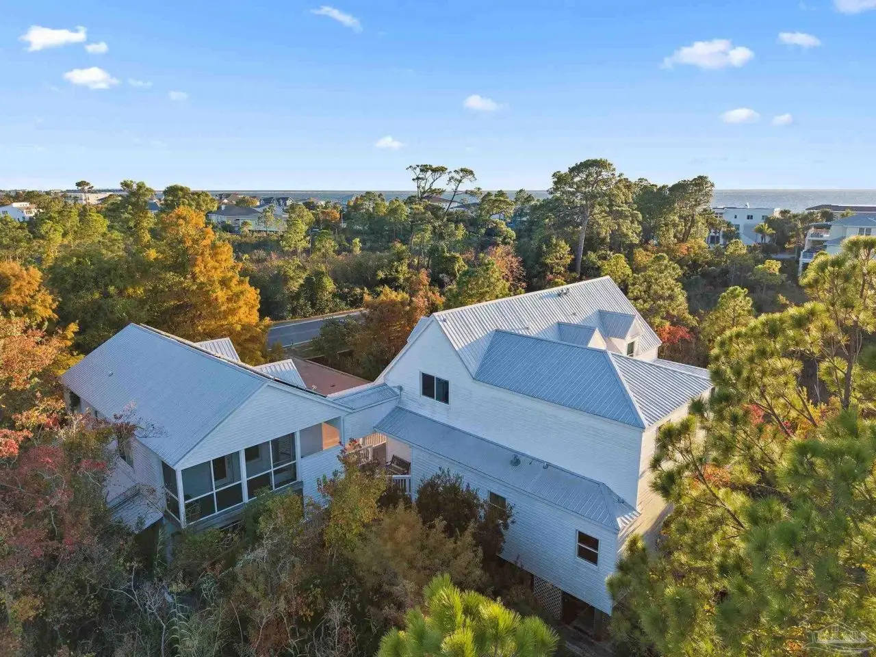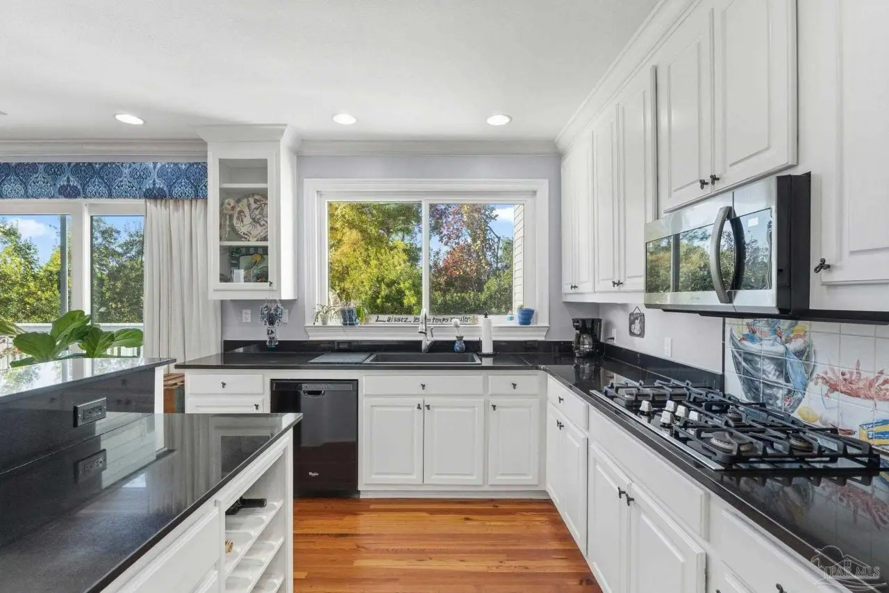 Tucked away on a private lot in the heart of Gulf Breeze Proper, this beautifully maintained home offers over 4,300 square feet of refined living space. The location feels secluded yet remains close to community amenities including the recreation center, parks, boat ramp, and top-rated Gulf Breeze schools. The home includes a long-lasting metal roof designed for durability and fully paid solar panels for efficient, low-maintenance living. Inside, restored 1898 heart pine floors, abundant natural light, and high ceilings create a warm and inviting atmosphere throughout. The kitchen features quartz countertops, dual wall ovens, a gas range, and a large island with custom bar stool seating. Just off the main living area, a spacious screened-in patio provides a comfortable place to unwind outdoors, while a large balcony offers elevated views and additional space for entertaining. Functional features such as a mudroom, laundry chute, and a three-car garage with a workshop and half bath add everyday convenience. The primary suite includes a relaxing steam shower and serene views, while additional bedrooms provide generous space and storage. Connected to the main home by a covered breezeway, an apartment offers its own full kitchen and living area, ideal for guests, extended family, or flexible use. Homes like this are rarely offered, making this a special opportunity in a highly desirable location.