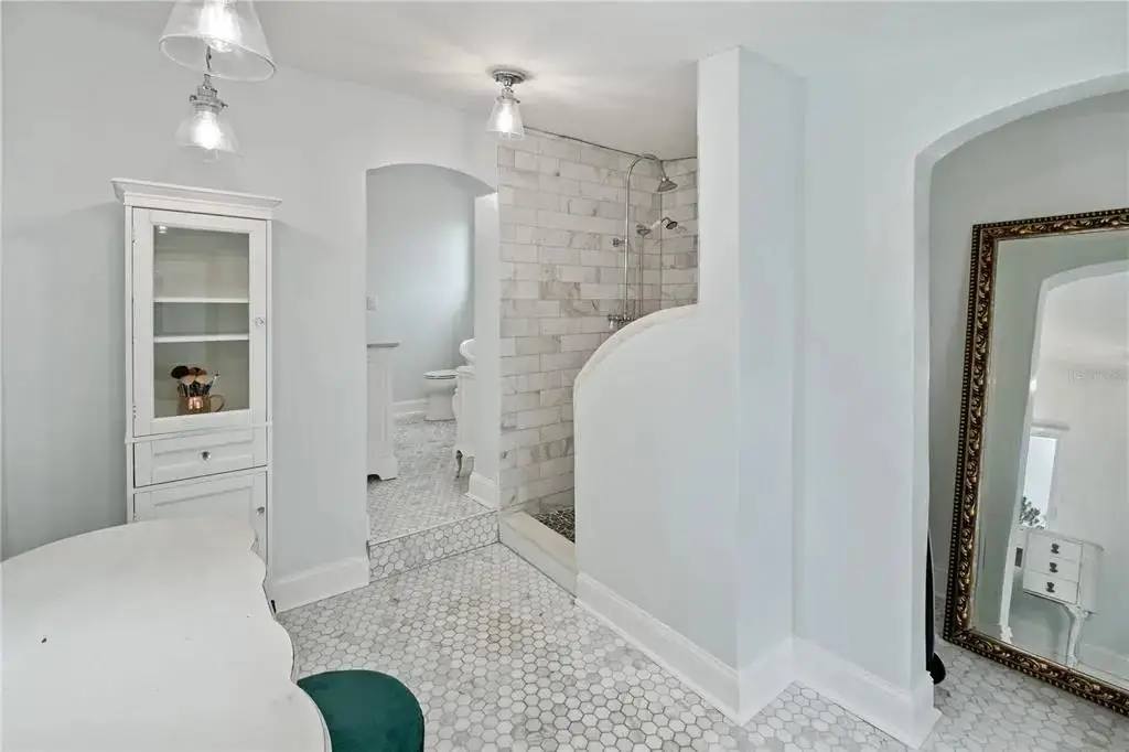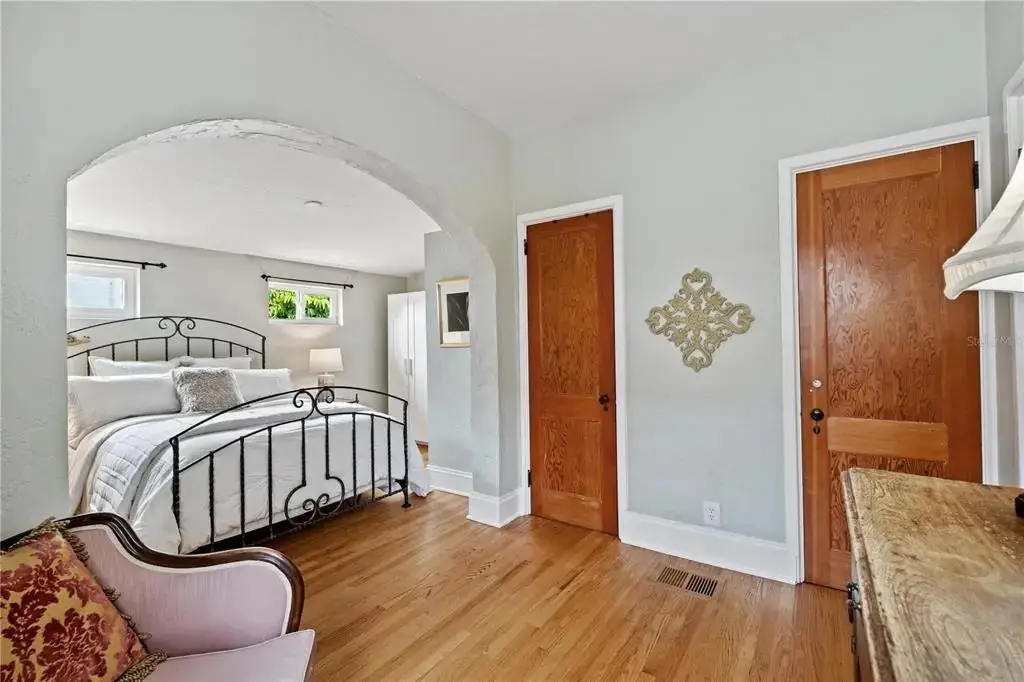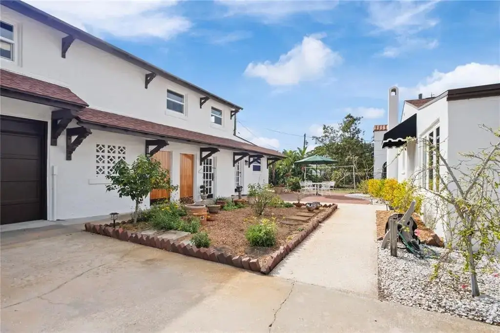 Stately Spanish Mediterranean Revival pool home located in Gulfport, Florida. On nearly a full acre, this home was built during the time when the cities of Pasadena and Gulfport were seeing their booming years. Adjacent to Florida’s first law school, Stetson School of Law, and on a Non-Flood zone! When you step into this 1923 home you will quickly appreciate the architectural features and details of an era gone by, with upgrades to suit modern life. The main house floor plan design takes you through a formal living room featuring a large gas fireplace, original wood floors, an abundance of natural light, motif-drawn ceiling wooden beams, and French doors leading to the studio, or ‘sleeping room’ exhibiting meticulous ‘Cuban Tile’ floors. The formal dining room and informal living room are flanked by large windows allowing a continuous abundance of natural light. The first floor en-suite master bedroom, worthy of being consider a secondary main bedroom, features a large arch, and its own stone fireplace. The well appointed modern day kitchen with tall ceilings, exquisite hearts of pine wood floors, includes a large 6-burner gas range alongside stainless steel appliances, and a unique step-down walk-in pantry cellar, providing ample kitchen storage. There’s also a quaint guest half bath. Upstairs, you will find the main en-suite bedroom with balcony access, and a large walk-in closet. Finishing up the upstairs is the third bedroom, currently used as an office, and guest bathroom with claw foot tub and more unique features. The “Carriage House” across the garden, houses the laundry room, a spacious en-suite guest suite with direct access to the heated pool and sprawling lawn, a 2-car garage with work bench, and an additional 1-car carport. On the second story of the Carriage house, you will find a large flex space, currently being used as a Gym, as well as a full bathroom. Additionally, a detached 2-car carport, and a large driveway provide ample entertaining parking. The immense back yard has direct access to the rear street (nearly a block away), providing easy parking access for large vessels such as boat trailers, motorhomes, or to park your very own Gasparilla float. Impact windows throughout, new roof, A/C units 2018 & 2022, salt heated pool, termite warranty and pest control warranties are both transferable. Gulfport, only a few miles from downtown Saint Petersburg, is a thriving quaint town with its own beach, shops, tennis courts, softball fields, library, restaurants, marina, and the legendary Casino where you can hold large events. Gulfport is also a prominent spot for artists of all type of media. Make Gulfport your home, contact us as soon as possible to preview this awesome unique property!