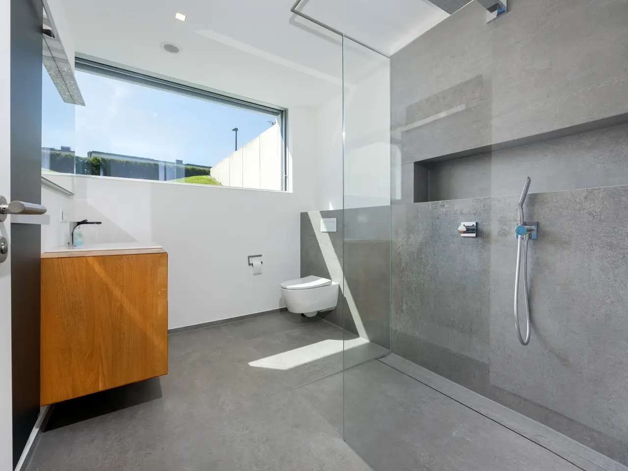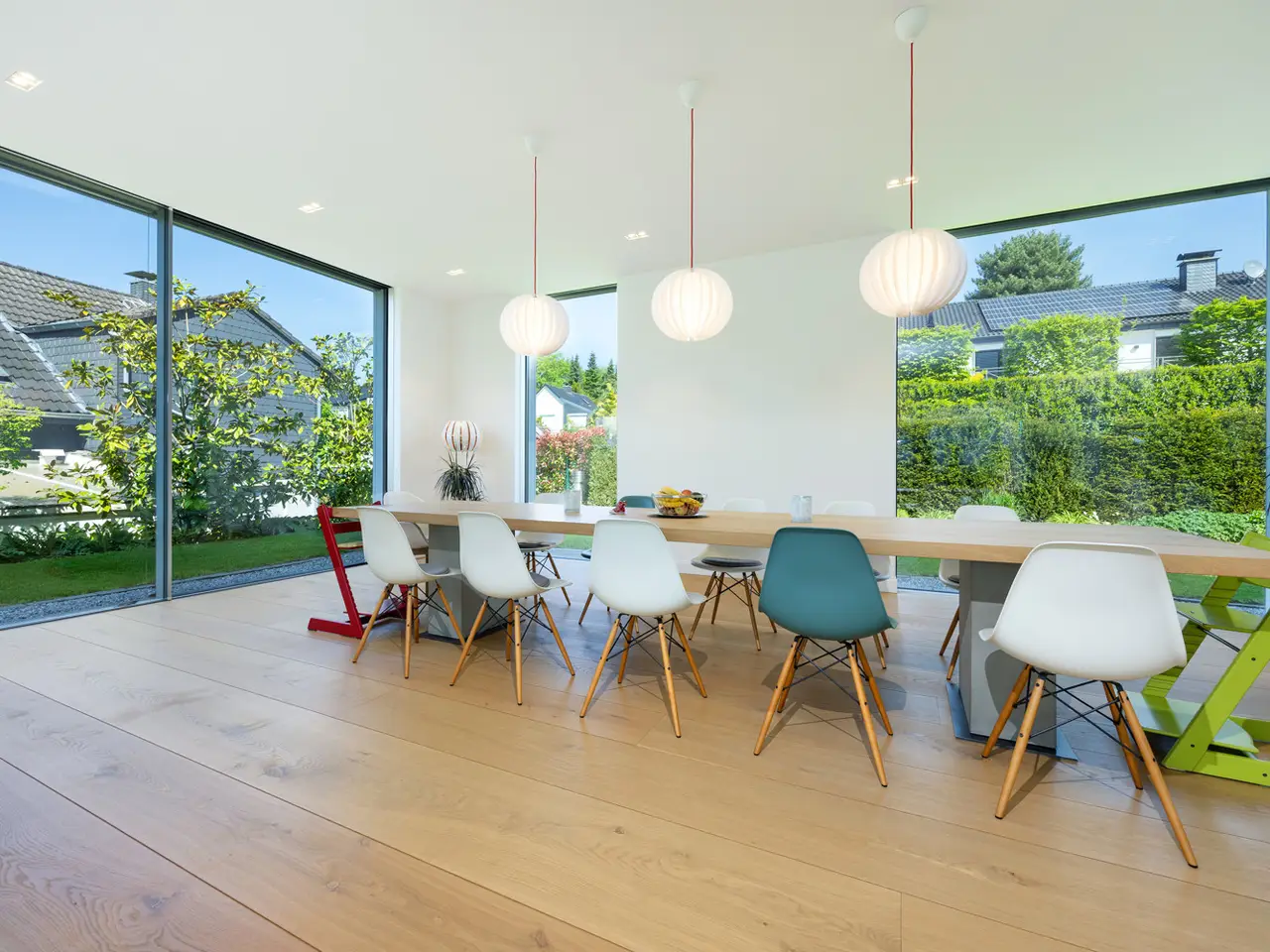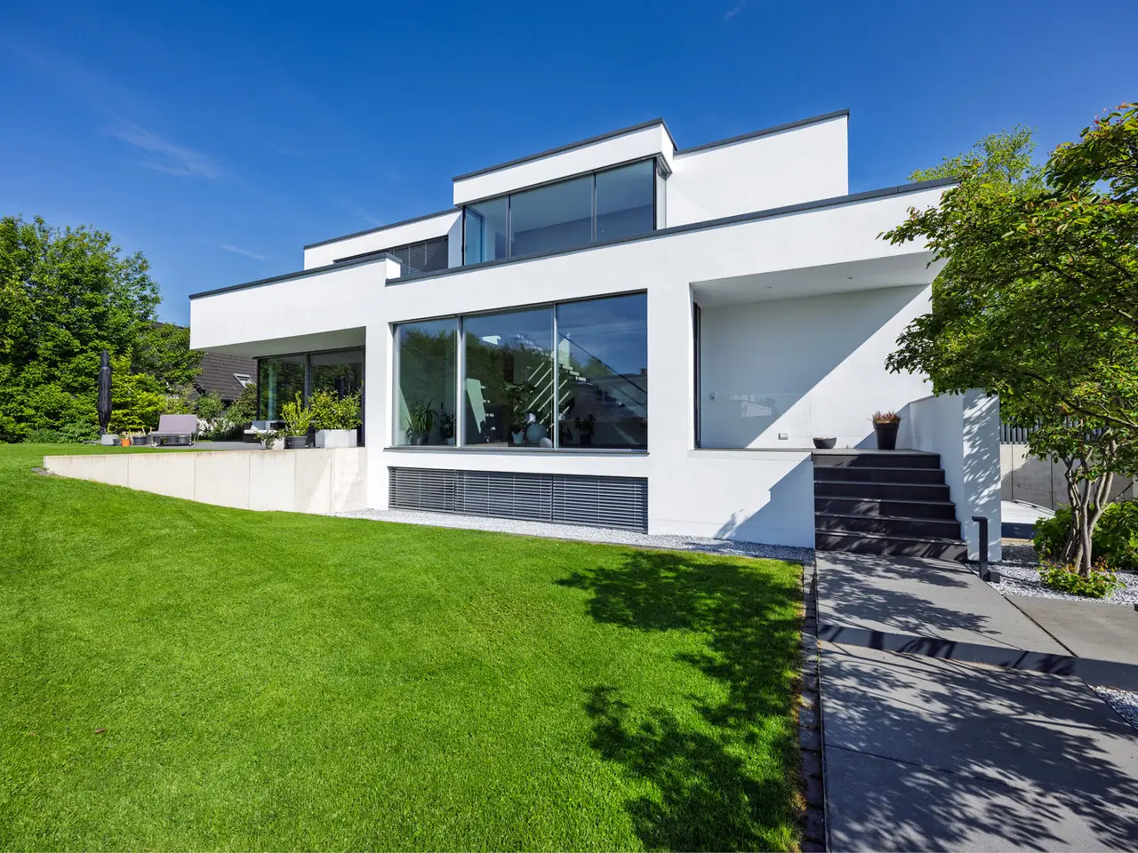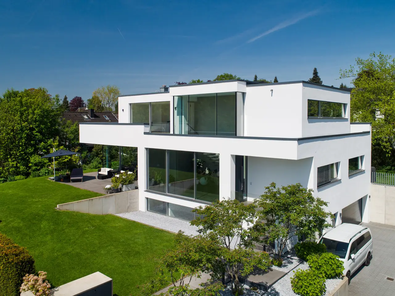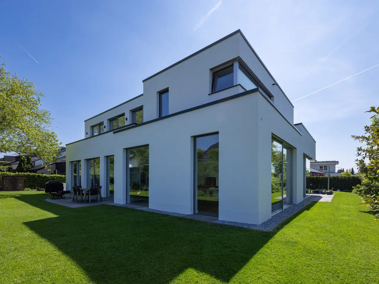 This modern villa, including a large granny apartment, completed in 2019, is situated on a plot of approx. 1,088 m² and offers a living space of around 380 m². This as-new property with its exceptional design and high-quality fixtures and fittings impresses with its generous room layout and technical refinements. The light-flooded first floor with a room height of 3.00 meters impresses with floor-to-ceiling Sky Frame windows, some equipped with electric drives and complemented by electric blinds in a Venetian blind design. Floor-to-ceiling sliding doors on the first floor and floor-to-ceiling doors on the upper floor ensure an extraordinary sense of space as well as perfect lines of sight and light. There are eight spacious rooms in the villa, including five bedrooms. The three stylishly furnished bathrooms offer maximum comfort and have been designed with extra-long and wide tiles. The living/dining area is divided by an elegant fireplace, which can be seen from three sides through glass surfaces, creating a pleasant atmosphere. High-quality oak floorboards, five meters long and extra wide, underline the elegant ambience of the house. The modern Bulthaup kitchen is equipped with high-quality appliances and offers plenty of space for culinary development. Another gastronomic highlight is the in-house wine cellar. The villa's climate-friendly energy concept is supported by a geothermal heat pump, a photovoltaic system and underfloor heating. A central ventilation system ensures a pleasant indoor climate. The property also has a smart KNX bus system for convenient control of the building services. An outstanding feature of this villa is the heated underground garage with six parking spaces and three additional outdoor parking spaces. A separate apartment with two rooms, fitted kitchen and bathroom is available for guests or staff and can be accessed via a separate entrance. The property meets the highest standards of living quality and energy efficiency and is ideal for families or discerning individualists who value exclusive living. The residential location offers good connections and a quiet but central residential area. Please contact us for further information or to arrange a viewing appointment to see this unique residential offer for yourself.