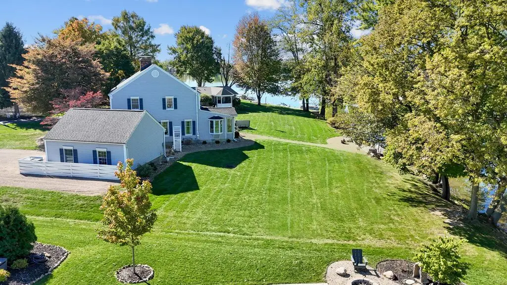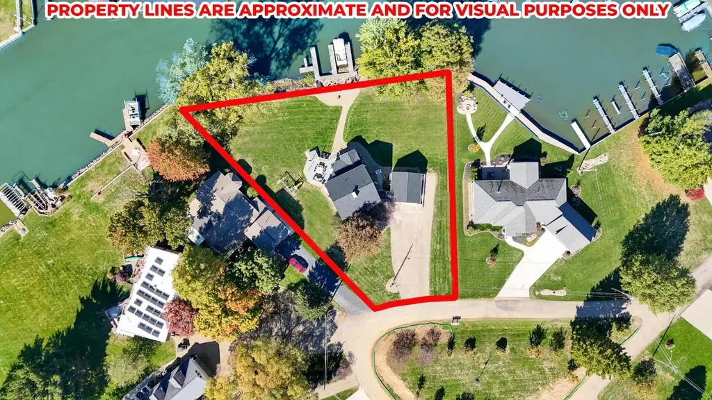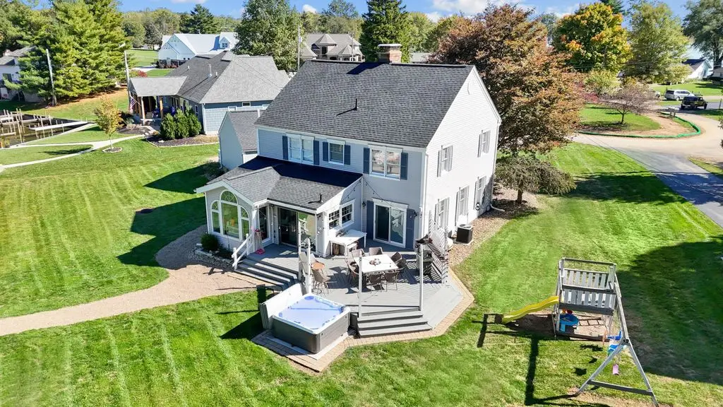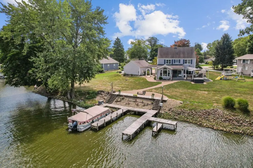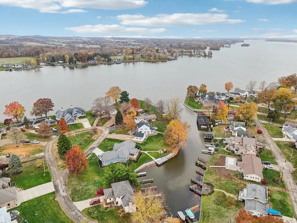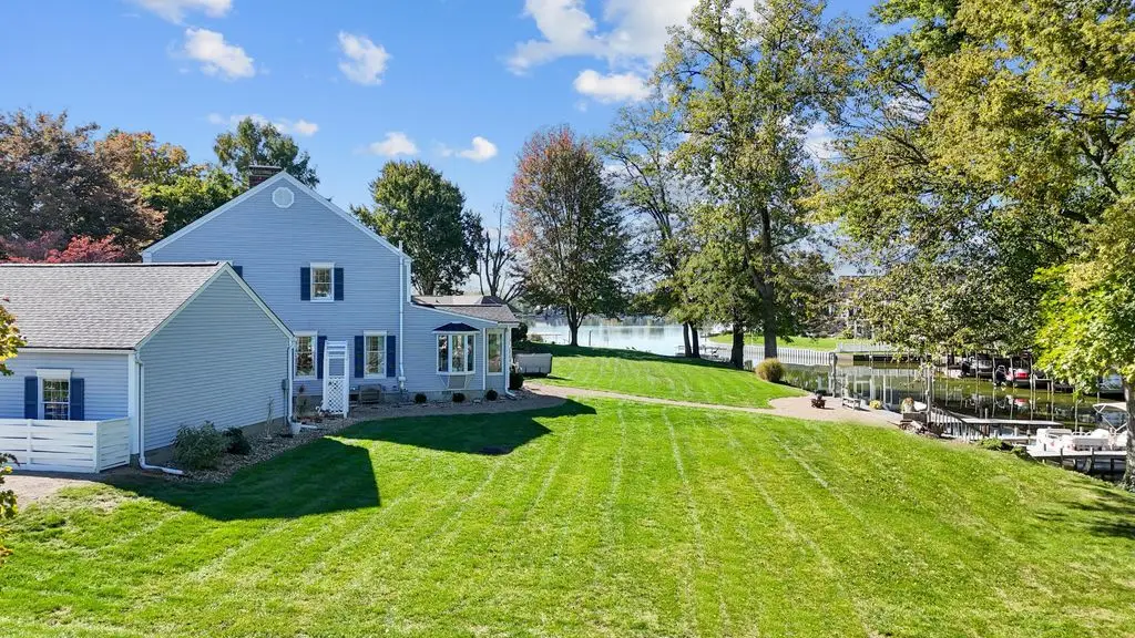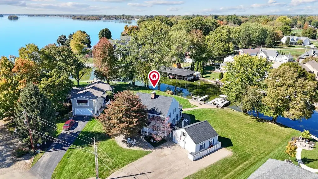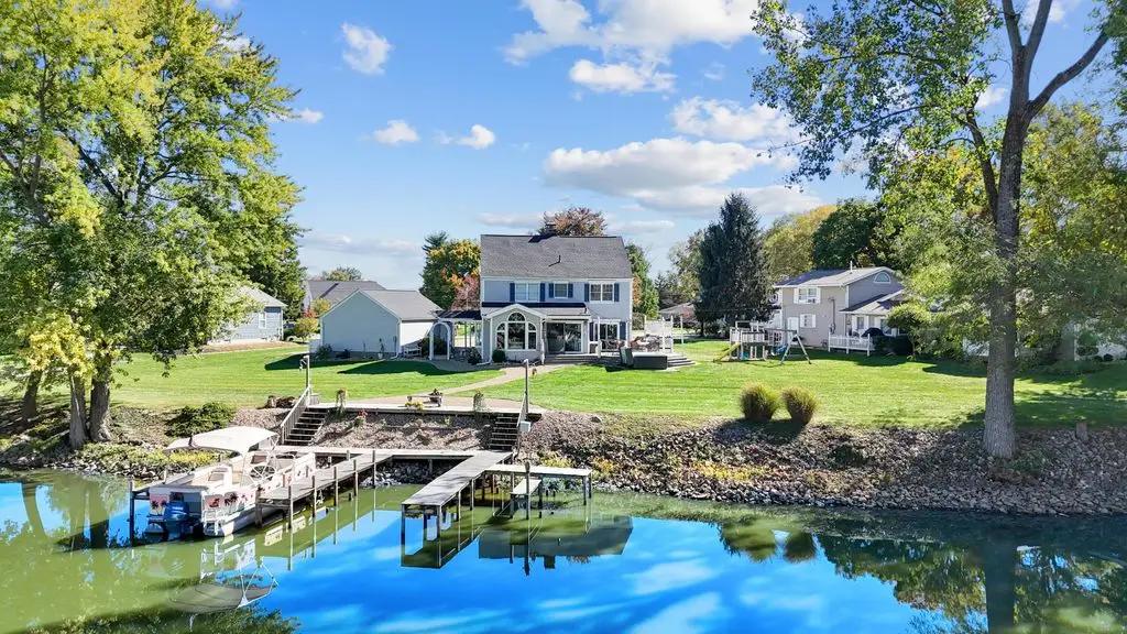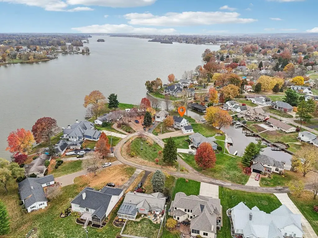 Beautiful waterfront home in desirable Harbor Hills. Located on a quiet circle off the main road. Multiple parks, a beautiful 9 hole golf course, and tennis/pickleball courts make this a great neighborhood. This 2,500 square foot four bedroom, 2.5 bath home sits on a double lot and has 200 feet of water frontage with multiple docks. The living room opens to the large kitchen area with access to the back deck and 180-degree views of the water. The family room connects to a quaint pub area that also leads out onto the large rear deck. Hardwood on the main level. Upstairs you will find four good-size bedrooms with updated carpet and paint. The owners suite has hardwood floors as well. A partial basement and crawl are in the lower level. A detached oversized two-car garage and plenty of room for parking.