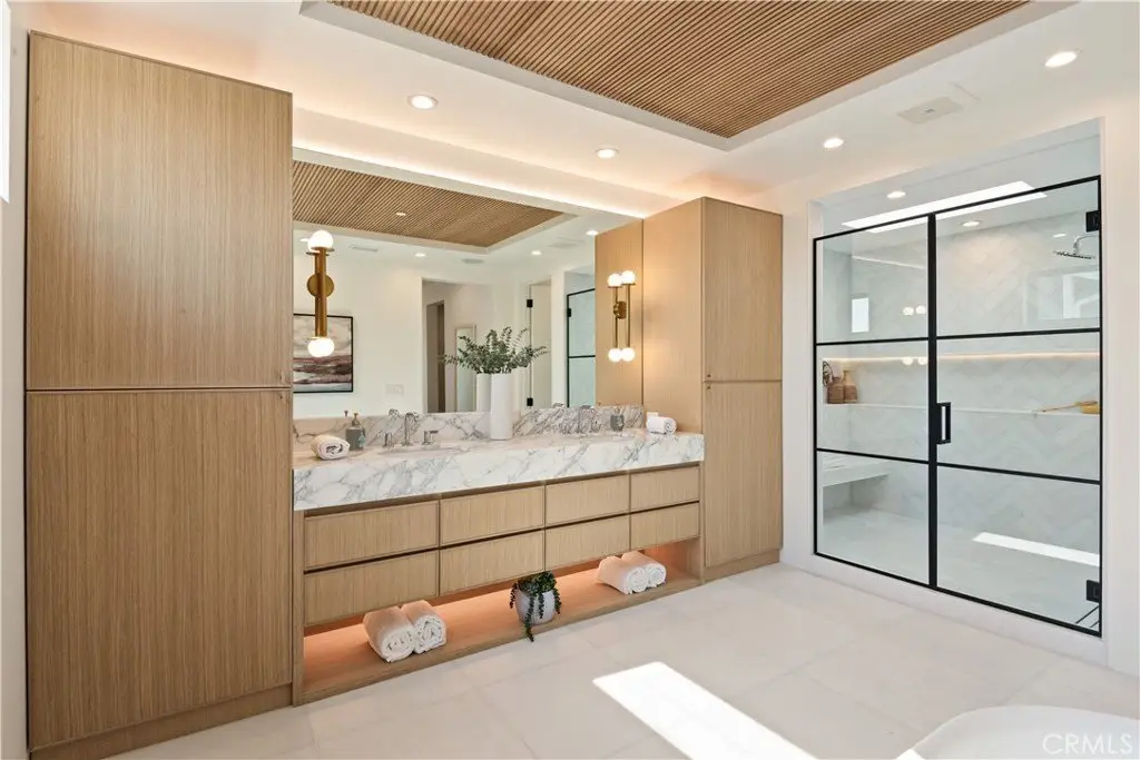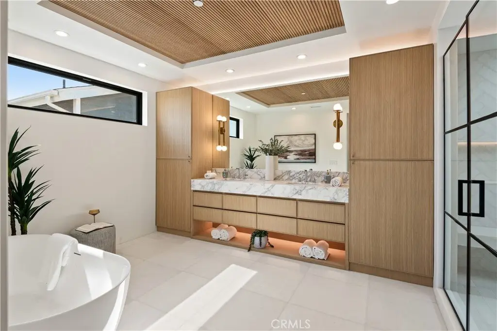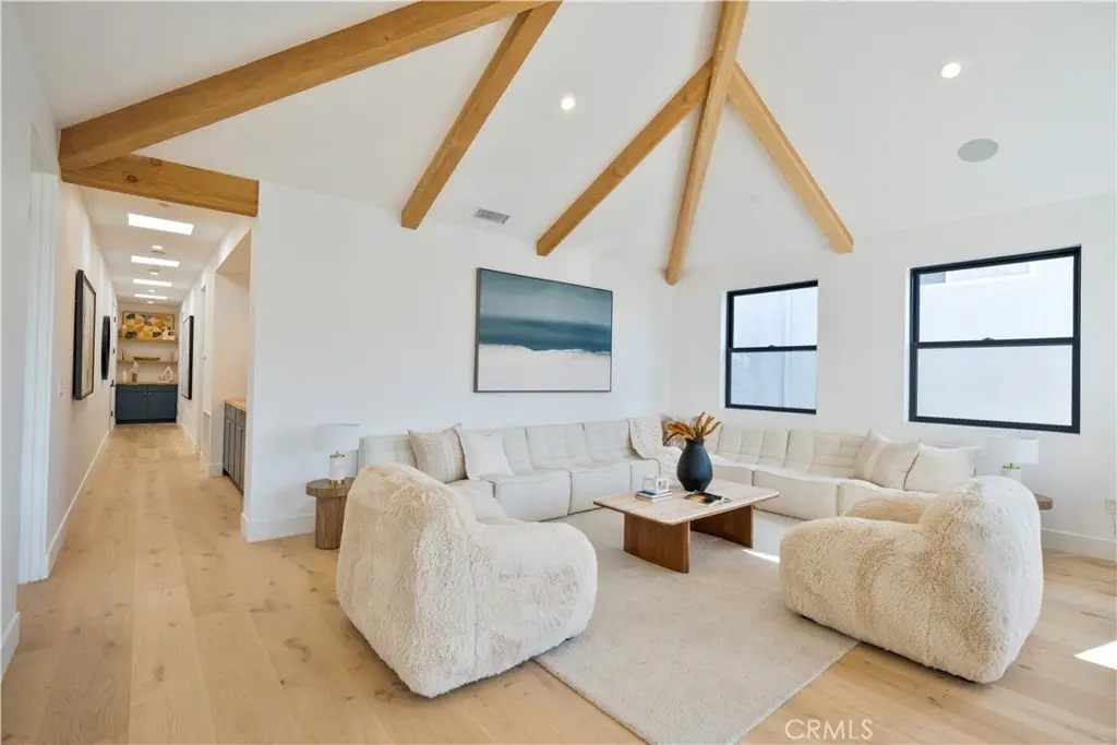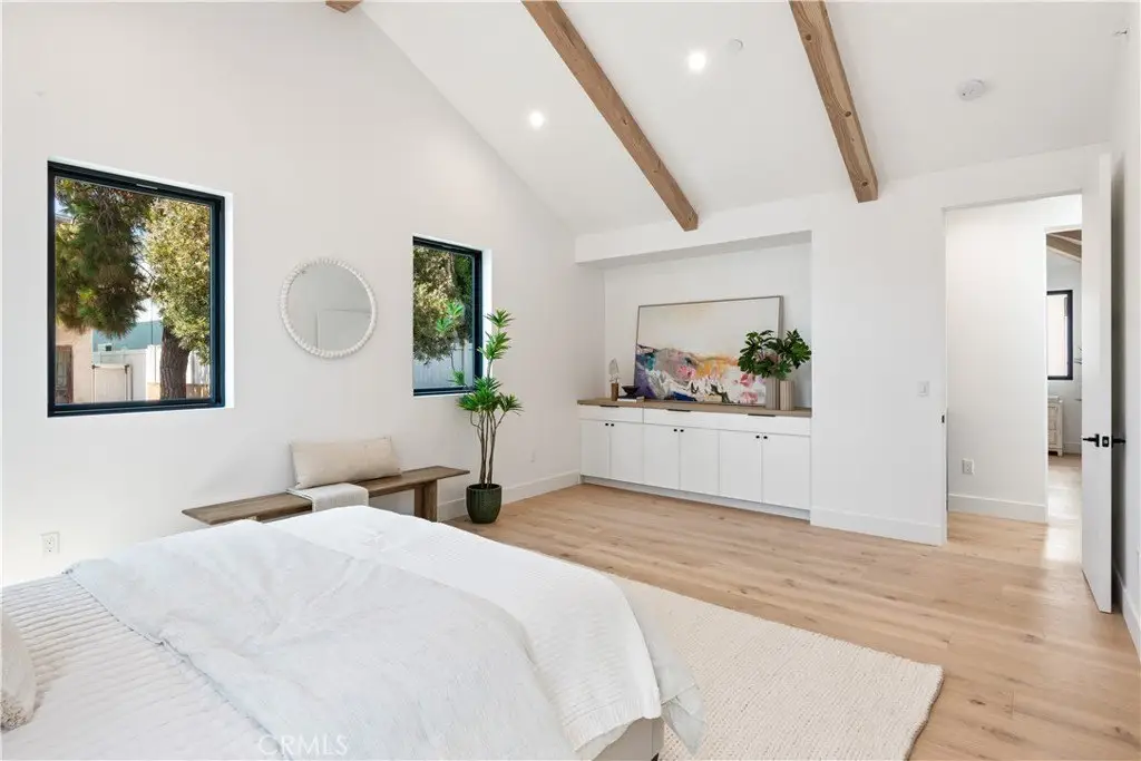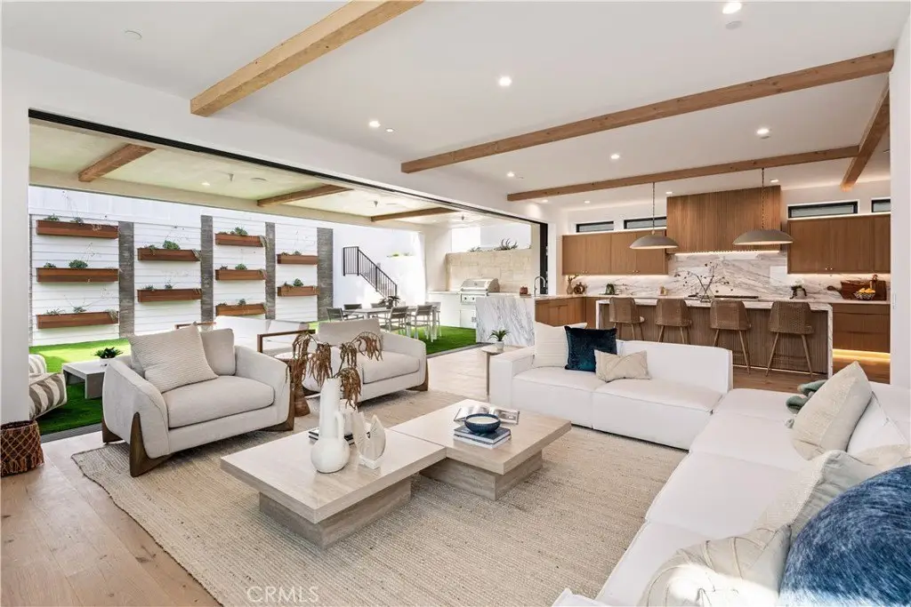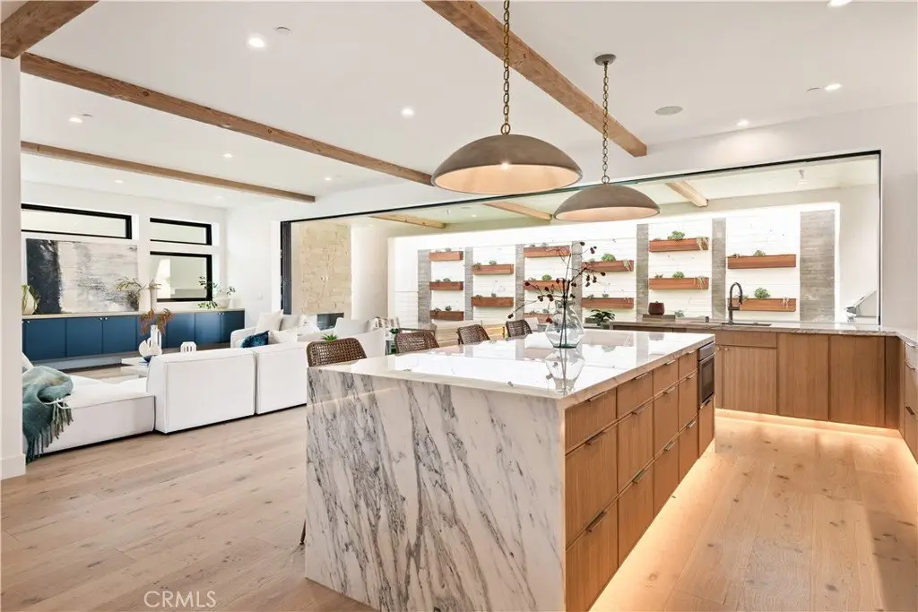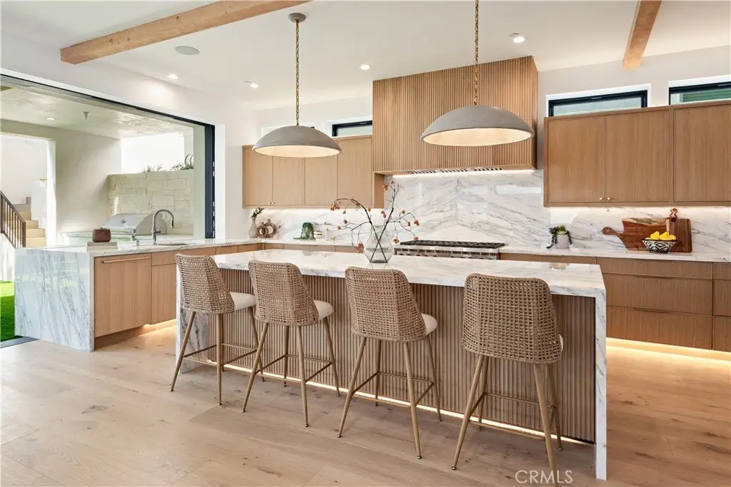 Wake up to soft ocean breezes drifting through your home as the day unfolds. A 28-foot Fleetwood sliding glass wall opens entirely to your private backyard, creating a seamless indoor-outdoor environment ideal for entertaining. The glass wall continues as a sliding window that pockets away, transforming into a countertop bar that connects your kitchen directly to the built-in grilling station outside—perfect for effortless gatherings and sunset dinners with friends. Inside, a 10-foot Arabescato Belgia marble island anchors a chef’s kitchen equipped with a 48-inch Wolf range, Sub-Zero refrigeration, and custom cabinetry, blending functionality with refined design. The open-concept layout flows beneath 10-foot ceilings with sand-blasted Douglas fir beams, complemented by wide-plank white oak floors and designer lighting throughout. Upstairs, the primary suite features a 12-foot glass wall that opens to peekaboo ocean breezes, while the spa-inspired bath offers a freestanding soaking tub, a glass walk-in shower with a bench and skylight, and dual walk-in closets ready for your personal touch. Each bedroom includes its own en-suite bath and either a built-in or walk-in closet, providing comfort and privacy for family and guests. Modern living is made seamless with smart home features including WiFi access points on every floor, a Ring security system, Nest climate control, and Cat6 wiring throughout for blazing internet speeds. Solar panels paired with a Tesla battery pack provide energy efficiency, while a 2-car garage with a 40-amp EV charger ensures practicality meets lifestyle. Blending Scandinavian modern elegance with coastal California ease, this newly constructed East Hermosa residence is crafted for those who value intentional design, warm contemporary style, and a connection to the vibrant beachside community around you. When you buy here, you are buying a lifestyle.