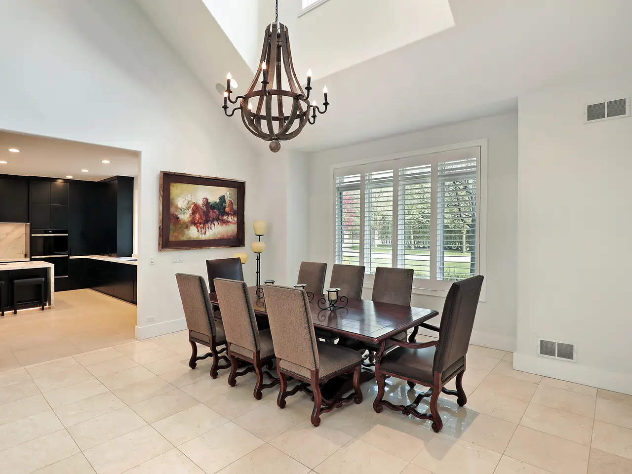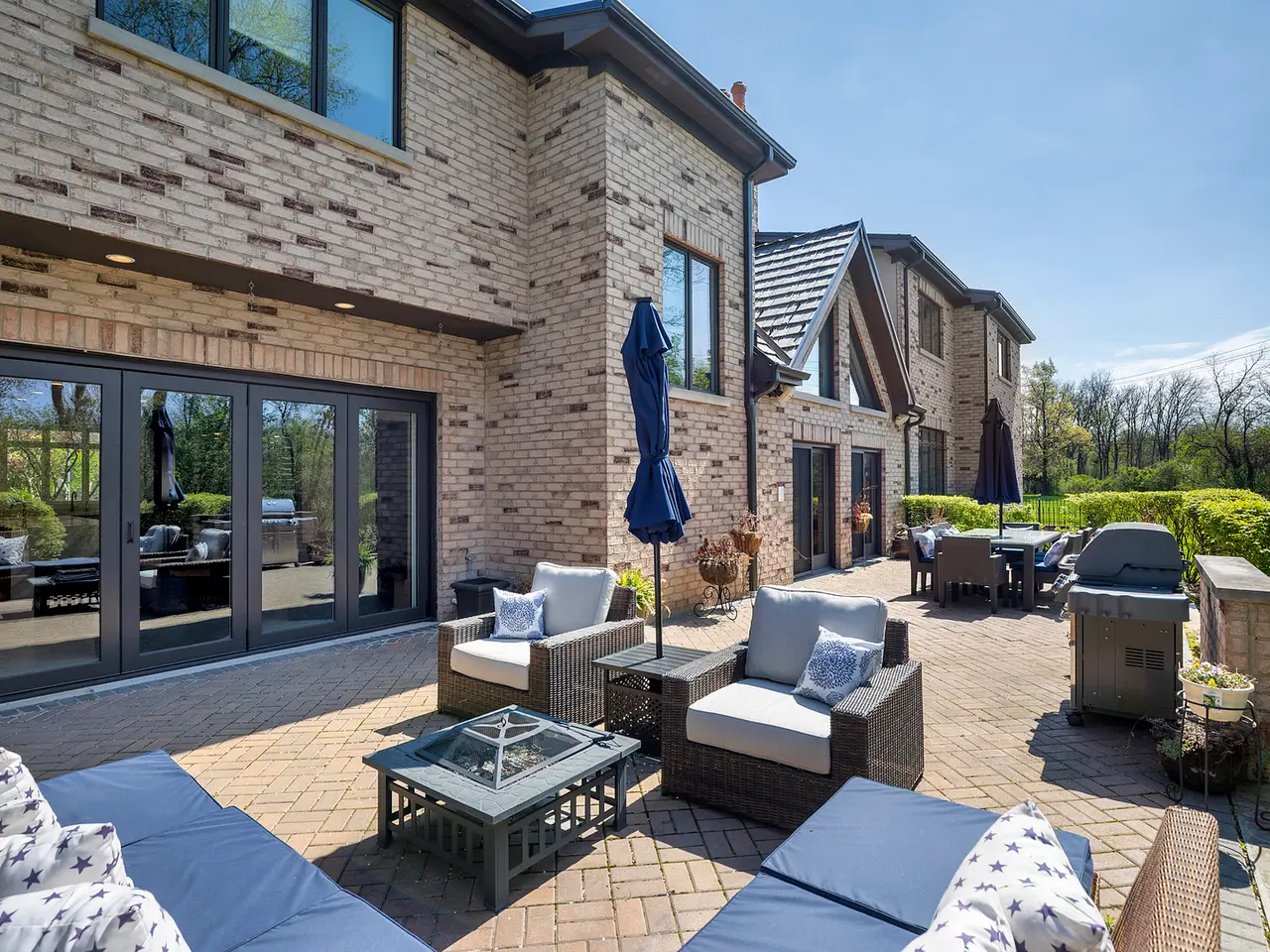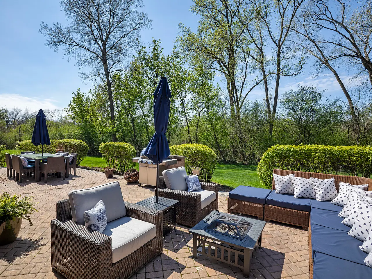 Magnificent stone and brick masterpiece that rests on just under a spectacularly landscaped 1.5 acres. This elegant home lives like a ranch and was designed for entertaining from the inside out. First floor Master suite complete with sitting room, fireplace, wet bar, large WIC, spacious bath with double sinks, steam shower, granite counters and gorgeous views of the prairie. The newly remodeled kitchen was completed in 2023 with marble counters that go on for miles, stunning black cabinets with truly all the storage one may desire, two dishwashers & sinks, high end appliances and a wine fridge that is the focal point of the room as well as a sitting room where you'll find a floating FP and sliding glass doors that lead out to the patio and fire pit. Upon entering the gracious foyer you come to the great room featuring soaring ceilings, a beautiful marble wet bar, a wall of windows with beautiful and an exquisite double sided fireplace. 2nd floor has 5 bedrooms all en suite, plus an enormous bonus room perfect for a playroom, office or additional family room. The lower level offers what we all dream of. An inviting wet bar with kegerator for beer on tap, theater area for watching movies or sporting events, a gym, sauna and lavish additional full bath. Other amenities to take note of are a brand NEW roof, gutters and downspouts done in 2024, two new furnaces and A/C units, completely rebuilt staircase leading up to the 2nd floor with dramatic walkway also redone in 2020 along with magnificent front entry doors. Additionally you'll find a heated 4 car garage, underground sprinklers, gated entry, brick driveway and newly remodeled mudroom with heated floors. This exceptional property allows for other amenities such as a pool, tennis or sport courts. While close to schools and Hwy 41 this one of a kind estate is conveniently located between HP and DF giving you an ideal location yet is privately situated giving one the option for total privacy. A very special home.
