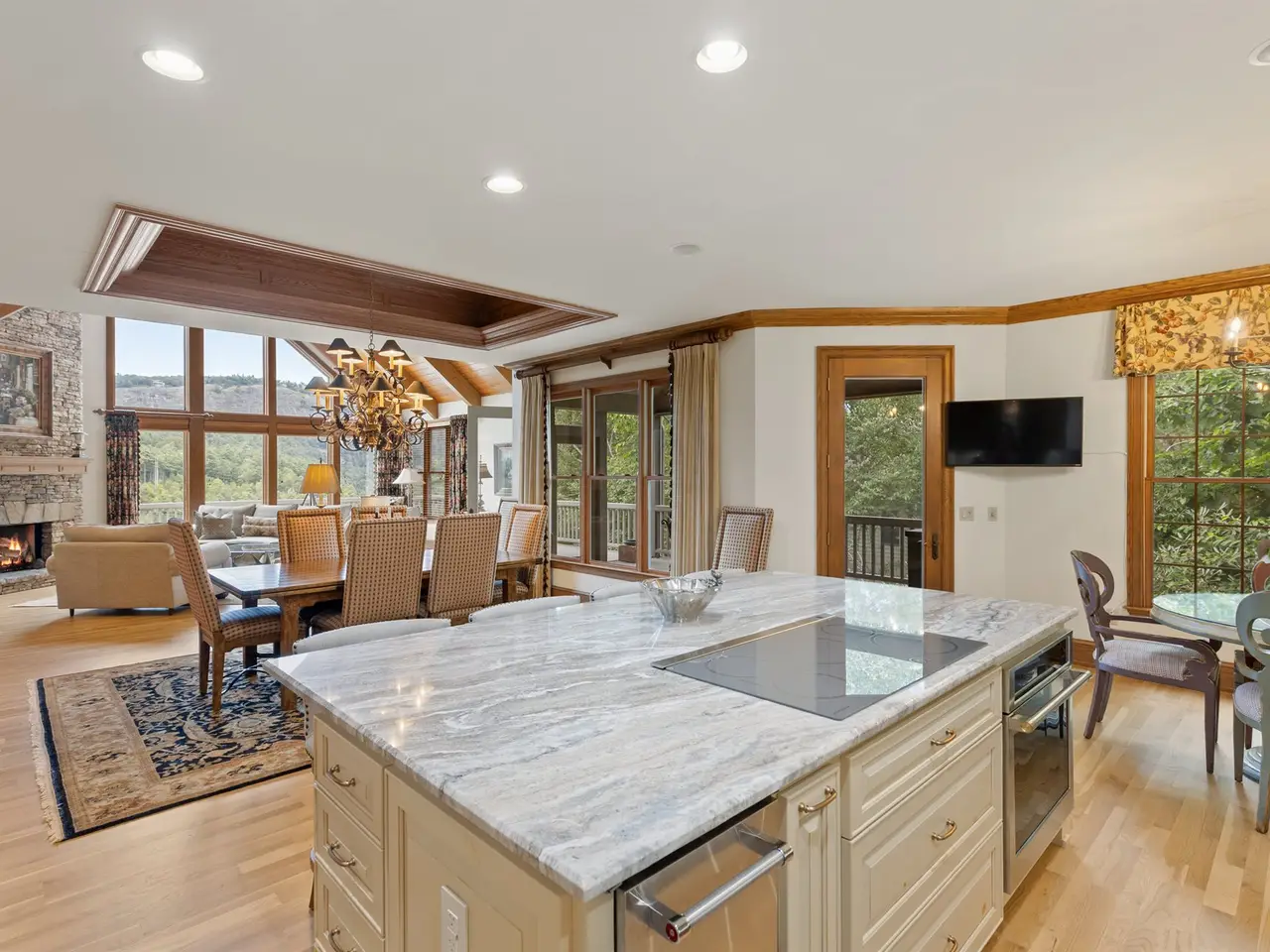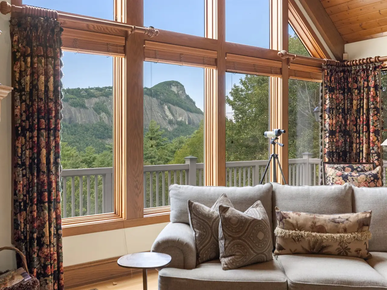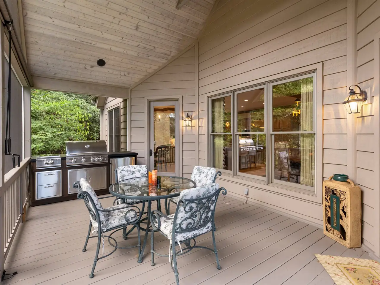 This is the panoramic BIG VIEW! Prepare to be captivated by sweeping, unobstructed views of iconic Whiteside Mountain from this stunning Highlands Falls Falcon Ridge residence, a home so remarkable it has been featured twice in Architectural Digest. Designed with generous proportions and effortless flow, the home offers main-level living with the primary suite conveniently located on the entry level. Architectural details abound, highlighted by custom wormy chestnut and oak features throughout, including an impressive 3? solid wormy chestnut entry door. The primary suite commands breathtaking mountain views and sunrises and boasts a lavish Italian marble bath with soaking tub, oversized shower, dual lighted mirrors, hidden lighted vanity, Kohler fixtures, custom walk-in closets, and a private wet bar with sink and mini-fridge. The open-concept living, dining, and kitchen spaces flow seamlessly onto a screened porch with a fully outfitted grilling station featuring a Blaze grill?an entertainer's dream with Whiteside Mountain as the backdrop. The main level also conveniently includes a guest bedroom, full bath, office/den with custom glass paned wormy chestnut and oak door, and a full laundry room with sink. The lower level provides for guest privacy with a second living area with fireplace, private deck, two spacious en-suite bedrooms, powder room, bonus/flex room with gym/playroom potential, and a secondary laundry area. Recent upgrades are extensive, including a remodeled kitchen, refinished hardwood floors, 27 new windows, new roof, gutters with guards, encapsulated crawlspace, repaved driveway with focal pavers, updated HVAC systems, new water heaters with recirculation pump, blown-in attic insulation, new gas logs in main level fireplace, and view clearing to fully showcase dramatic views of Whiteside Mountain, Wildcat Ridge, and Cullasaja Club beyond. A drainage system beneath the upper deck ensures protection for the lower-level outdoor living area. Peace of mind comes with a 500-gallon fresh water reserve tank and a whole-house generator. A two-car garage with workshop, along with a welcoming exterior accented by a serene water feature, completes this mountain sanctuary. This Highlands Falls home is more than a residence?it is a retreat of timeless architecture, meticulous updates, and awe-inspiring views. Membership to Highlands Falls CC is not mandatory but the amenities are tremendous and the club is vibrant.