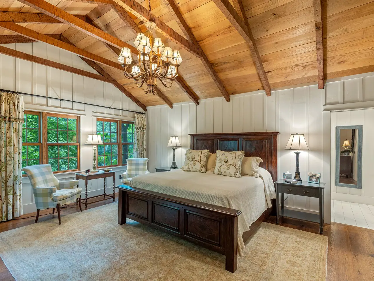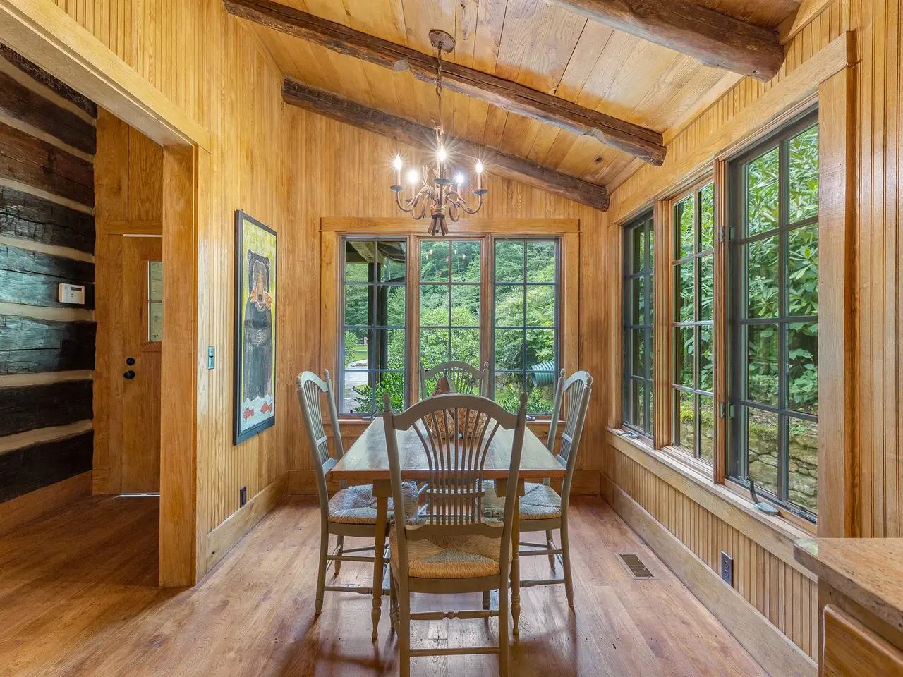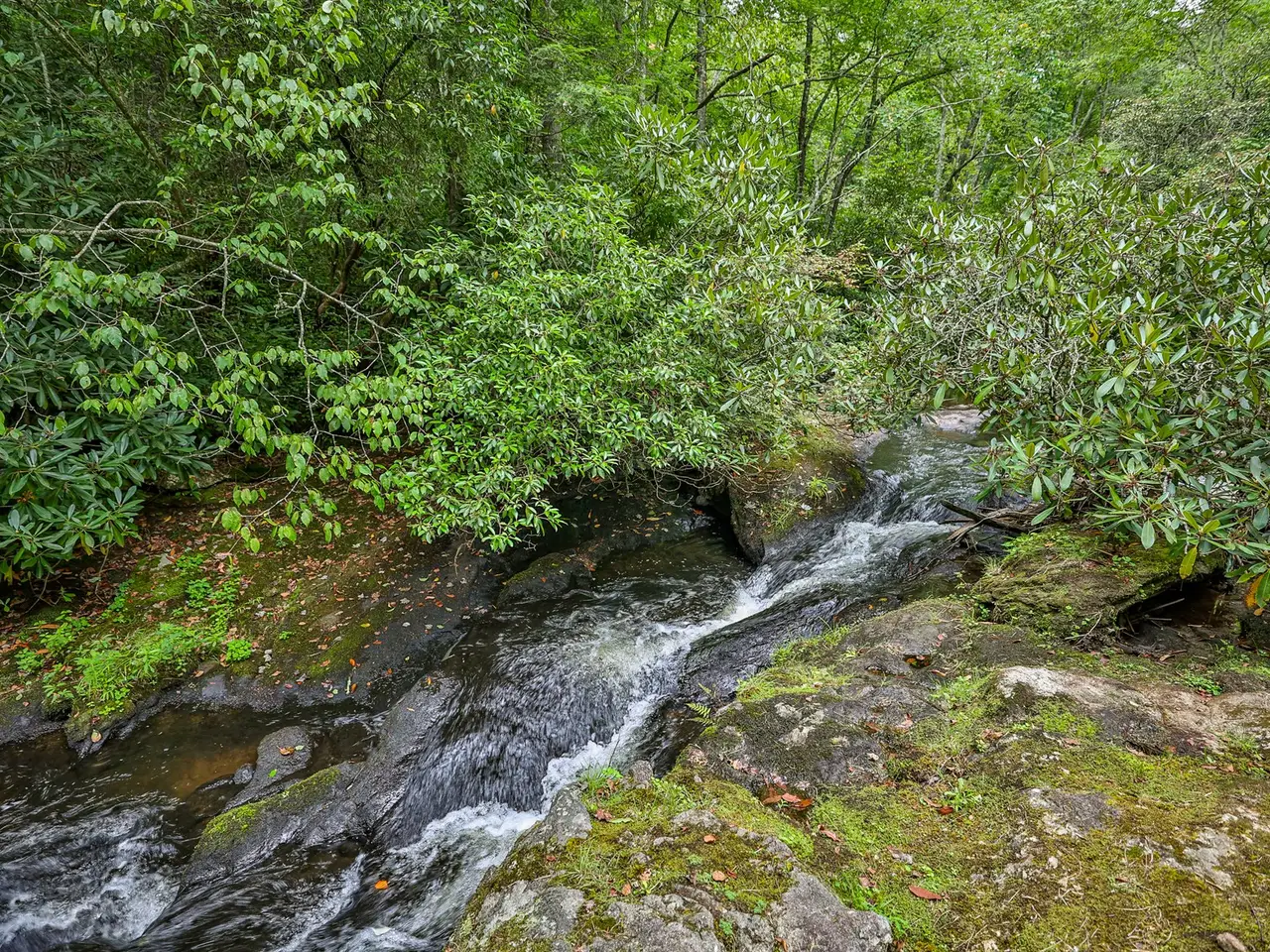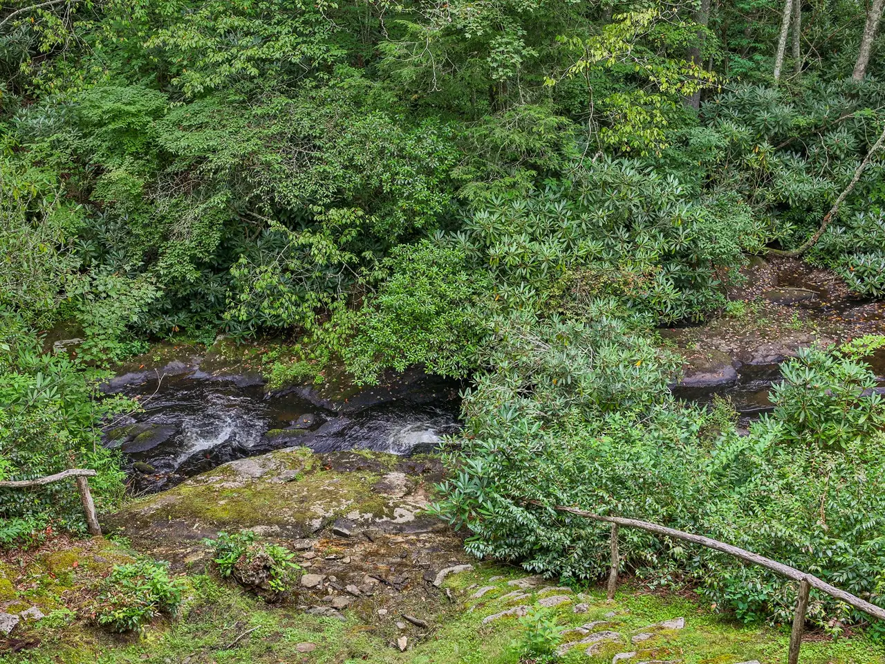Discover the quintessential Highlands home, masterfully crafted by renowned local builder Tommy Chambers and completed in 2010. This four bedroom, 5.5 bathroom masterpiece showcases the unparalleled charm of antique Pennsylvania timbers, seamlessly blending historical character with modern amenities. Nestled on 1.82 private acres, the property overlooks the picturesque Big Creek and waterfall, whose soothing sounds can be enjoyed from each of the home's seven covered porches. A large family can sleep 10 easily and still have privacy. Inside the home, you'll find three extraordinary stone fireplaces, constructed from locally sourced boulders uncovered during construction, adding a rustic elegance to the space. Additionally, there is another fireplace on the lower level large porch. The expansive main level living room features soaring ceilings, a loft, and a grand fireplace, with direct access to a covered porch that offers breathtaking views of the cascading creek and waterfall. The kitchen features a breakfast area, sub-zero refrigerator, hard surface countertops, a high-end double oven gas range with griddle, grill, heat lamps and exhaust. The main level primary bedroom is a tranquil retreat, complete with a beautiful fireplace, vaulted ceilings, and a large private porch. Each spacious guest bedroom includes an ensuite bath and its own private covered porch, ensuring comfort and privacy for all. Though this home is conveniently close to town, it offers a serene escape from the world, where history, craftsmanship, and natural beauty converge. Adding to its allure, the property is just moments away from the upscale SkyLine Lodge and Oak Steakhouse, providing quick and easy access to a town favorite restaurant and bar. Experience the timeless allure and historical richness of this expertly designed home, where every detail has been thoughtfully crafted to create a sanctuary of peace and elegance.