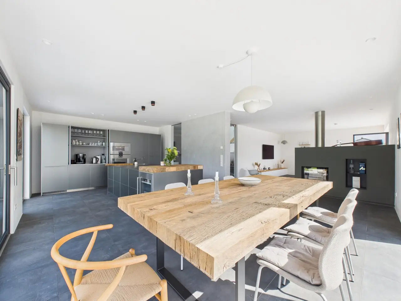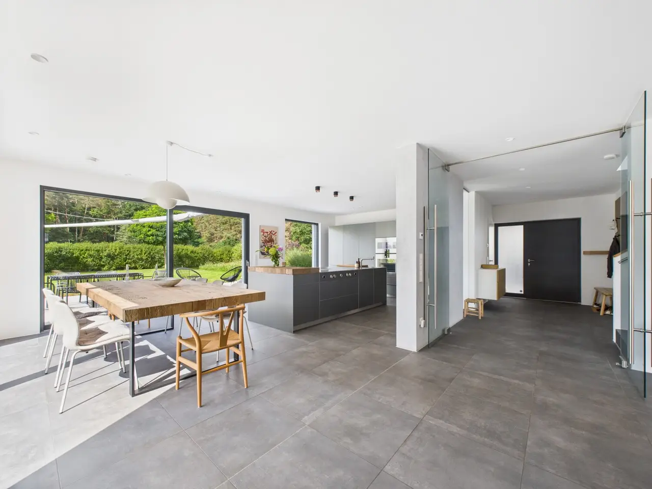A home that leaves nothing to be desired awaits in a quiet location on the edge of the forest in Hilpoltstein. The detached house built in 2019 combines modern architecture with a high level of living comfort, grandiose furnishings and offers everything future owners could want for a happy and relaxed life on around 200 m² of living space. The spacious plot of around 811 m² gives you plenty of green space and privacy - an ideal retreat where children can play undisturbed or adults can relax in peace. As soon as you enter, you are greeted by the bright entrance area with its open staircase and a friendly, light-flooded atmosphere. The entrance area leads to the center of the living concept, a high-end kitchen from Bulthaup with Gaggenau and Bora appliances. It flows seamlessly into the open-plan living and dining area - a meeting place where the family comes together and guests immediately feel at home. The wood-burning stove acts as a stylish room divider and ensures cozy hours on chilly evenings. The first floor is complemented by a practical office, a pantry and a guest WC. Three comfortable bedrooms await you on the upper floor - perfect for children, guests or a home office. A utility room and an additional children's bathroom with a walk-in shower add to the everyday comfort. The highlight is the spacious master bathroom: in addition to a floor-level shower, it boasts a free-standing Agape Spoon XL bathtub, which invites you to relax, and direct access to the master bedroom. Preparations are already in place for a sauna in the master bathroom. From the bed in the master bedroom, you can enjoy a unique and unobstructed view of the greenery. The basement is suitable for living purposes thanks to its bright design, vinyl flooring and underfloor heating. The three rooms open up a wide range of possibilities - whether guest room, office, playroom or hobby area. Storage and utility rooms ensure order and functionality. Outside, the house impresses with a concrete carport for two vehicles and generous storage space. The large south-west-facing terrace is paved with Godelmann tiles and fitted with a high-quality awning. Here you can enjoy sunny afternoons, relaxed evenings with the family and convivial barbecues with friends. The unobstructed and unobstructed view towards the meadow and forest as well as the absolute peace and quiet ensure relaxation and privacy. The house not only impresses with its architecture and furnishings, but also with its pioneering energy balance. With energy efficiency class A, it meets the highest standards for modern, sustainable living. The combination of modern gas condensing technology, underfloor heating throughout and a powerful solar and photovoltaic system with storage ensures a particularly energy-efficient heating and electricity concept. For the residents, this means: pleasant warmth in all rooms, a noticeable reduction in ancillary costs and at the same time a good feeling of living in a property that combines environmental awareness with comfort. Families benefit twice over - from calculable energy costs in the long term and a home that is already prepared for the demands of tomorrow. If you require further information or would like to arrange a viewing, please do not hesitate to contact us!