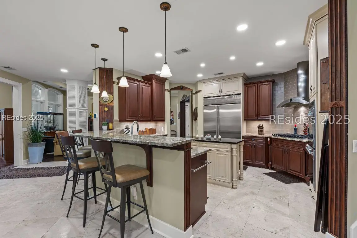 Beautiful custom home on a large cul-de-sac homesite in Long Cove, a highly sought-after community with a private 18-hole championship golf course. Enjoy panoramic lagoon-to-golf views from the open deck, complete with a mosquito misting system and built-in outdoor grill perfect for entertaining or enjoying dinner outdoors. This elegant home features travertine and hardwood floors, granite countertops, top-tier stainless steel appliances, and a center island in the kitchen. Vaulted ceilings enhance the spacious living and family rooms. A wet bar with lighted cabinets and a wine cooler adds to the homes entertaining appeal. The primary suite offers stunning views, a large bath with walk-in shower, and custom closets. Two guest bedrooms are located on the main level, including one in a private split layout. A full guest suite upstairs is ideal for visitors or extended stays.