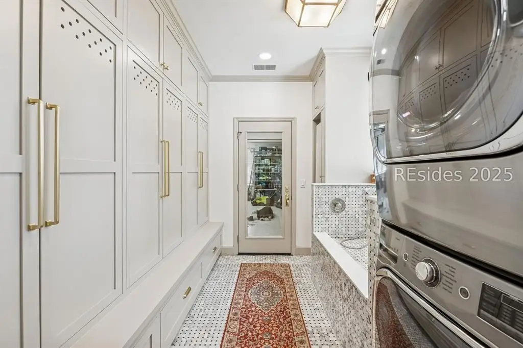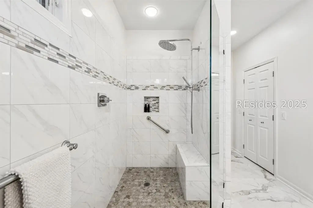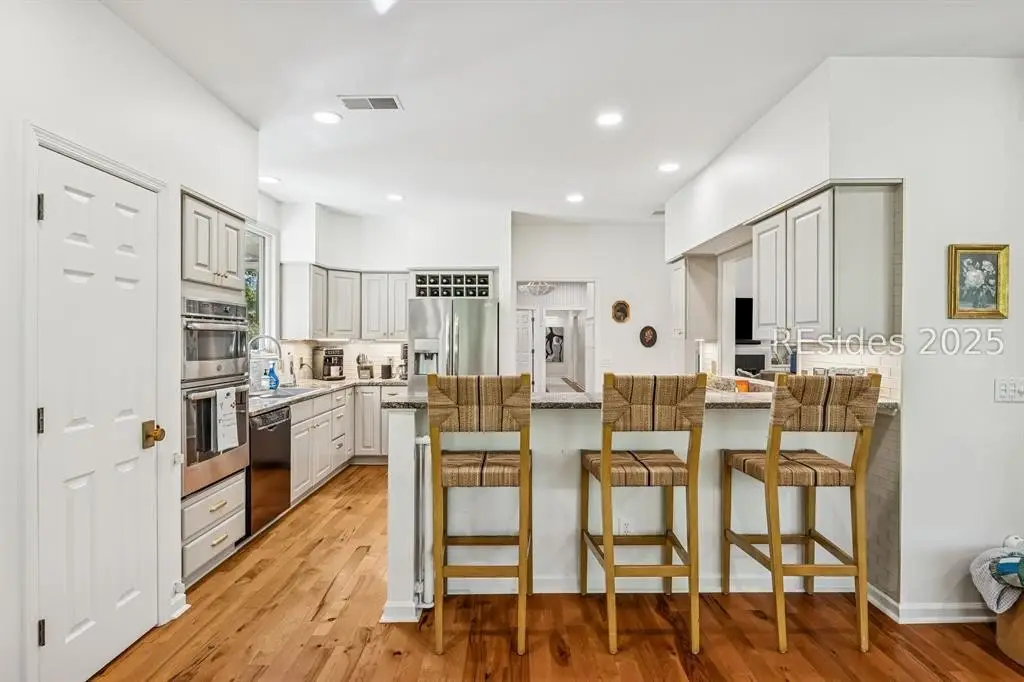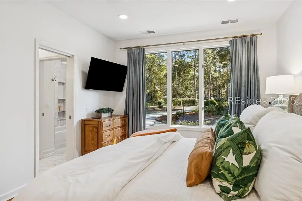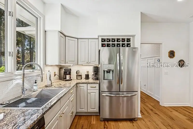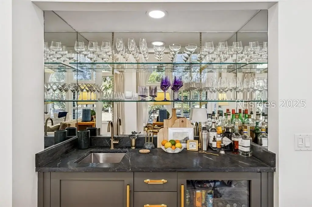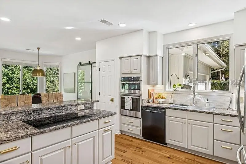 RARE OPPORTUNITY...beautifully remodeled residence with delightful curb appeal and triple fairway views (#6,8,9 North Course) in private, amenity rich Moss Creek! High end interior features include smooth volume ceilings, wood flooring, granite & soapstone counters, custom millwork (wainscoting/crown molding/baseboards) & built-ins (wall units/cabinets/shelving/closets) by master craftsmen, shiplap accent walls, designer wall coverings/fixtures/hardware/lighting/window treatments (draperies & plantation shutters), custom lighting package (Lutron, recessed LED, mirror/wall mounted sconces, chandeliers/ceiling mount, under cabinet), wood burning fireplace w/herringbone tile hearth/surround, walls of windows to view, new interior & front doors including glass/metal framed barn door, stylishly appointed wet bar w/ beverage frig, max storage space including floored attic w/energy saving spray foam insulation. Floor plan offers Kitchen (high quality appliance package) w/breakfast bar, open to formal/casual Dining, Carolina Rm, Great Room + Powder Rm & A+ Laundry Rm (basketweave marble tile surround Dog Bath & floor, wall of soft close cabinets/drawers, LG W/D & built-in clothes steaming system) & oversize 2 car Garage . Luxury abounds in primary BR suite with expansive BR, dual walk-in closets w/built-ins & stunning 5 STAR Bath (30" porcelain tile flooring, custom vanity & huge glass/tile surround walk-in shower, water closet, etc.). 2 ample Guest BR's with impressive guest Bath (mosaic tile flooring, granite counter & marble tile surround tub/shower). Exterior offers oversize lot, private rear patio, quiet cul de sac street, landscape & carriage lighting, mature plantings, lawn, specimen trees, fenced service area & irrigation system. All centrally located close to community amenities & just minutes to HHI beaches and historic, waterfront Old Town Bluffton!