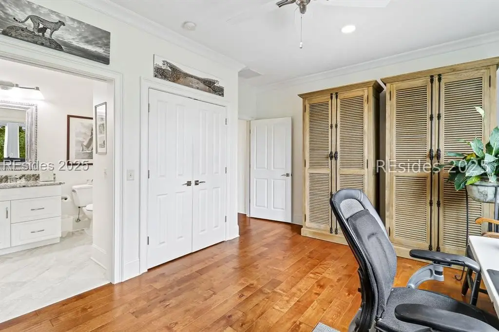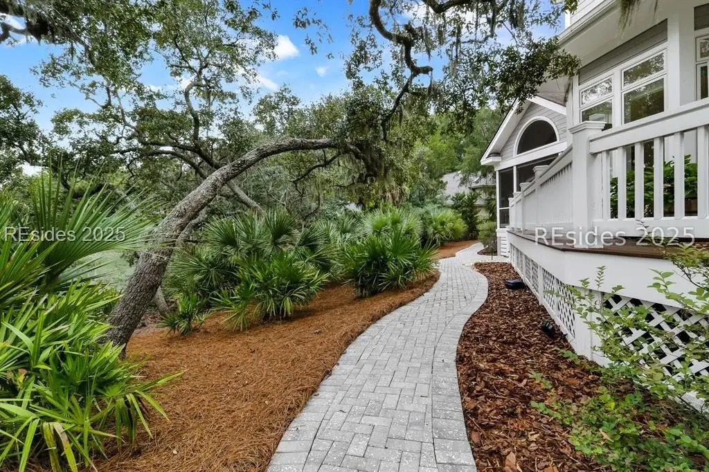 RARE OPPORTUNITY! Experience miles of panoramic tidal marsh & deepwater views with this 2015 built residence by renowned custom home builder in private, amenity rich Moss Creek. Interior features/recent improvements include wood flooring, 10-20 vaulted/tray/coffered ceilings, 8 interior doors, millwork & extensive built-ins by master craftsmen, granite counters, designer curated fixtures/hardware/lighting/window treatments, 2 gas fireplaces, walls of windows (w/transom windows) to view, stainless steel appliance package, spray foam insulation, imressive storage space including walk-in attic, closets & garage w/extensive built-ins. Very livable floor plan offers island kitchen open to dining & great room, walk-in pantry, much desired screened porch, bonus/media rm, office/den (4th BR), powder rm, laundry/mud room, ample/well-appointed guest BR suites & expansive/private primary suite with updated 5 Star bath, large walk in closet + multi-purpose flex room. Exterior offers attractive/durable Hardie board siding, charming covered front porch, all new front yard & plantings, extensive rear decking & brick paver walkway, must have fenced dog run, low voltage path & uplighting, majestic live oaks & pebbled walkway to secluded marsh front firepit. All sited on high elevation, quiet/private, end of cul de sac lot with Blue Heron Sanctuary to front and preferred southeastern exposure to rear offering excellent natural light, picturesque sunrises, and stunning, shaded late afternoon/evenings great for relaxing and entertaining friends and family. This is the home you've been dreaming about...