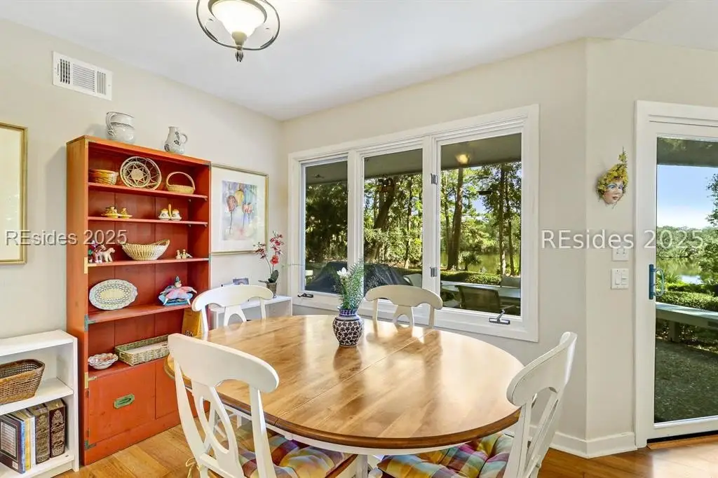 Rare opportunity to experience daily breathtaking panoramic views across much desired Blue Heron Sanctuary in amenity rich, private Moss Creek! Interior features in this impeccably maintained residence include soaring, vaulted/tray ceilings, floor to ceiling walls of windows to view, teak wood flooring, custom cabinetry/ built-ins/millwork, fireplace, granite & solid surface counters & designer fixtures/hardware/lighting. Very livable floor plan boasts impressive Great Rm, Island Kitchen open to Casual Dining & Carolina Rm, Dining Rm, Laundry, Powder Rm, excellent BR separation, Den/Study adjacent well-appointed primary BR suite w/updated Bath, 2 ample guest BR suites & open staircase to 2nd floor Gallery with stunning views. Exterior offers oversize, high elevation, cul de sac corner lot with nature preserve in front, golf view to side (#7 North Course), maximum privacy, rear patio (with built-in seating) spanning almost entire rear of home, side load 2 car garage, majestic live oaks, new roof, mature lawn/plantings & large back yard gently sloping to waters edge and arguably the finest lake view on this highly sought, birders paradise, nature preserve. All with excellent curb appeal, super quiet locale, and prime eastern exposure in rear offering stunning sunrises across lake to rookery, boardwalk/tidal marsh, and shaded late afternoons/evenings for relaxing & entertaining friends. It will be love at first sight...