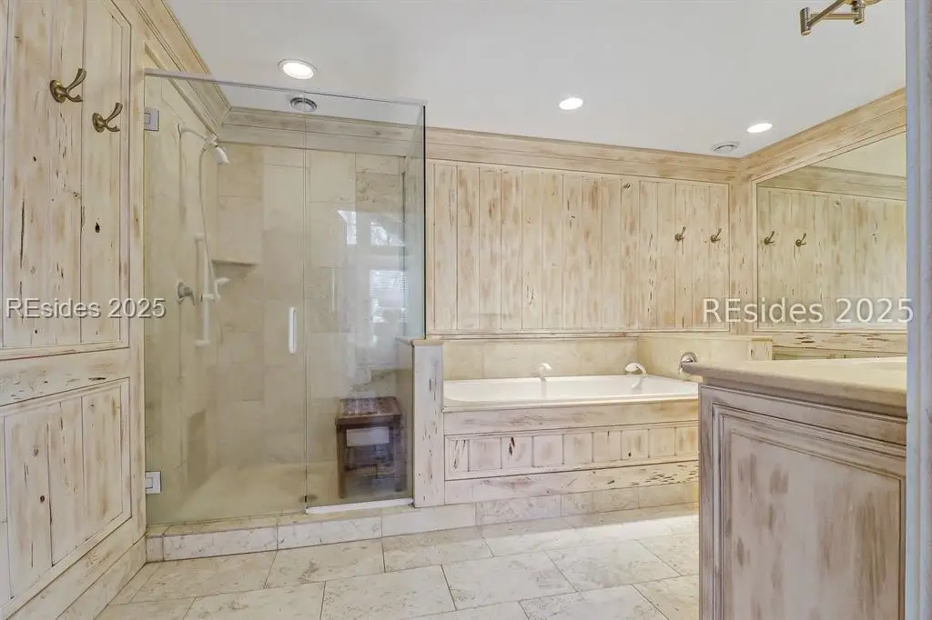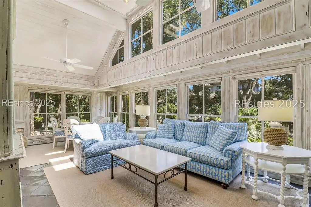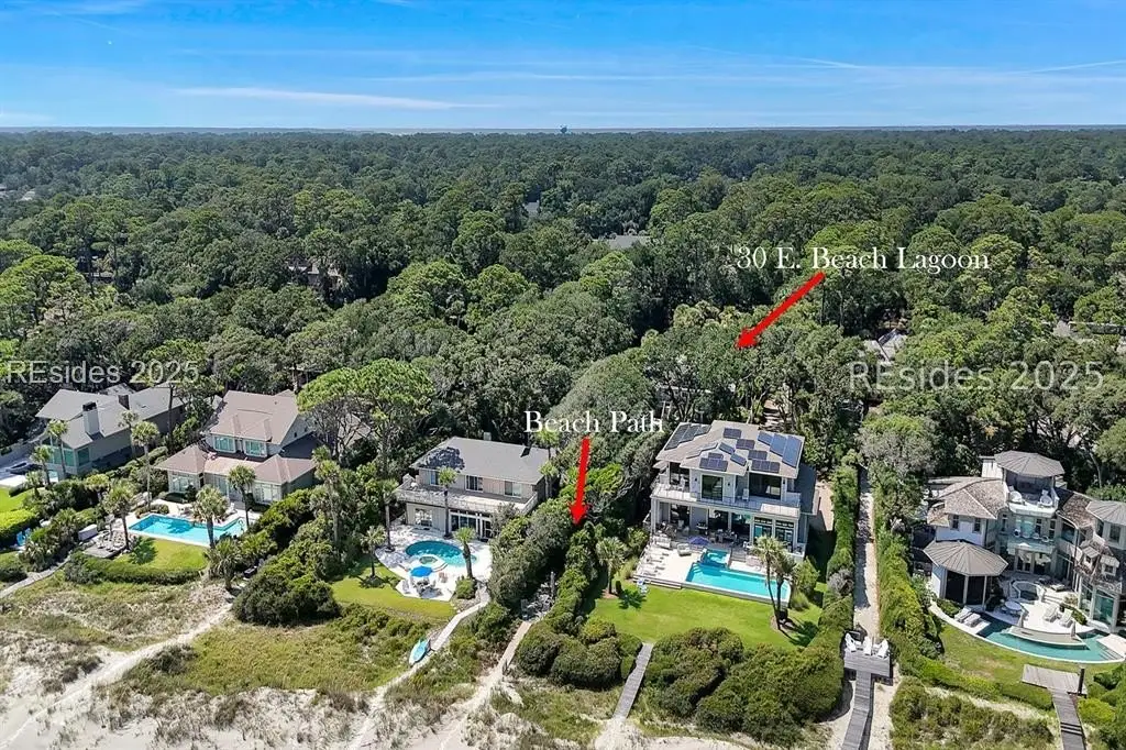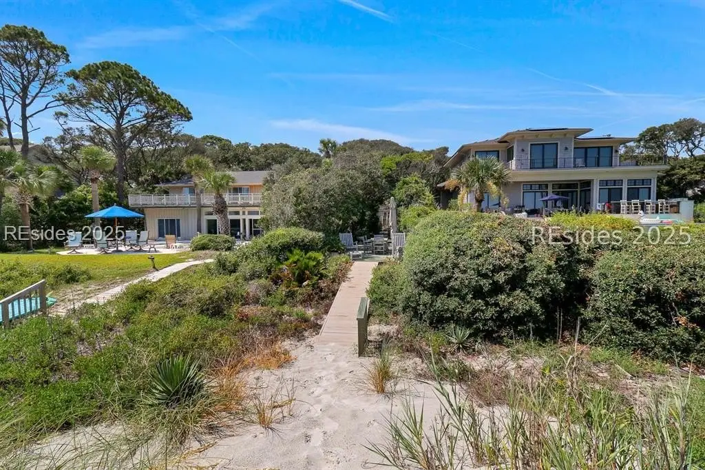 Welcome to 30 E Beach Lagoon, a stunningly remodeled oceanfront home located on one of Sea Pines' most prestigious streets. Rarely does a property blend luxury, charm, and location this seamlessly. Designed with timeless coastal elegance, this home offers an exceptional lifestyle with 5 bedrooms, 5 baths, and just steps from your private deeded beach access. Inside, soaring vaulted ceilings with exposed beams, a masonry brick fireplace, and wide-plank wood floors create a warm, inviting atmosphere. The kitchen features high-end natural wood cabinetry, sleek countertops, and stainless steel appliances ideal for entertaining or quiet mornings at home. The main house flows beautifully into a spacious living area filled with natural light, while the private, attached guest house offers flexibility for hosting friends or extended family. The primary suite features a private deck with peekaboo ocean views and easy access via the in-home elevator. Outside, enjoy your own private pool surrounded by lush, mature landscaping, creating a serene retreat that feels both secluded and coastal. The home also includes a two-car garage and has never been used as a rental, offering pristine condition and pride of ownership. Whether you're searching for a luxury second home or a high-performing short-term rental, 30 E Beach Lagoon delivers on all fronts location, design, and lifestyle all within the gates of Sea Pines Resort.