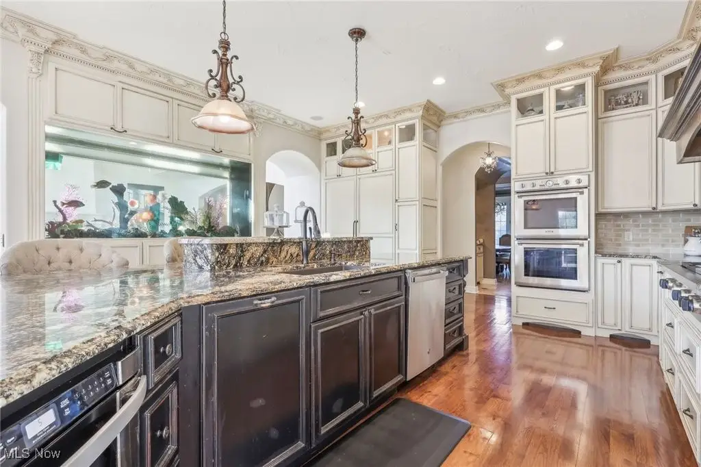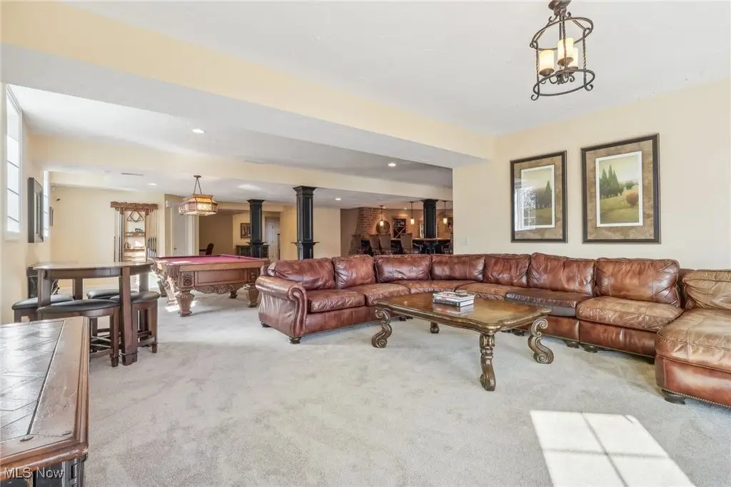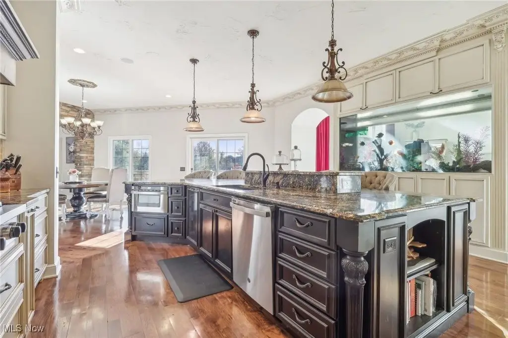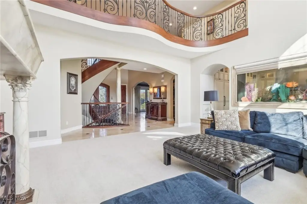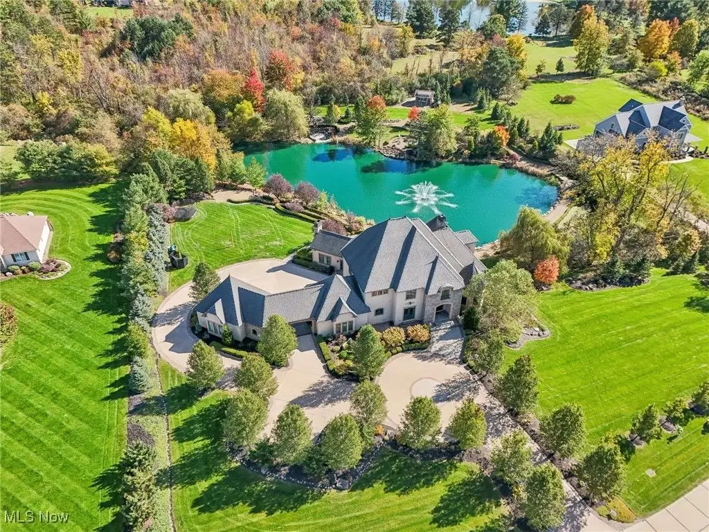 Nestled within a serene landscape, this custom-built home exudes elegance through meticulous craftsmanship & exquisite details. Upon entering you're greeted by a tremendous sweeping staircase, intricately designed woodwork, trim & molding that reflect the highest standards of artistry, spanning an impressive 7900+ sq.ft. Large pond is a picturesque centerpiece, highlighted by a soaring fountain, meandering walking path, sandy beach & charming she shed. These features transform the outdoors into a tranquil oasis. providing integration of indoor & outdoor living, dining & entertaining. Kitchen is chef's paradise, with two-tiered island, breakfast bar, high end appliances, & custom cabinetry blending functionality with style. Inviting hearth room w/ beamed ceiling & cozy wood burning fireplace all opening out to expansive terrace overlooking resort like grounds. Walk through pantry w/ ample storage & prep space lead to formal dining room w/ built in cabinets, buffet & French doors that open to outdoor courtyard for restaurant like dining. 2 story great room boasts stunning wall of windows framing breathtaking views allowing natural light to flood the space. Impressive fish tank serves as 2 sided centerpiece showcasing tropical & rare fish as serene focal point. Stunning library with decorative cathedral ceiling, rich wood built ins, & secret door to expansive primary bedroom w/ sitting area with terrace overlooking the pond. Spa-like bath, w/ walk-in shower, jetted tub & double vanities for ultimate relaxation. Convenient laundry on 2 levels. Upstairs you'll find 4 nicely sized bedrooms, 2 boast en suite baths & 2 share Jack n Jill, all with walk-in closets, ample storage & privacy. Walkout lower level is luxurious retreat featuring fully equipped bar with pizza oven, spacious theatre room, sizable workout room, 2nd office, full bath, billiards & rec area walking out to serene patio w/hot tub creating a peaceful escape. This luxurious home is truly one of a kind.